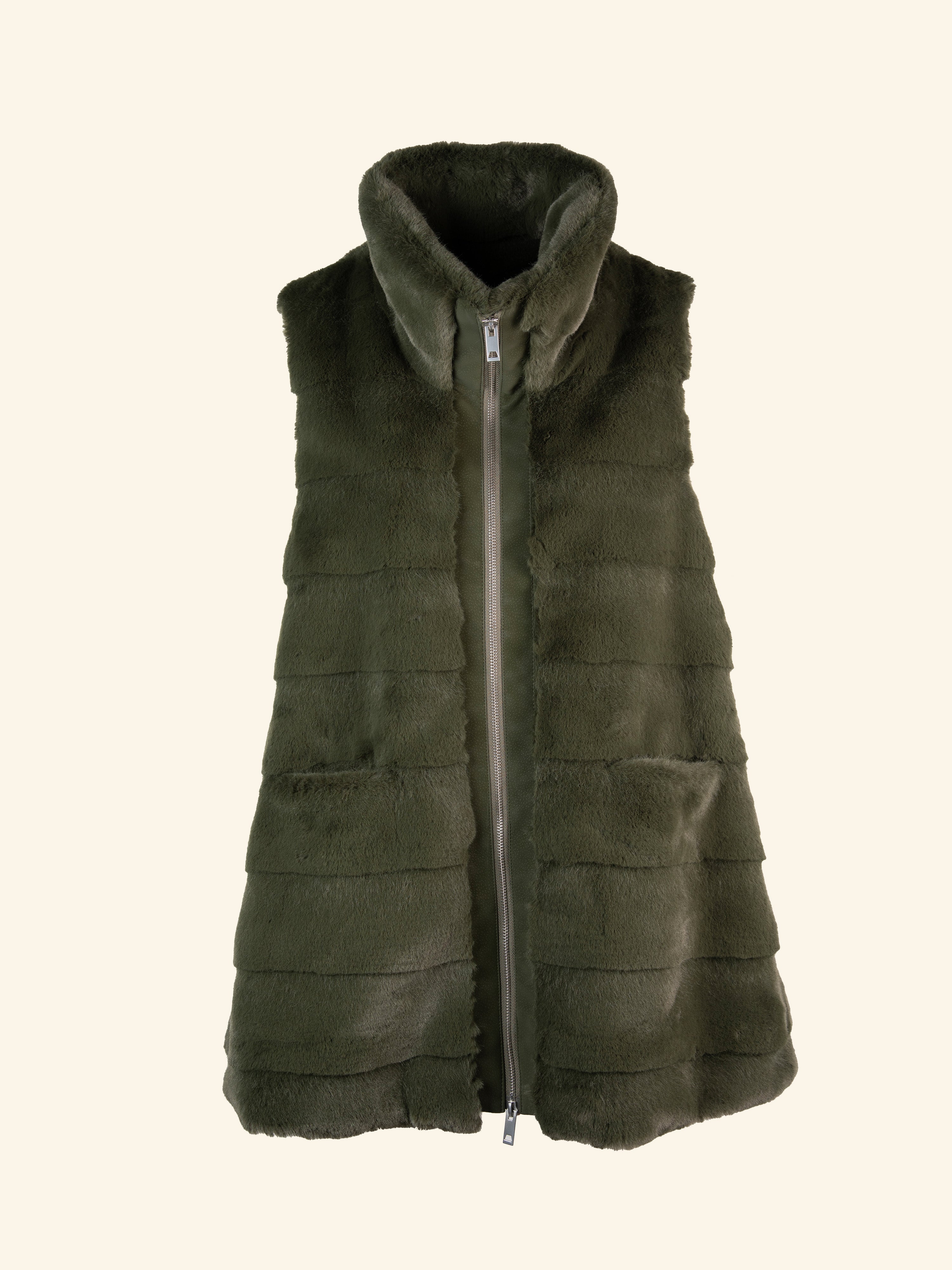 Entscheiden Sie sich für diese ärmellose Kunstpelzjacke, die Komfort und Stil vereint. Sein hoher Kragen und die lockere Passform sorgen für eine elegante Silhouette. Der Zweiwege-Reißverschluss und die Vordertaschen verleihen einen praktischen Touch.