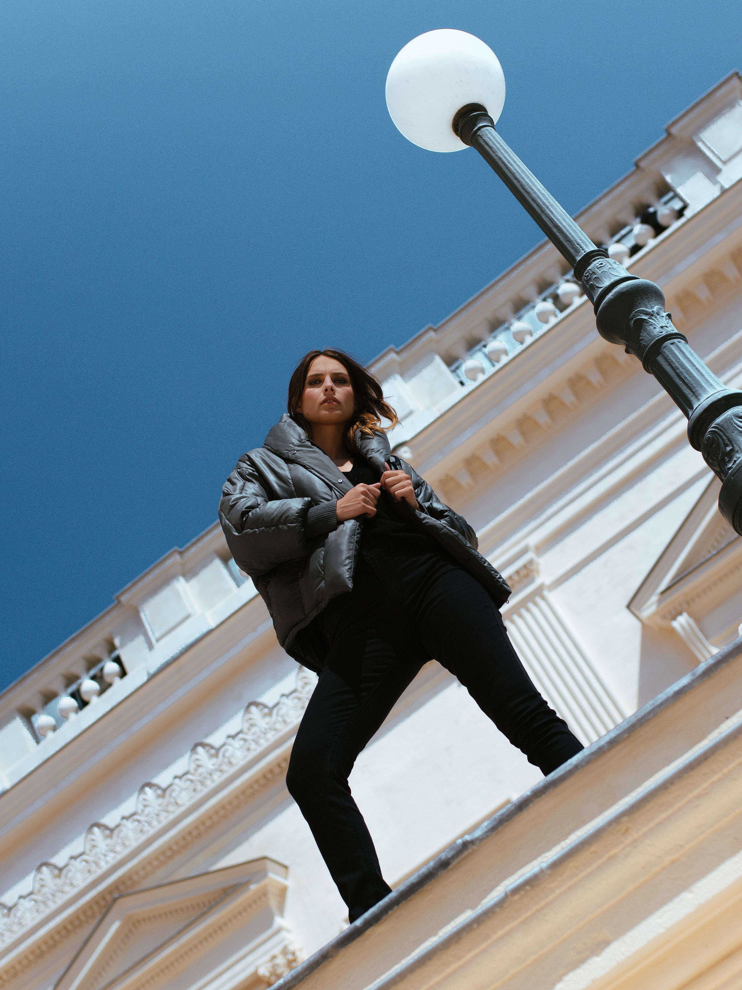 Lange Ärmel, Oberärmel aus Daunenjacke, Unterärmel aus Mesh.