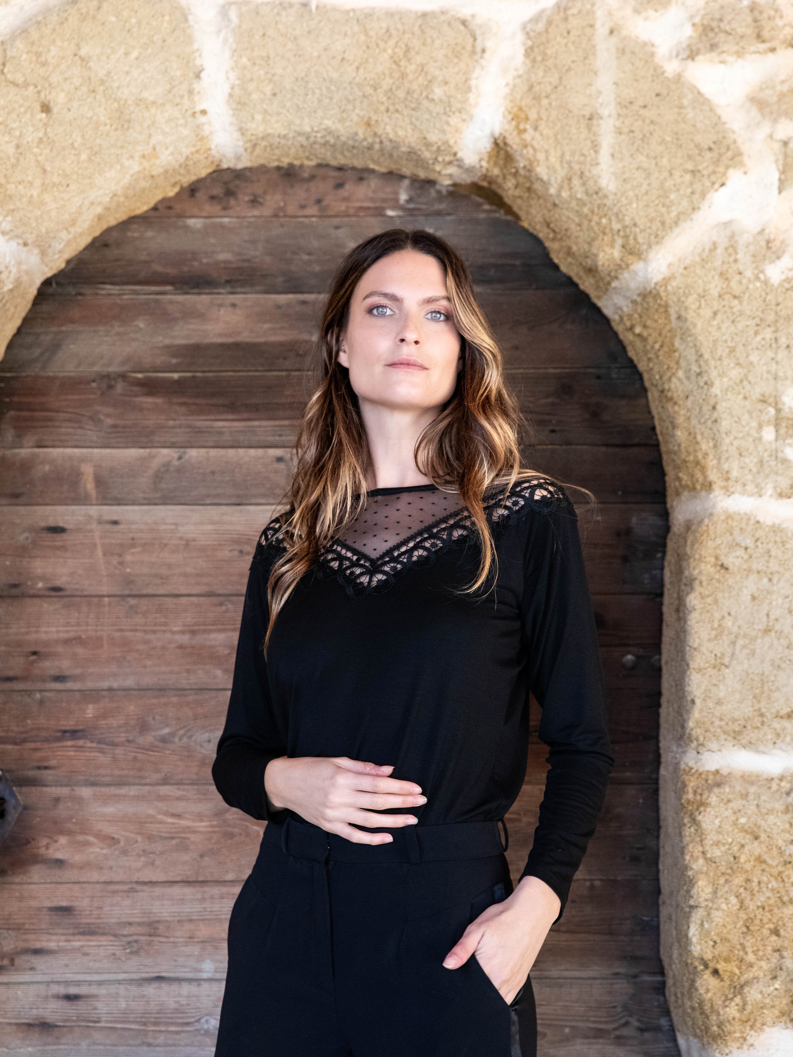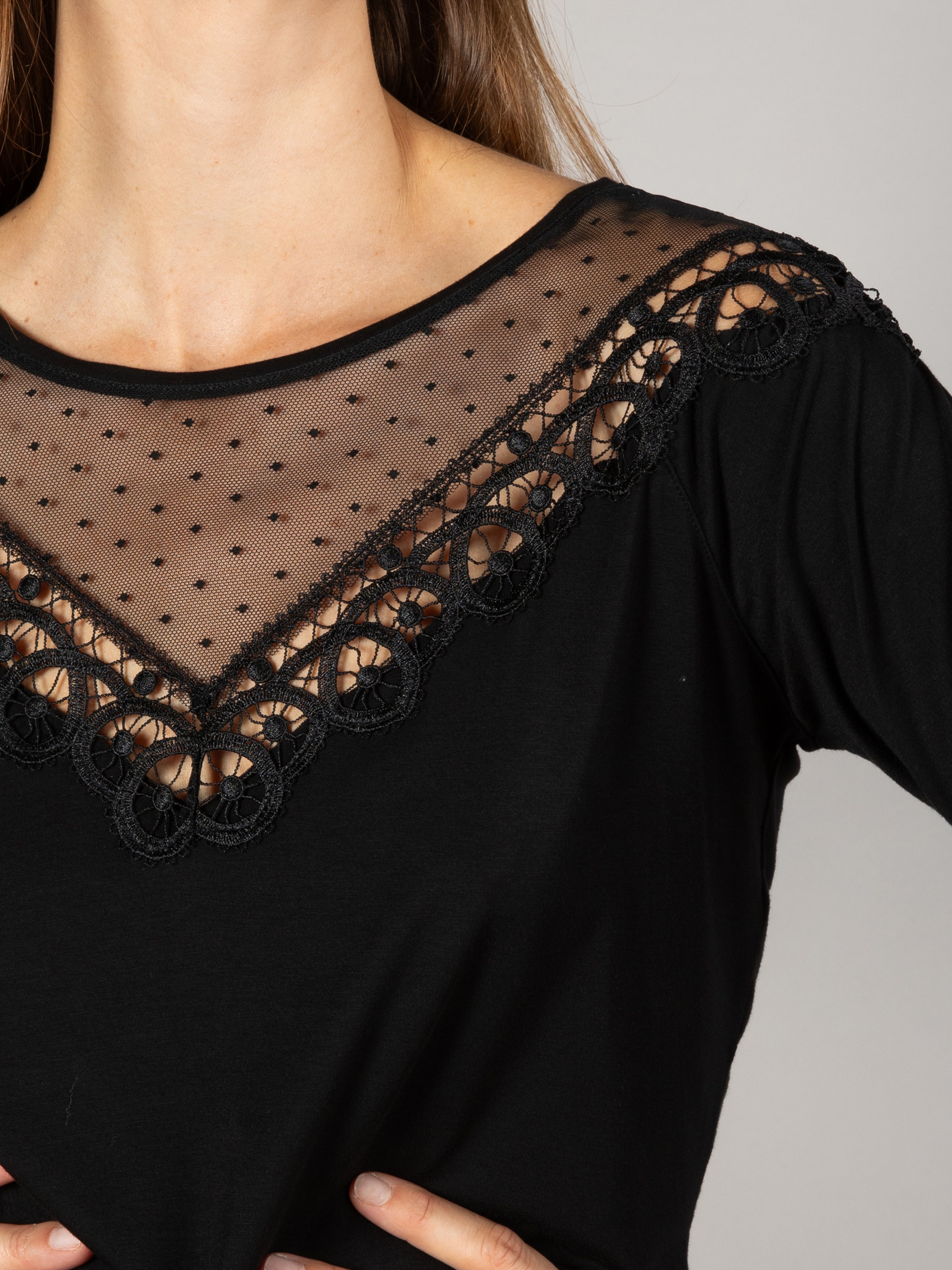 Romantisch und zart: Dieses Netz-T-Shirt mit Plumetis- und Guipure-Details wertet Ihren Look sofort auf. Für einen schicken und raffinierten Stil ist dies das richtige Stück für diesen Herbst!