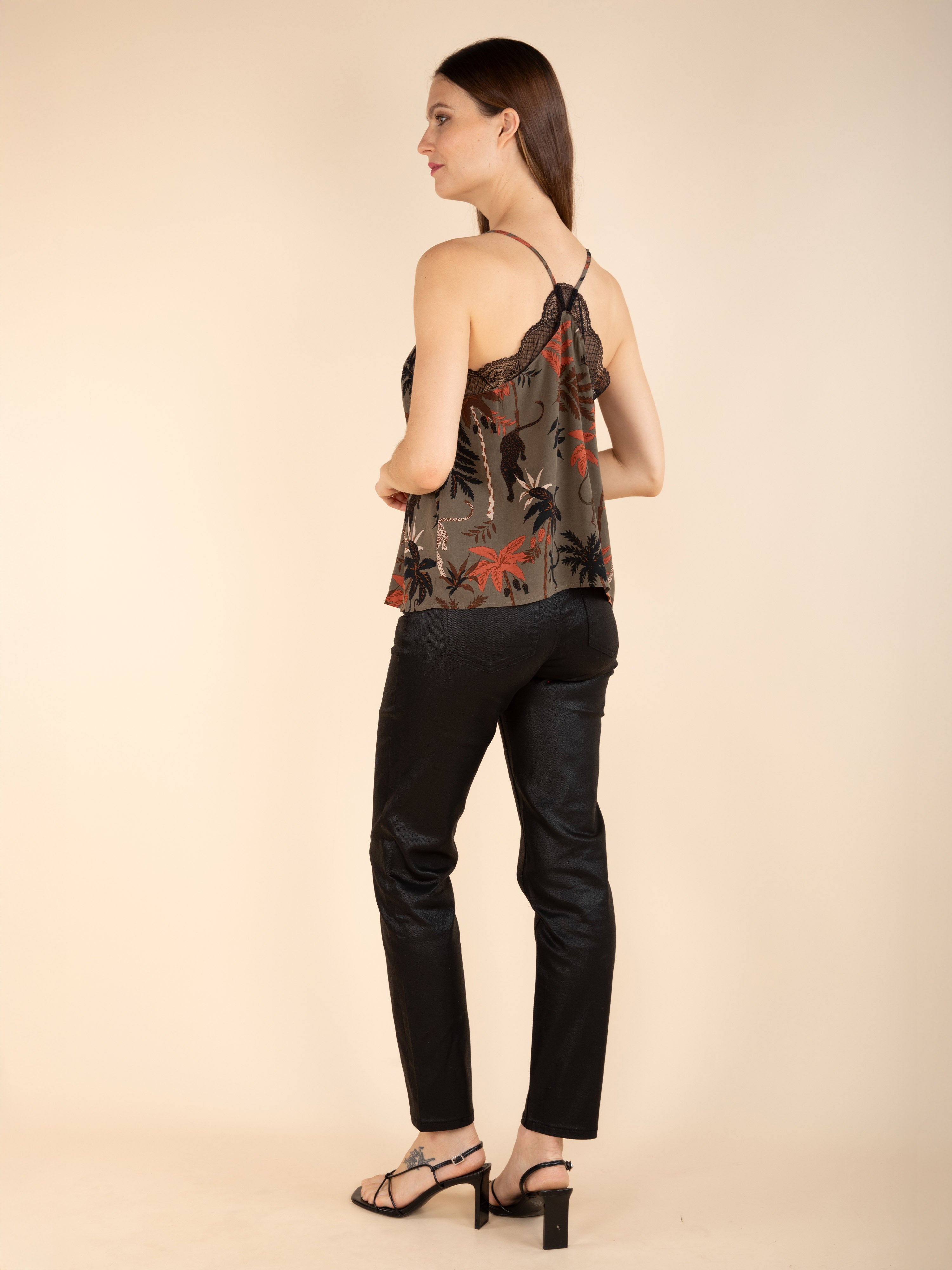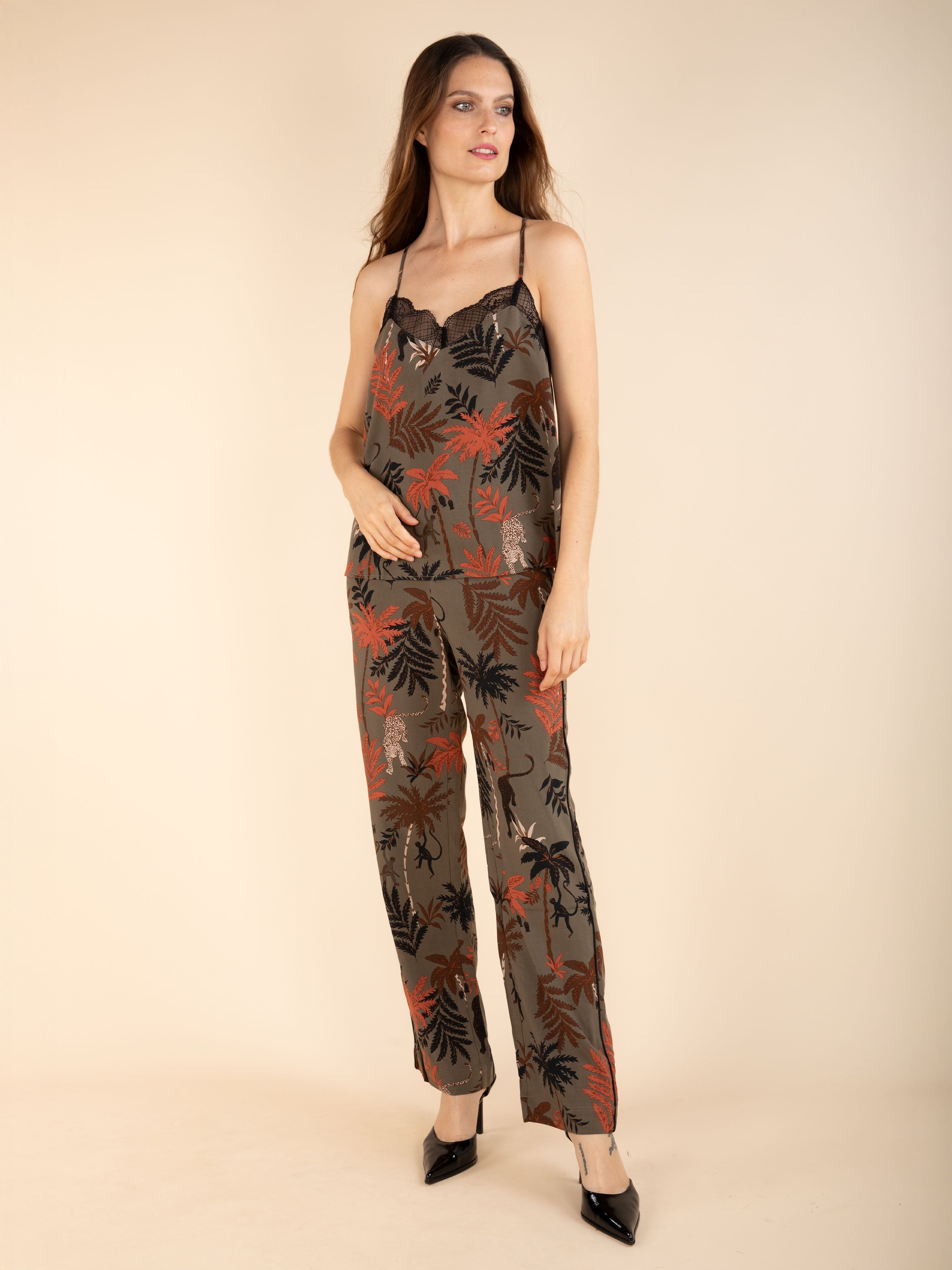 Optez pour ce pyjama raffiné, alliant top à fines bretelles et pantalon droit, parfait pour des nuits stylées et confortables.