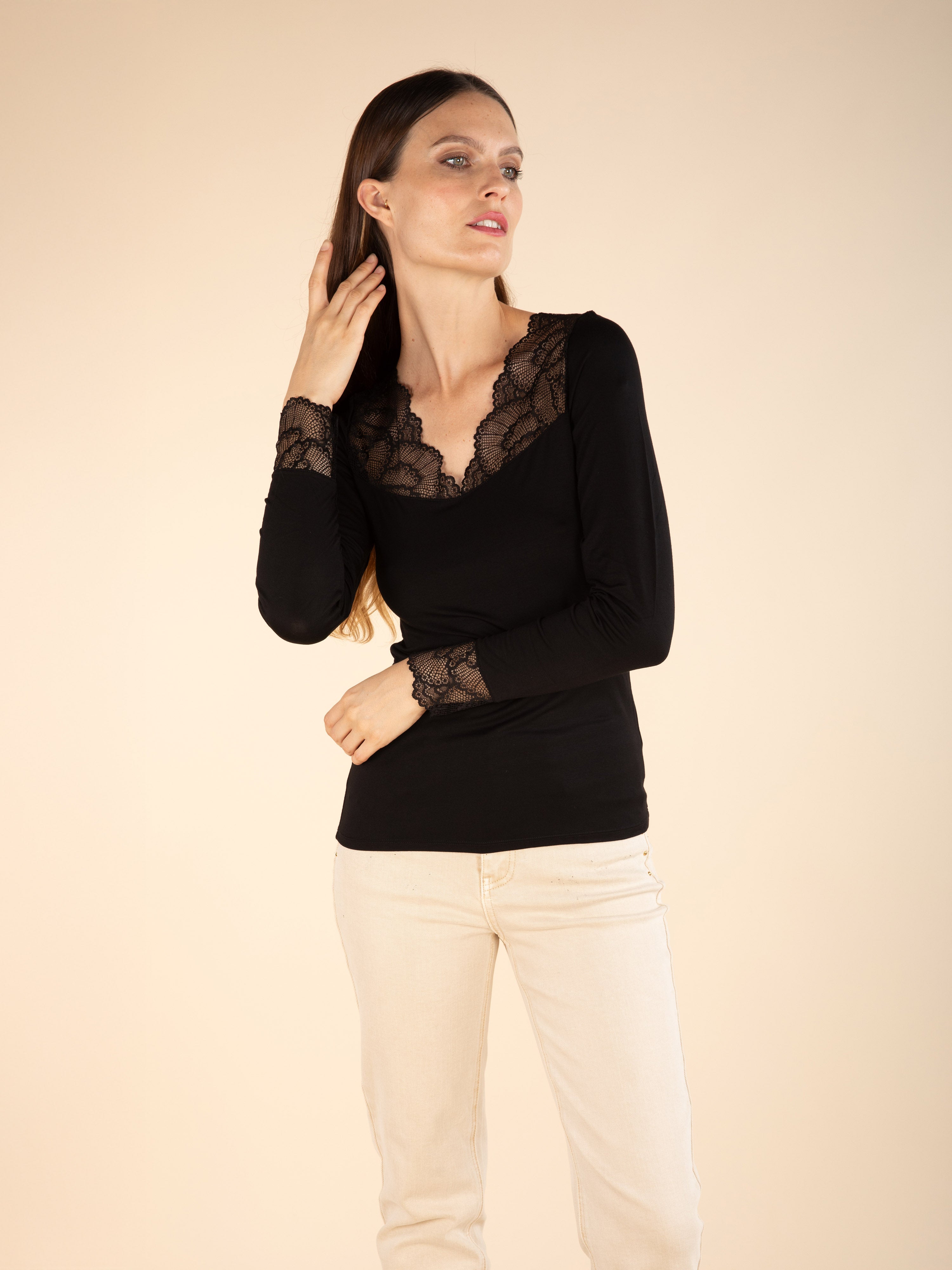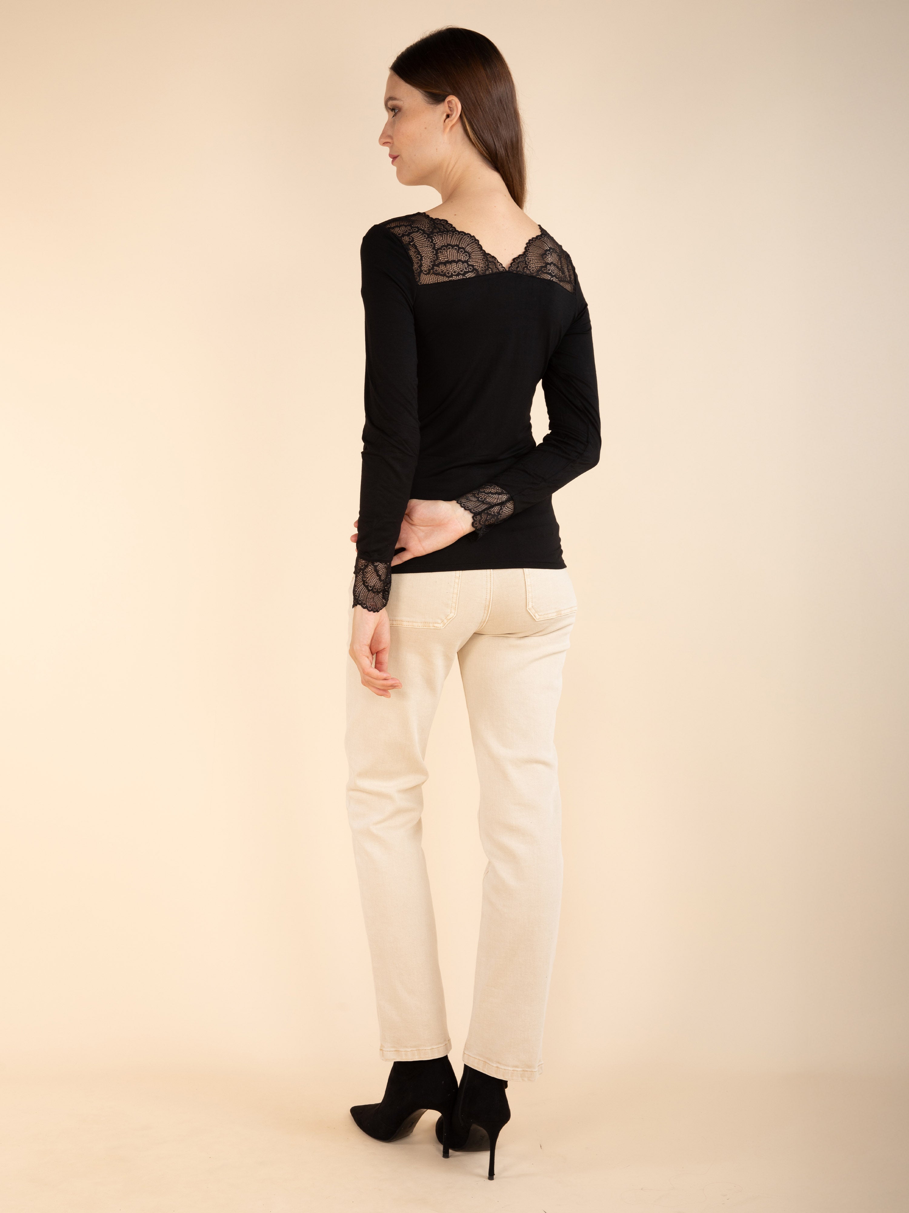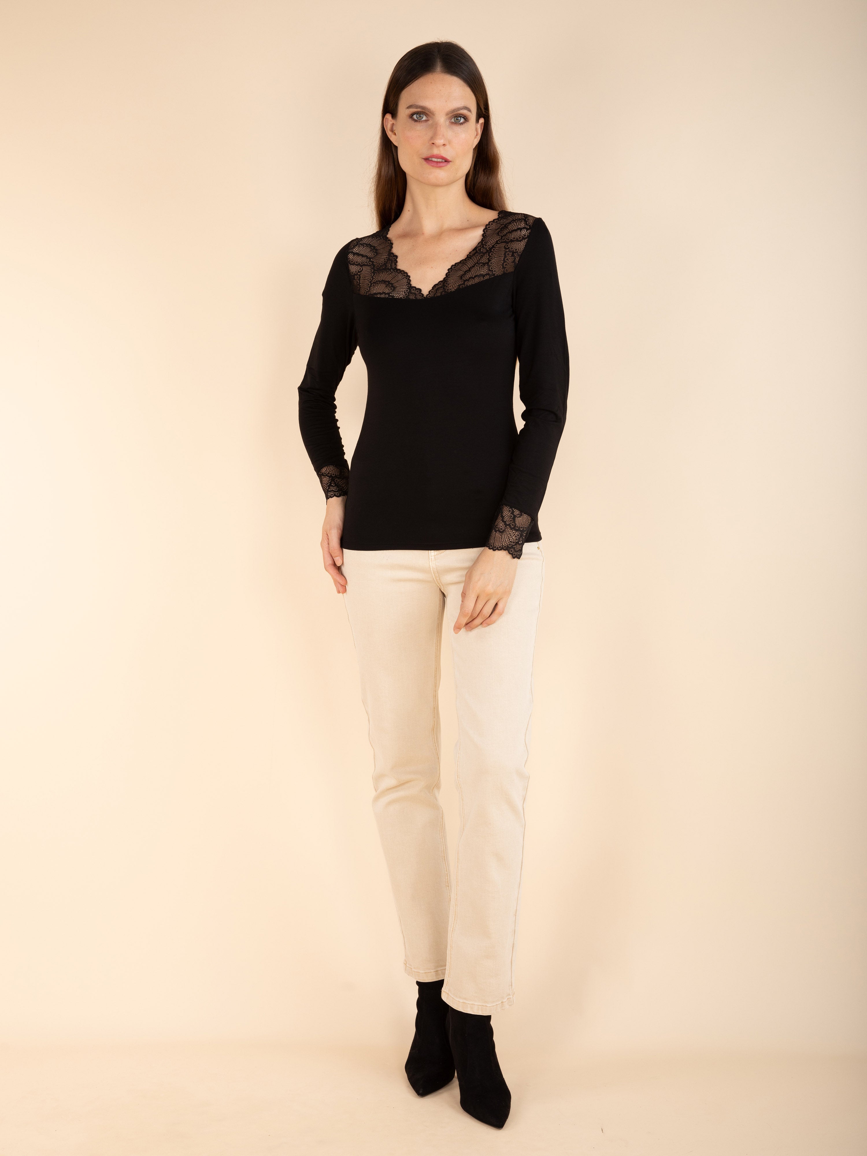 Craquez pour ce top col V en maille, sublimé par ses empiècements dentelle et sa coupe ajustée pour un look féminin et raffiné.