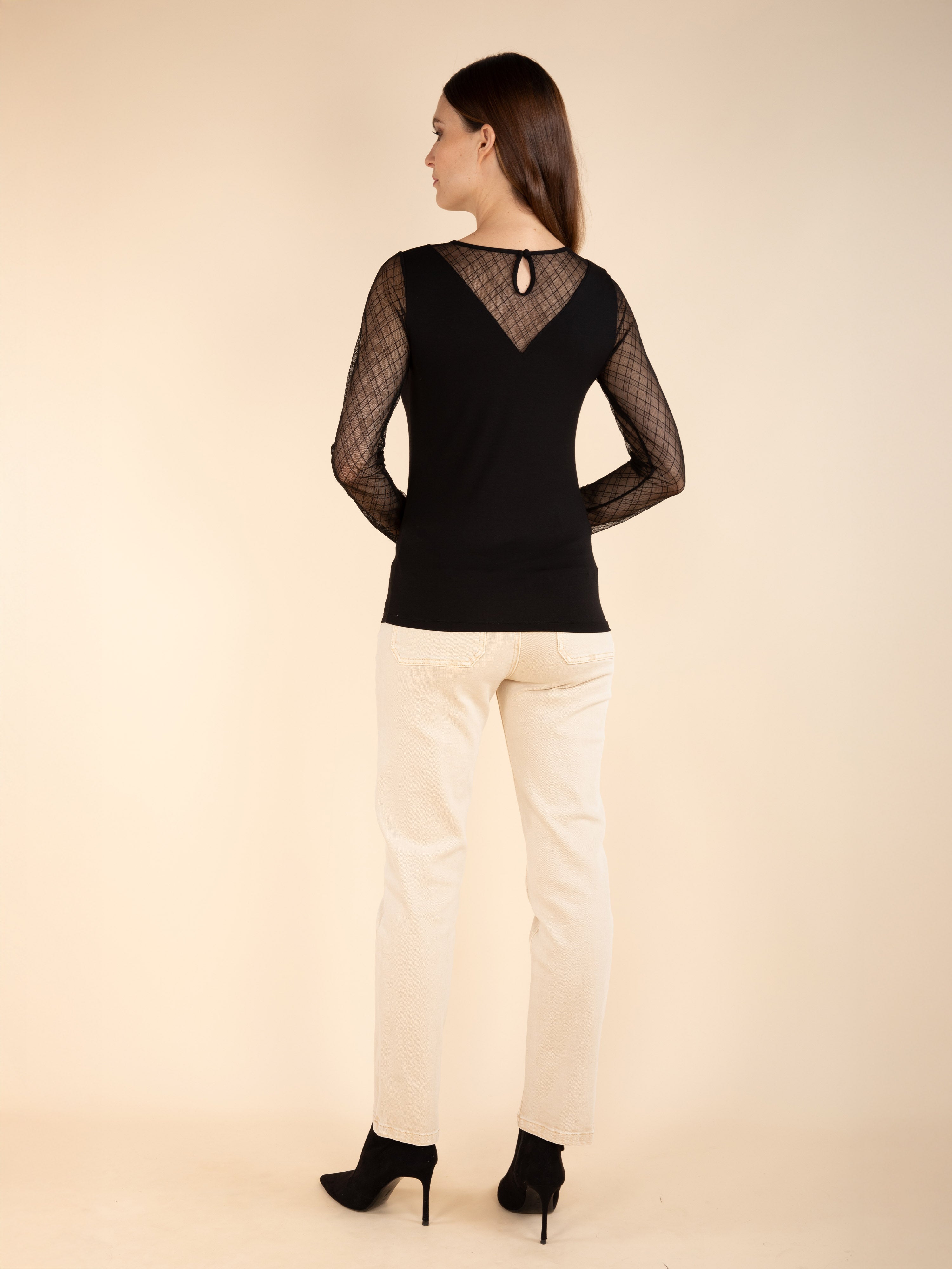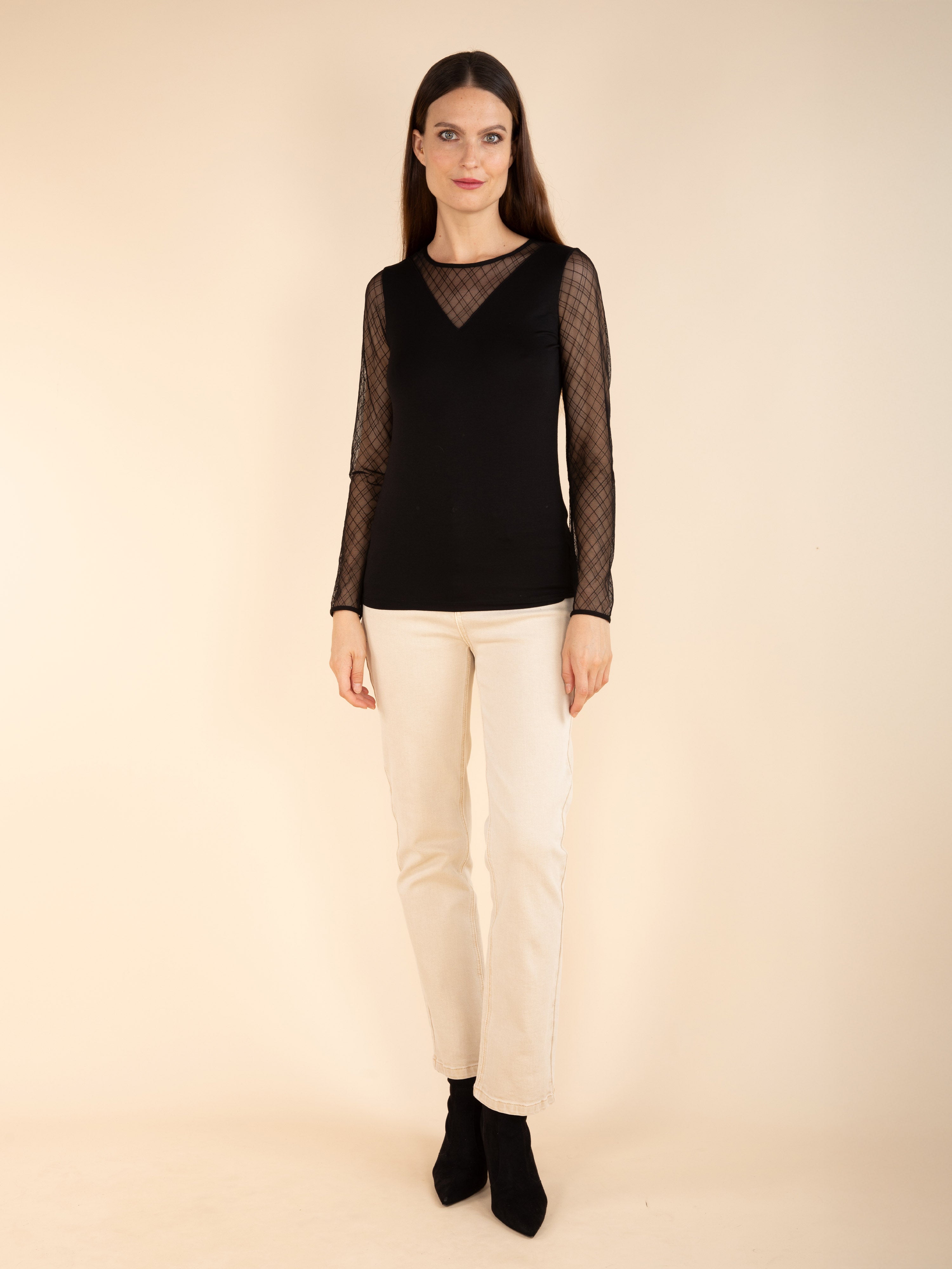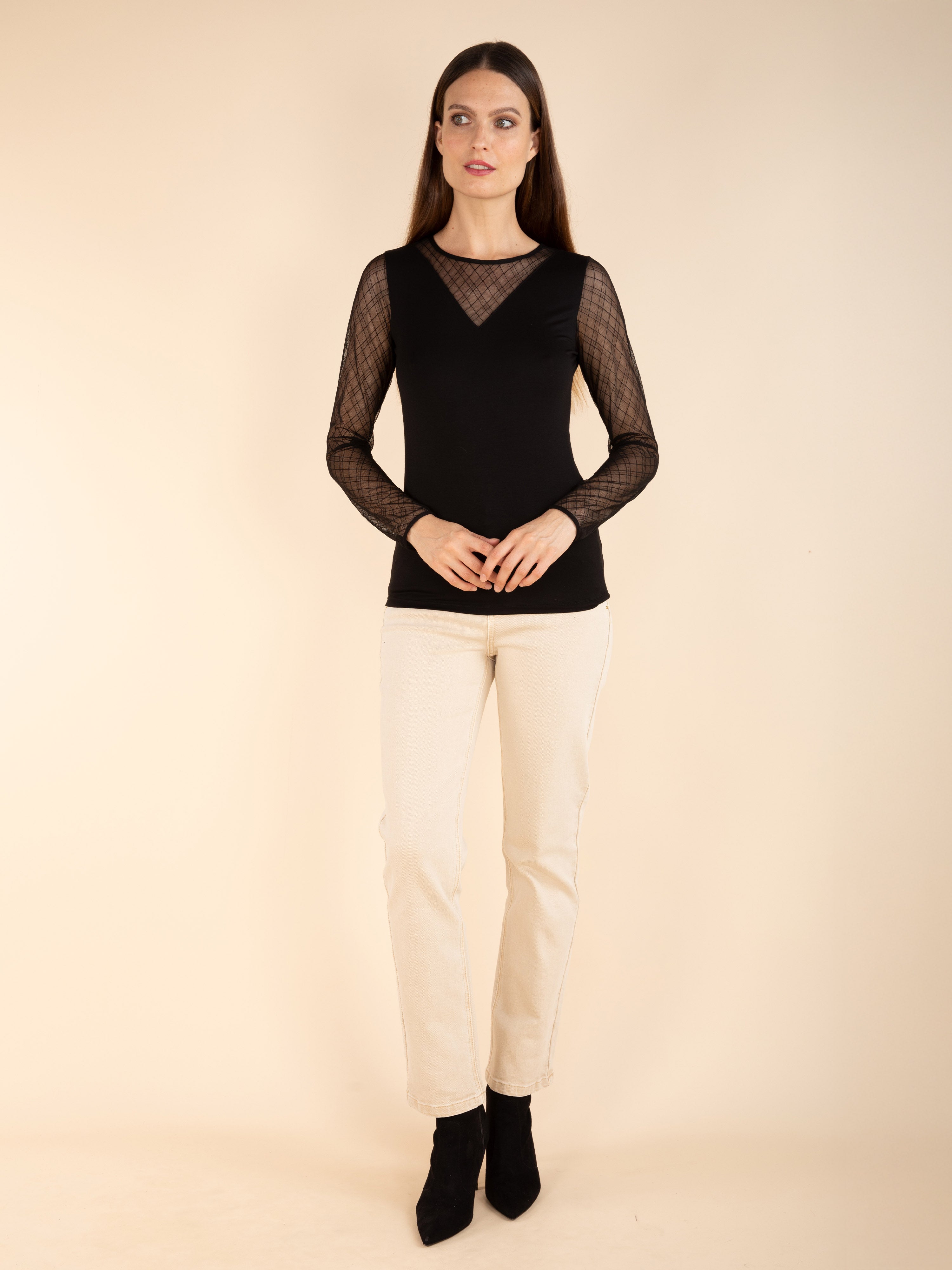 Craquez pour ce top à manches longues en tulle fantaisie, à la coupe ajustée et détails délicats pour un look élégant et féminin.