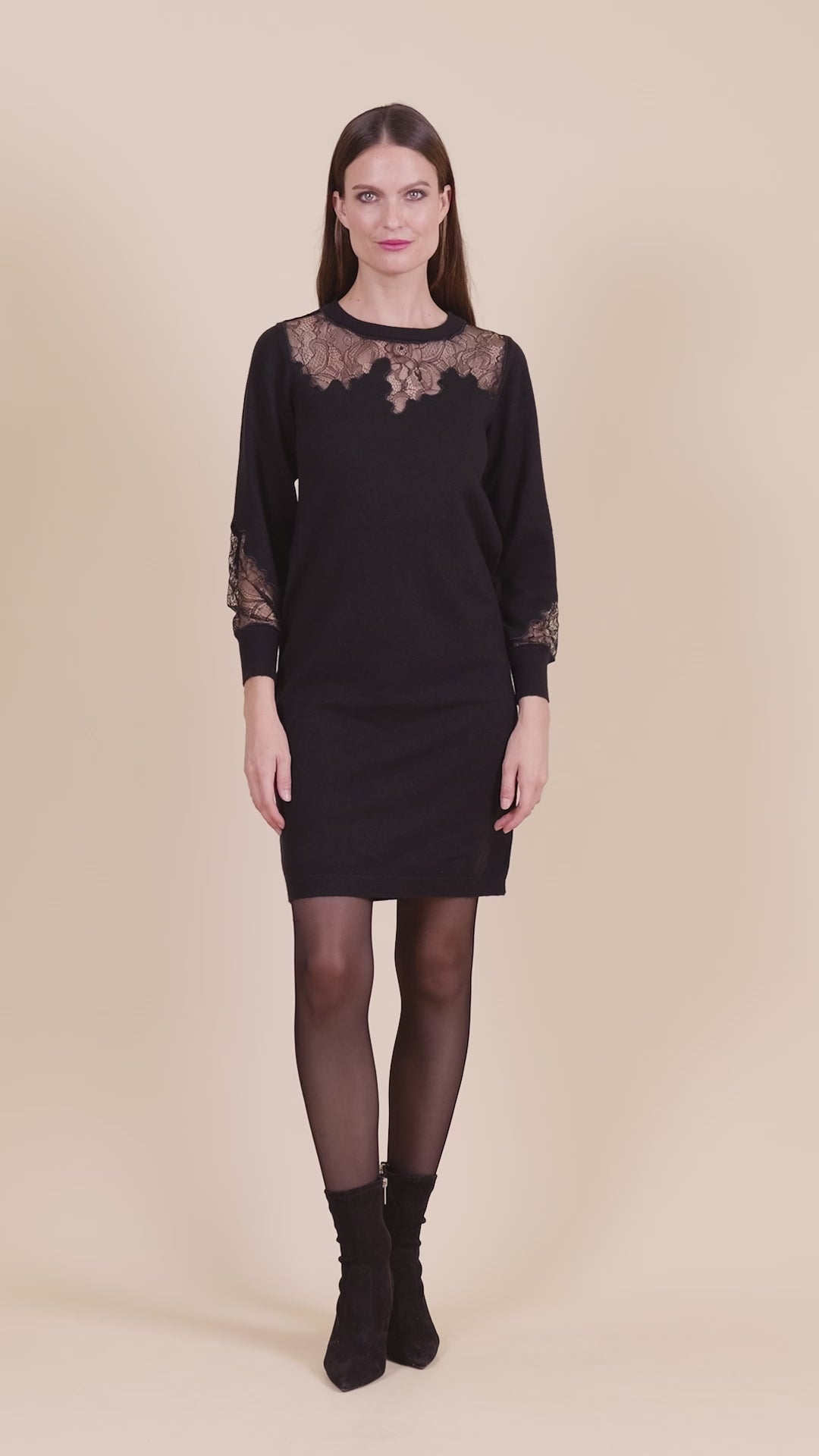 Craquez pour cette robe pull en maille, sublimée par ses empiècements dentelle pour un look féminin et raffiné.