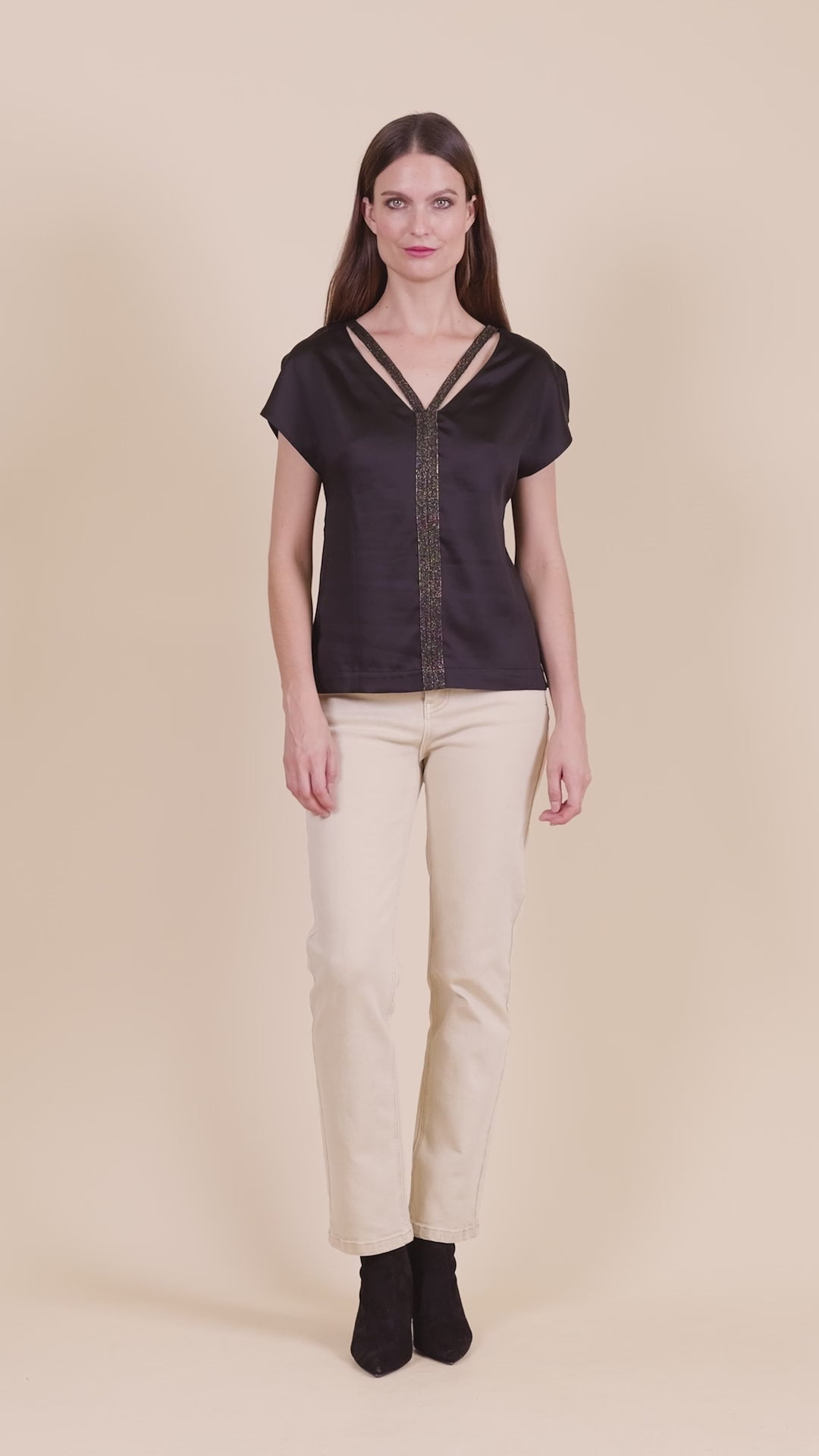 Craquez pour ce top fluide réversible en satin, à la coupe droite et détails raffinés pour un look chic et modulable.
