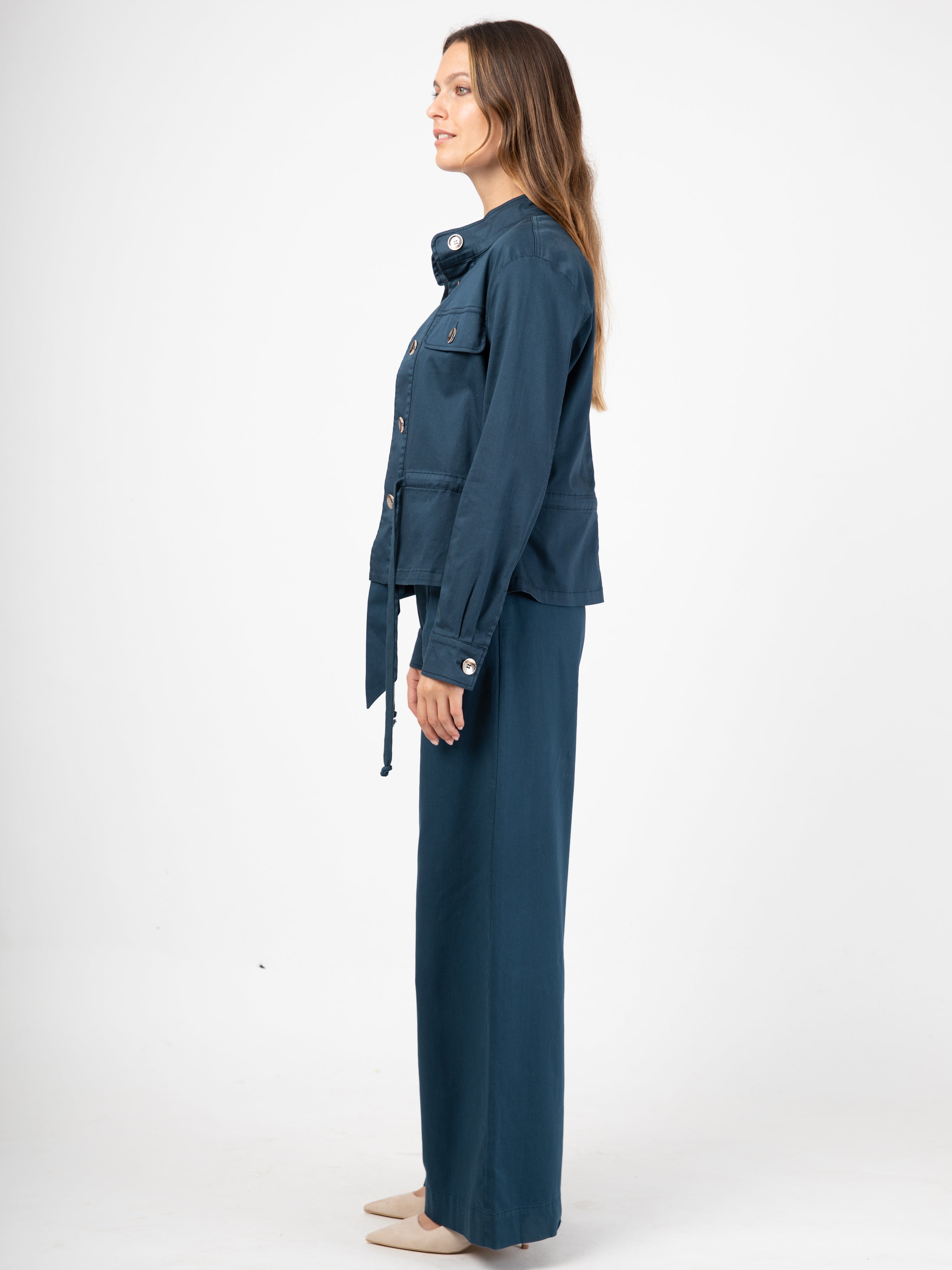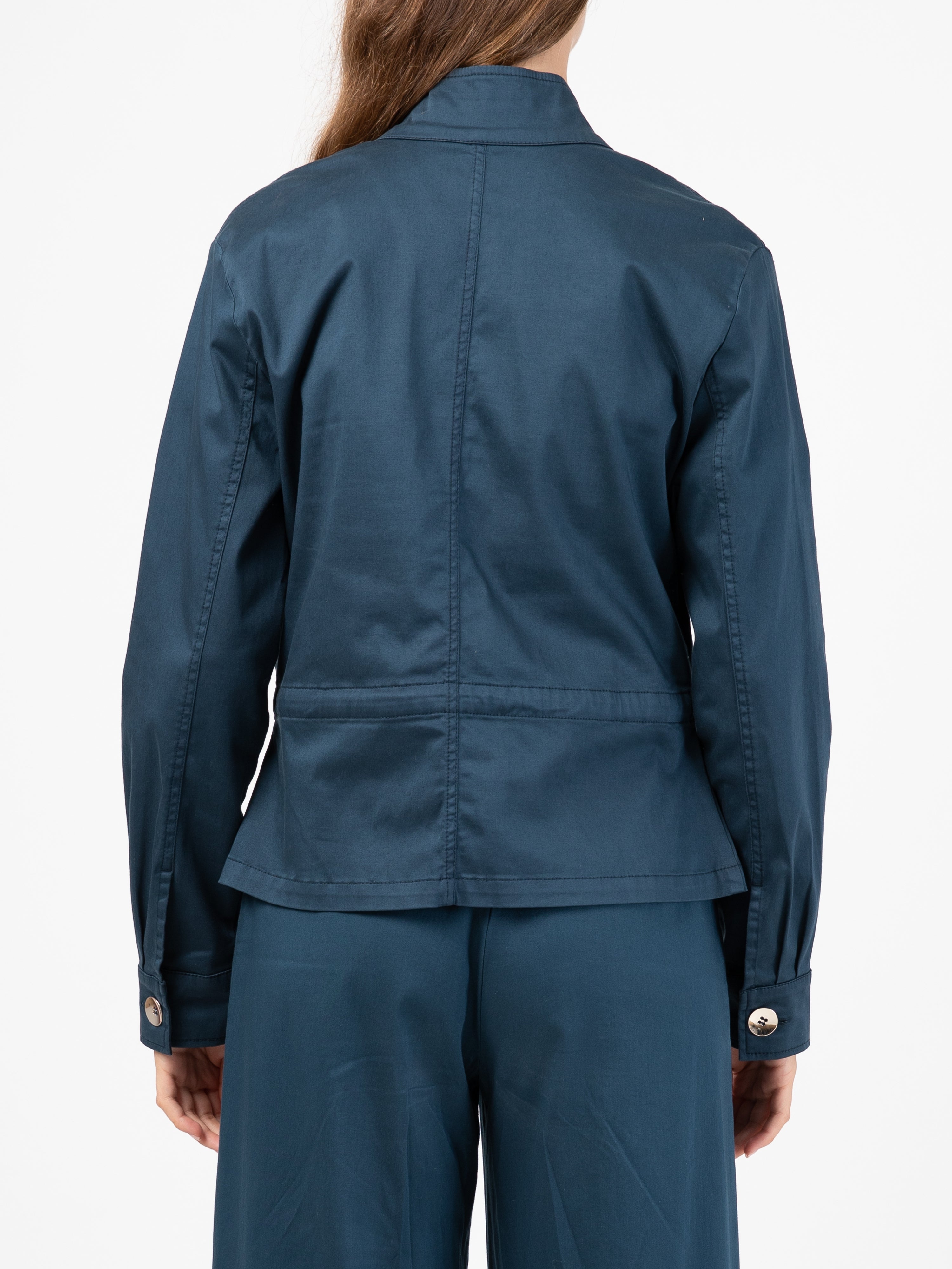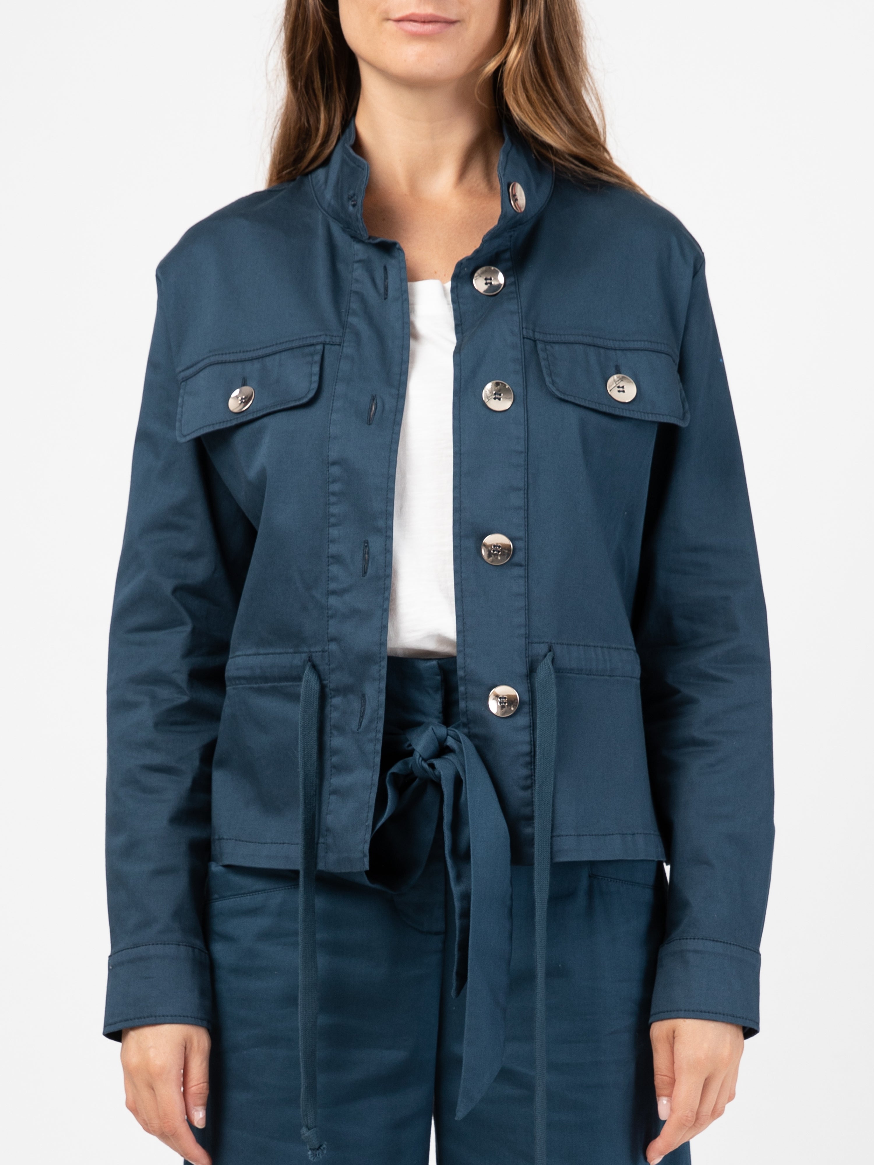 Die blaue Farbe unserer Jacke mit Offizierskragen verleiht ihr einen frischen und modernen Touch. Der Kordelzug in der Taille sorgt für eine elegante Silhouette, ideal für die Jahreszeit.