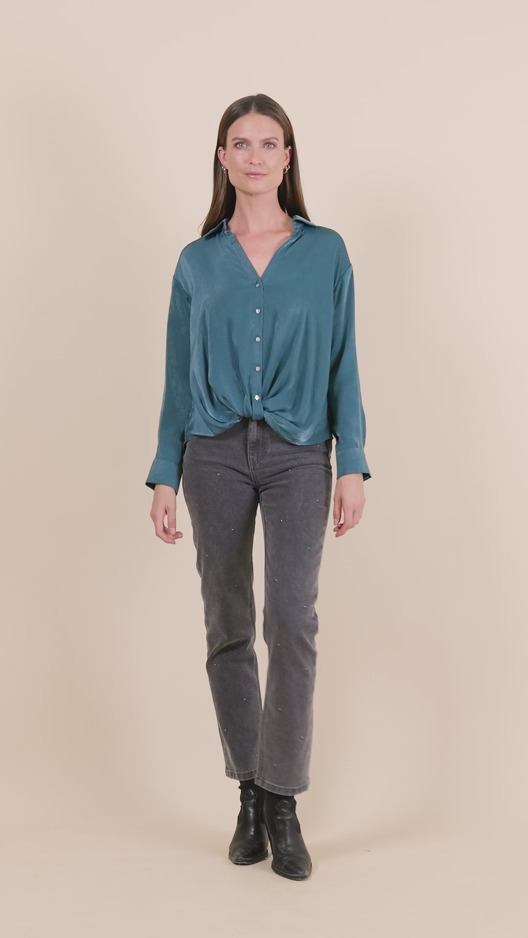 Craquez pour l'élégance fluide de cette blouse satinée, twistée sur le bas pour une touche moderne et féminine.