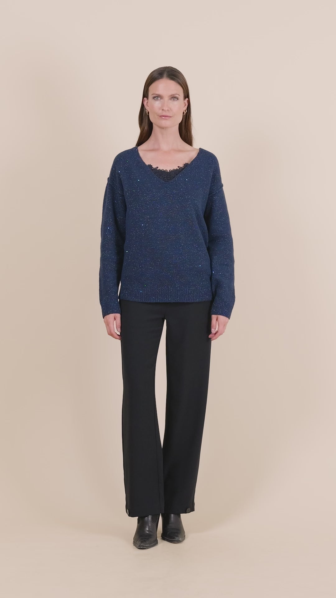 Ce pull encolure V joue la carte de l’éclat discret avec son tricotage jersey orné de petits sequins, pour un effet lumineux tout en finesse.