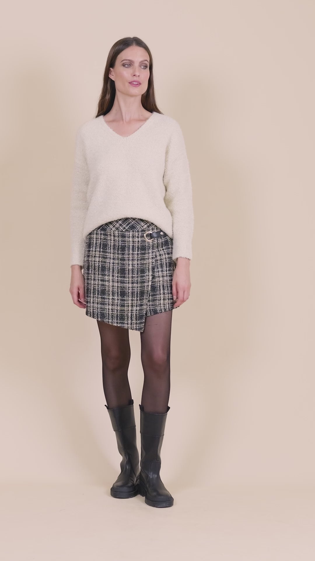 Succombez à cette jupe-short en tweed, rehaussée de détails métal et faux cuir pour un look féminin et moderne.