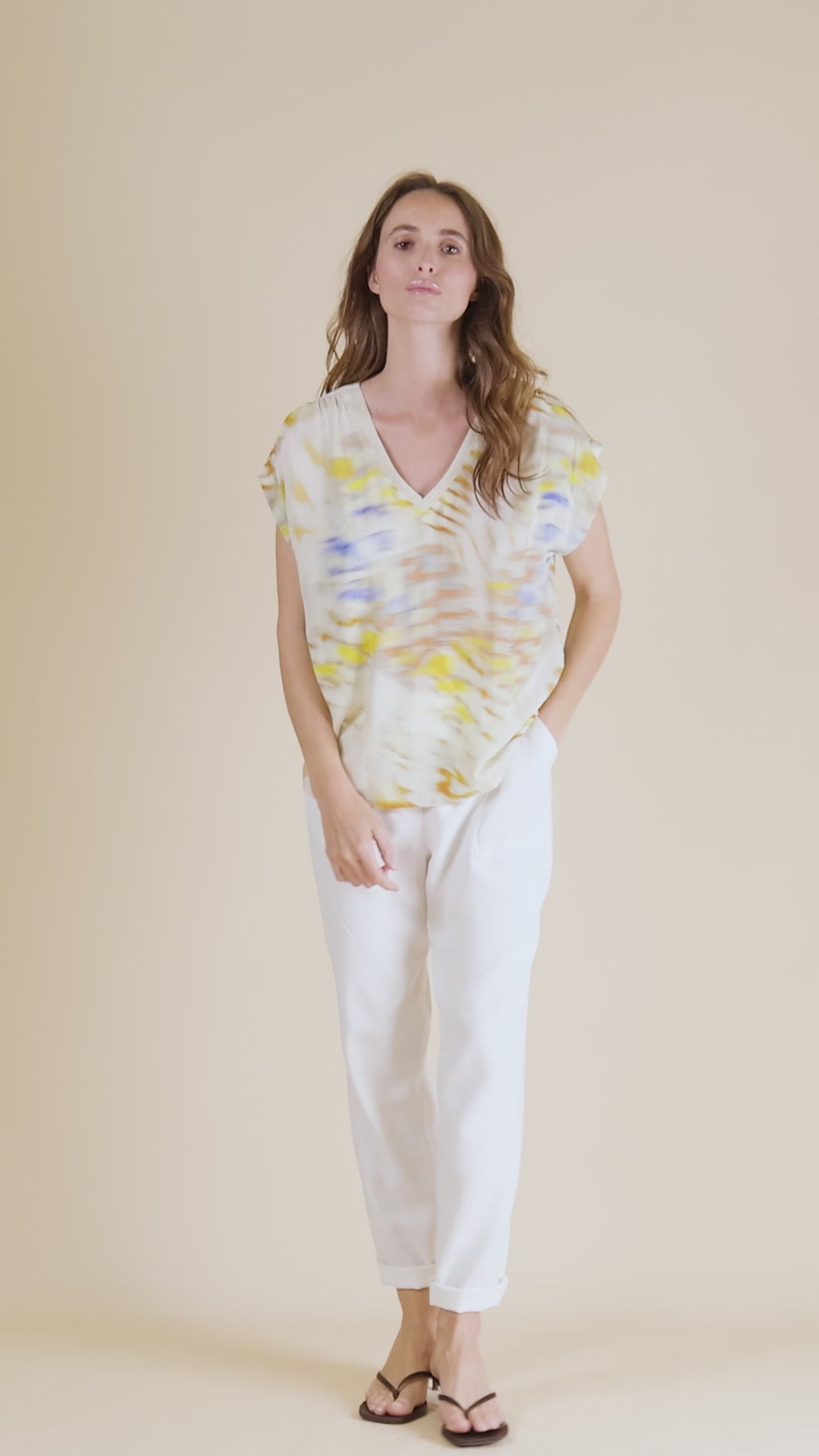 Ce top en crêpe à fine rayure lurex est sublimé par une encolure V ornée d'un galon fantaisie, ajoutant une touche d'élégance subtile.