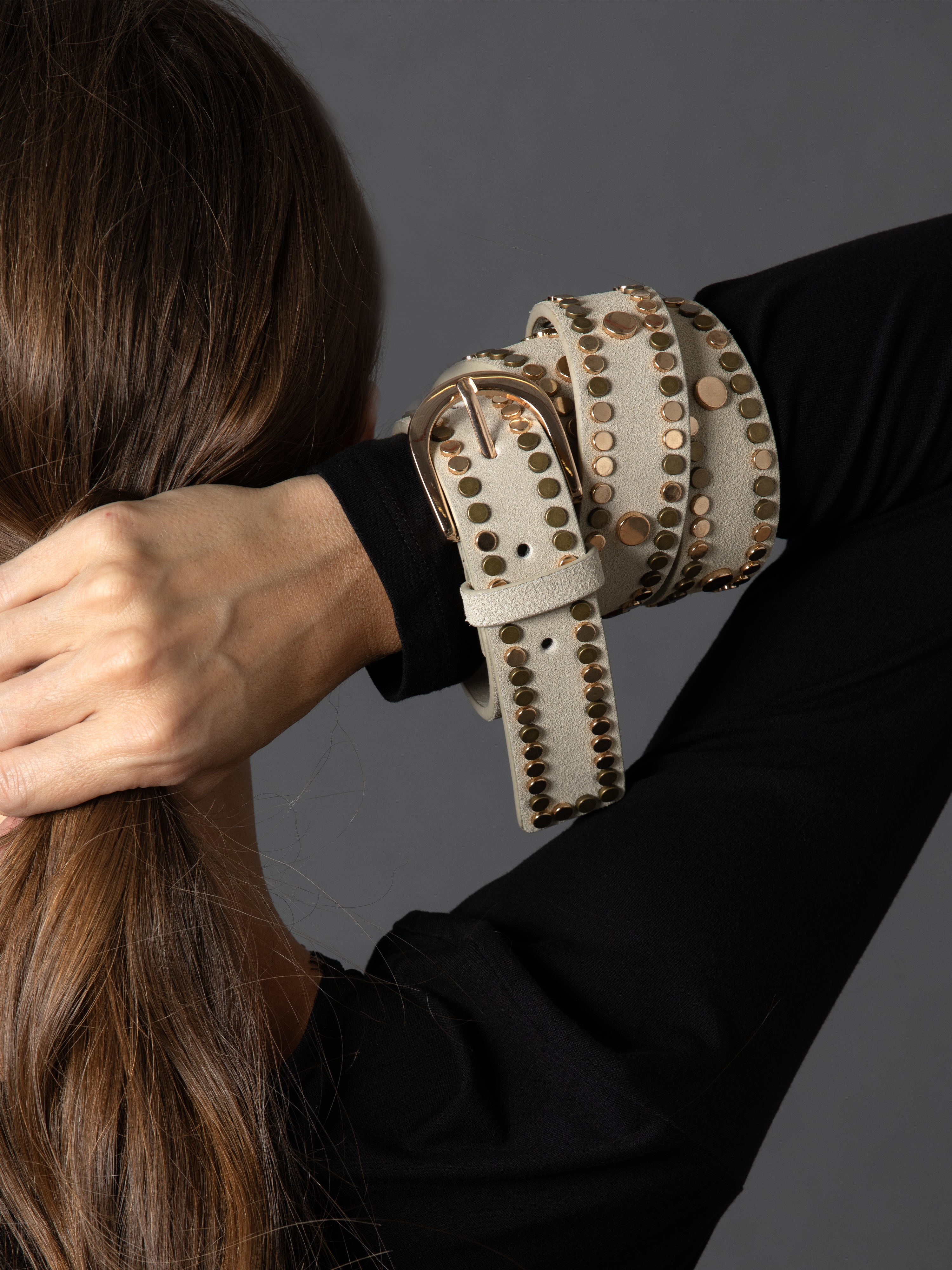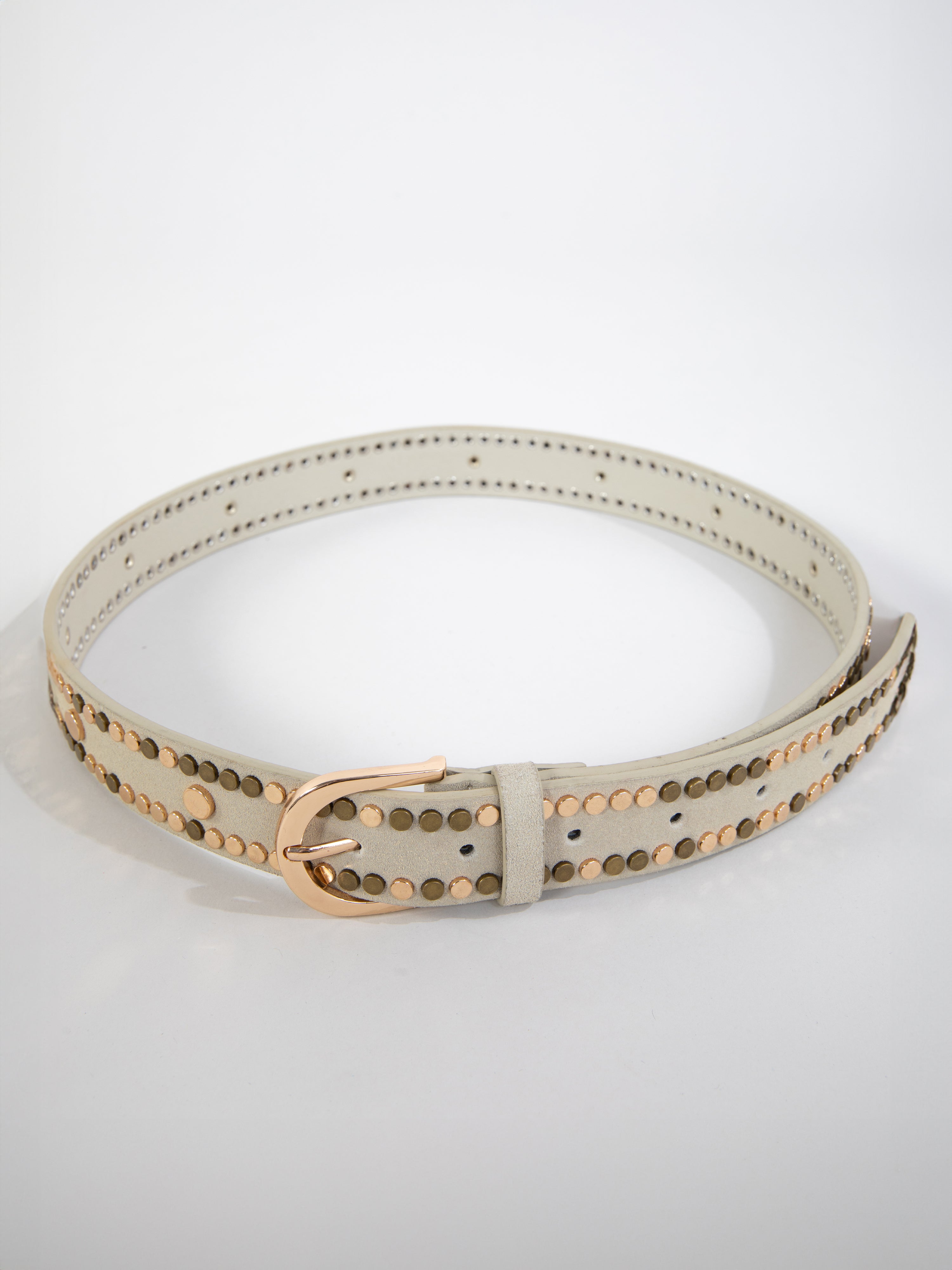 Dieser Gürtel mit Metallnieten ist ein rockiges Accessoire, das Ihre Outfits aufwertet. Ein Hauch von Kühnheit für einen selbstbewussten Stil