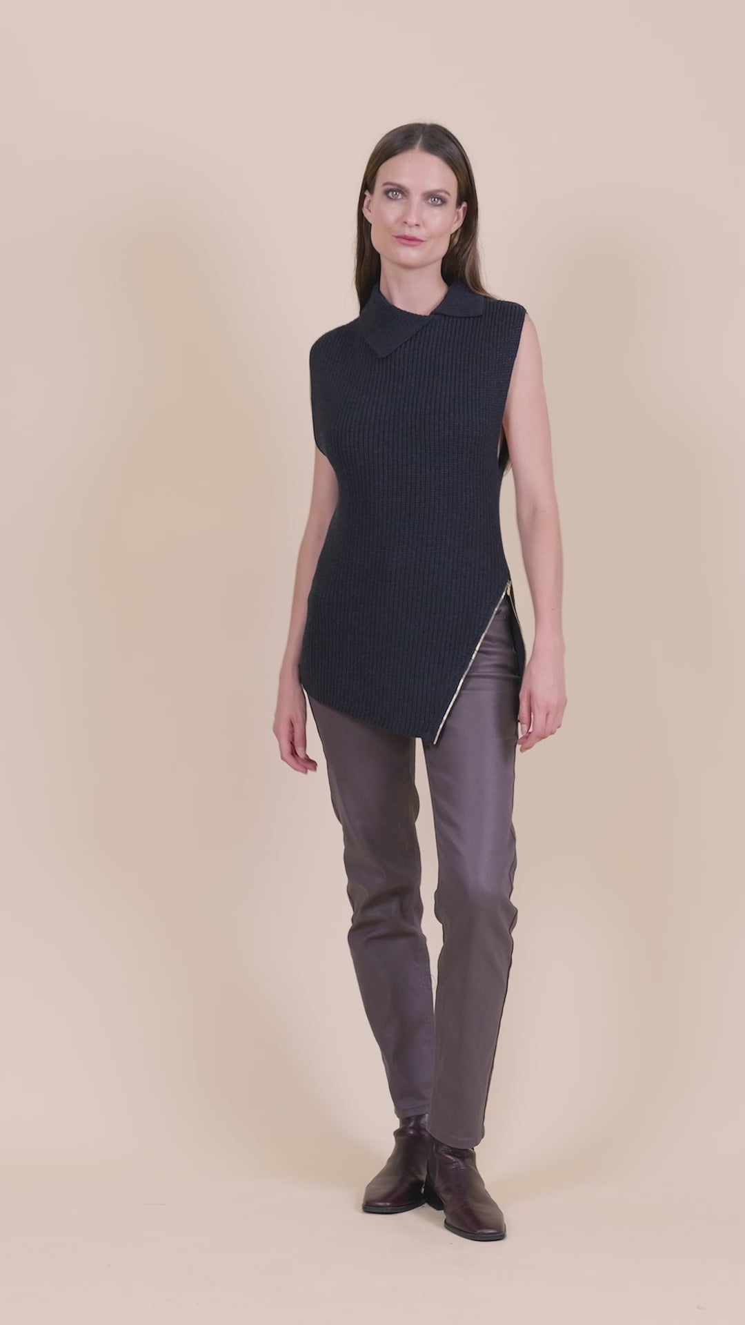 Craquez pour ce pull sans manches à col montant, sublimé par son zip asymétrique et sa coupe droite pour un look moderne et raffiné.