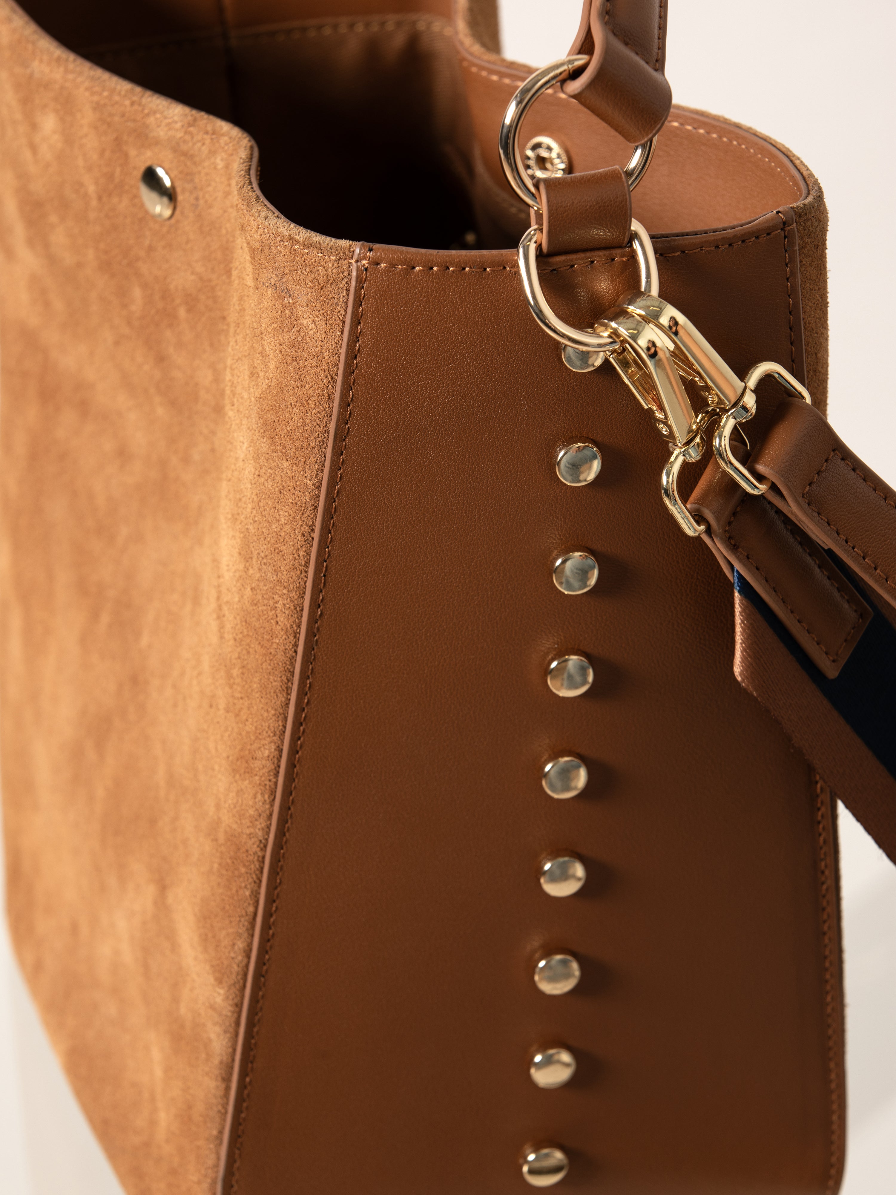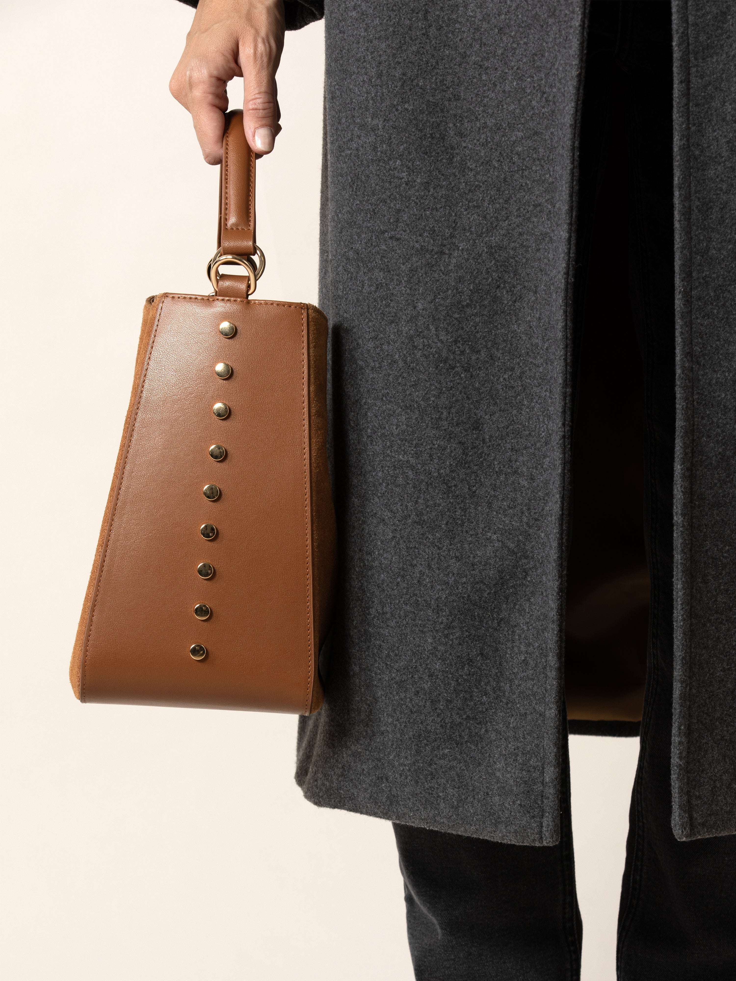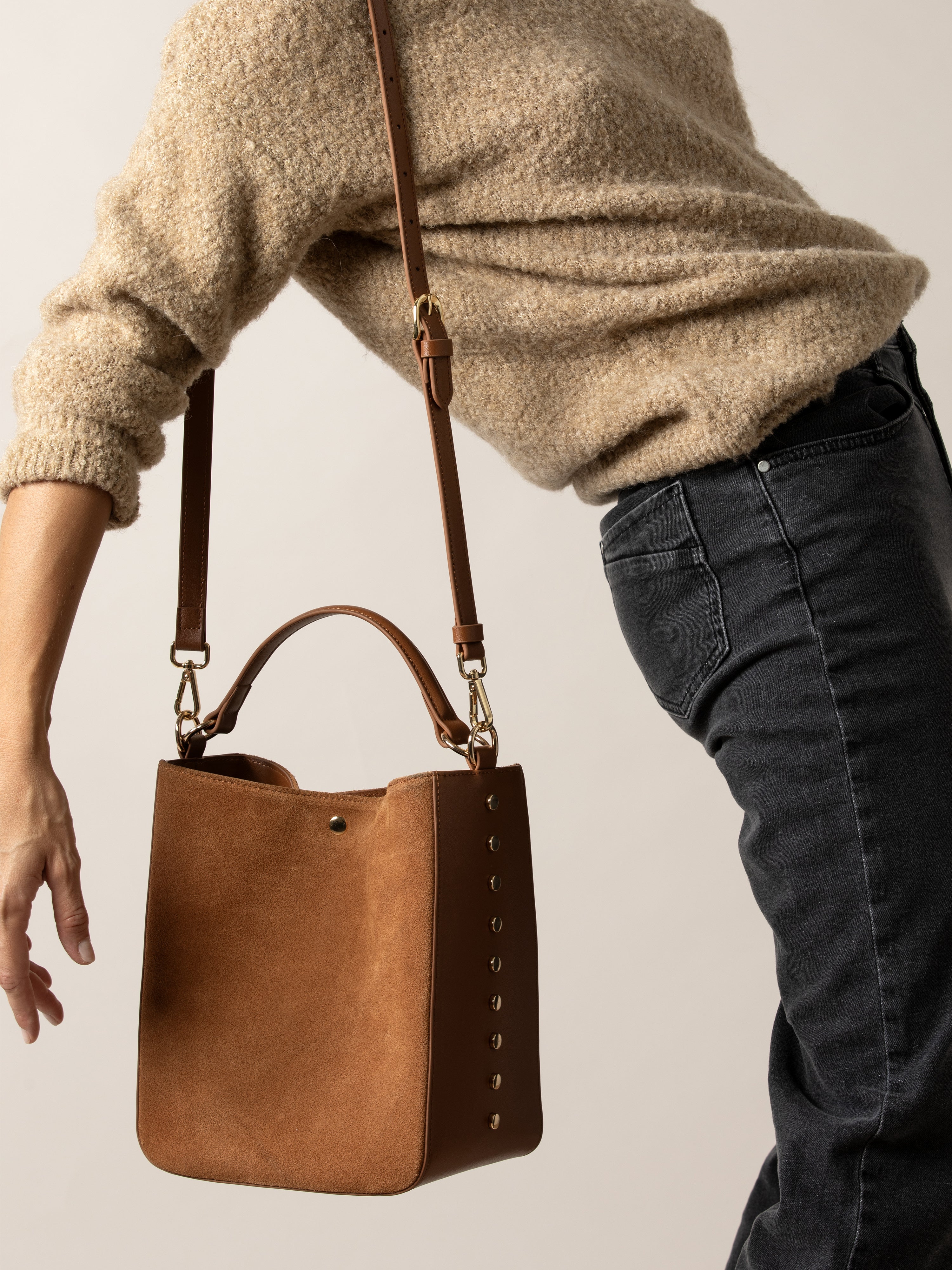 Deze stevige bucketbag valt op door zijn gedurfde stijl met metalen klinknagels en verwisselbare handvatten. Een onmisbaar kledingstuk om dag en nacht te dragen.