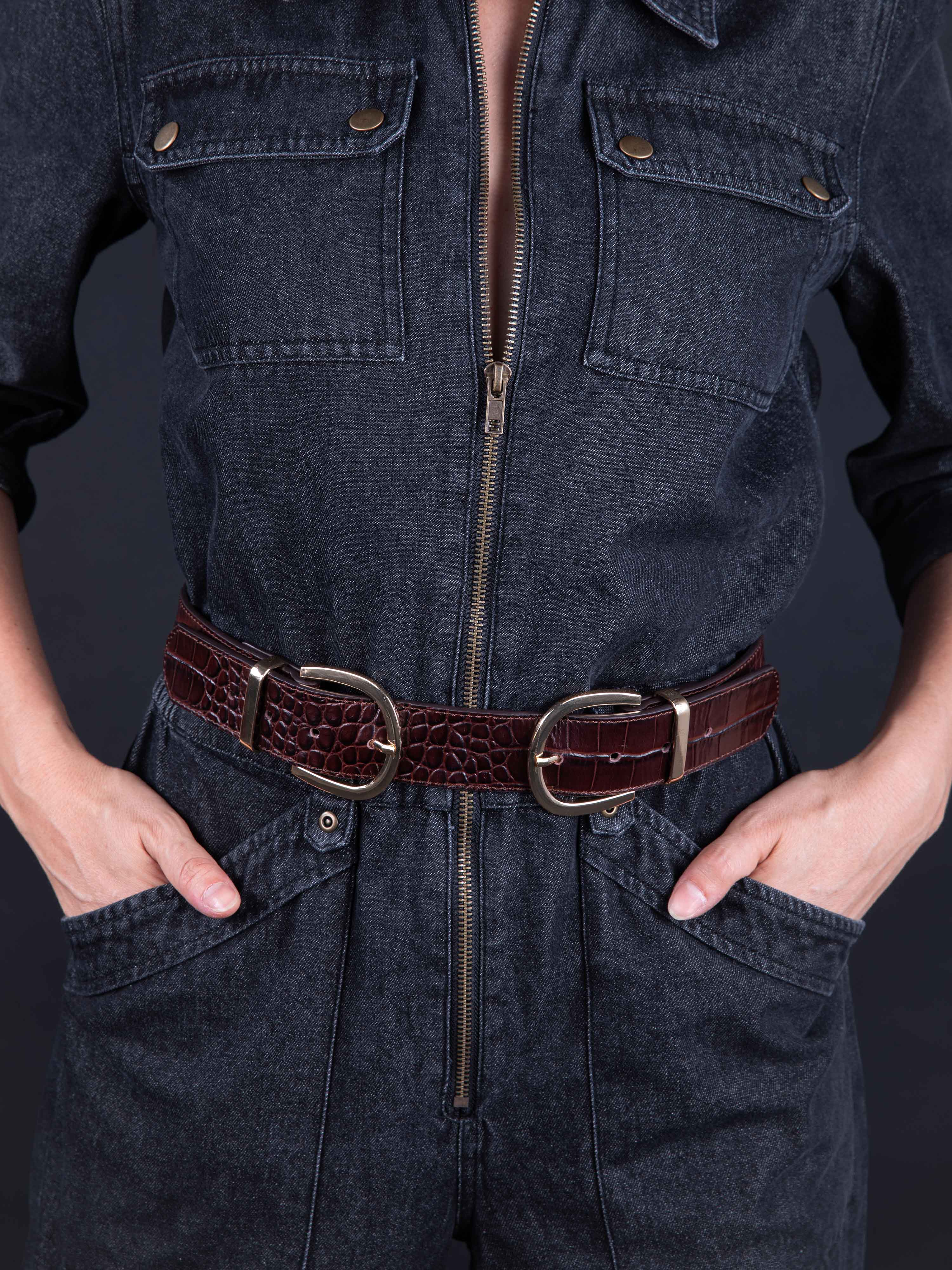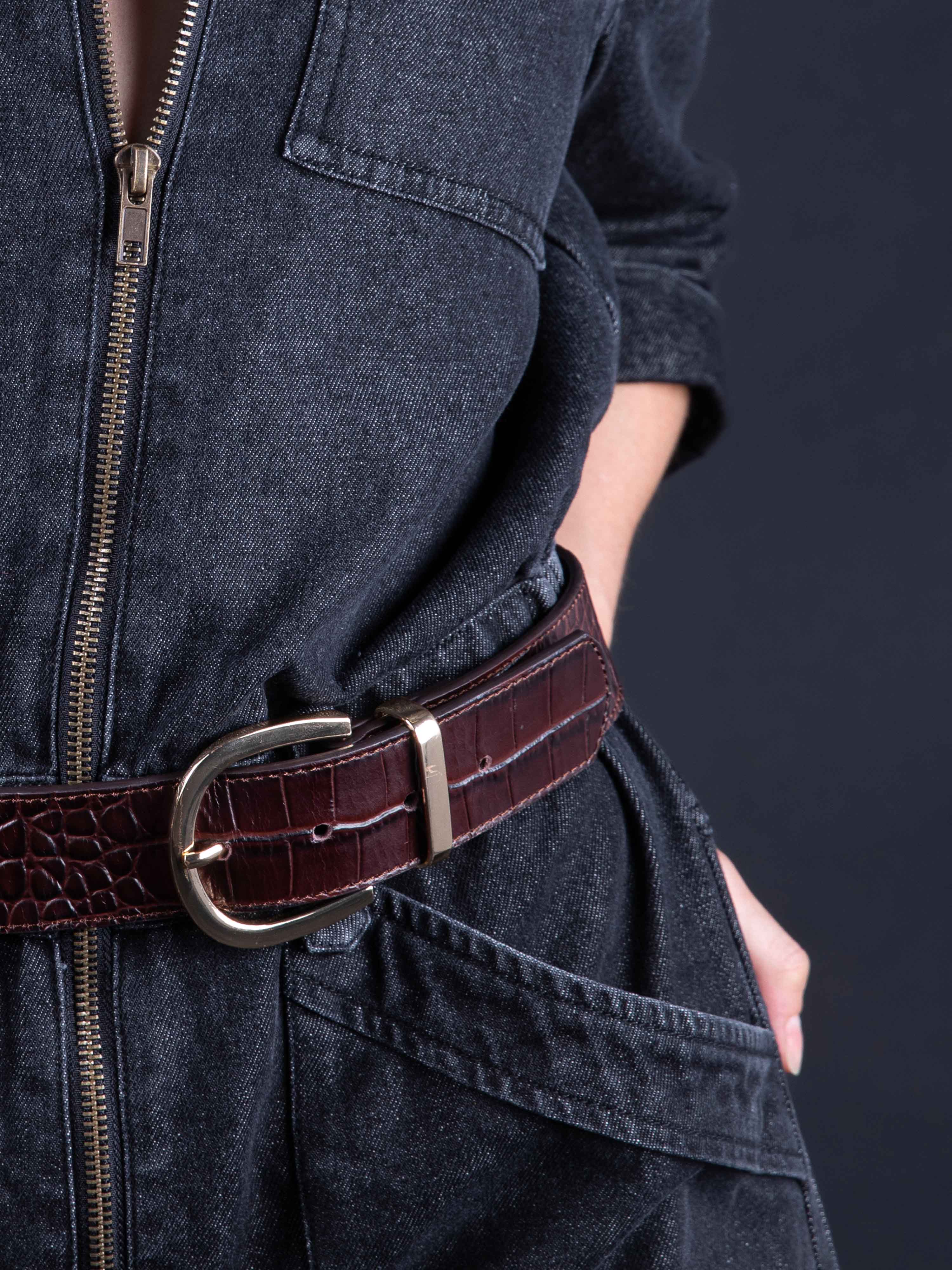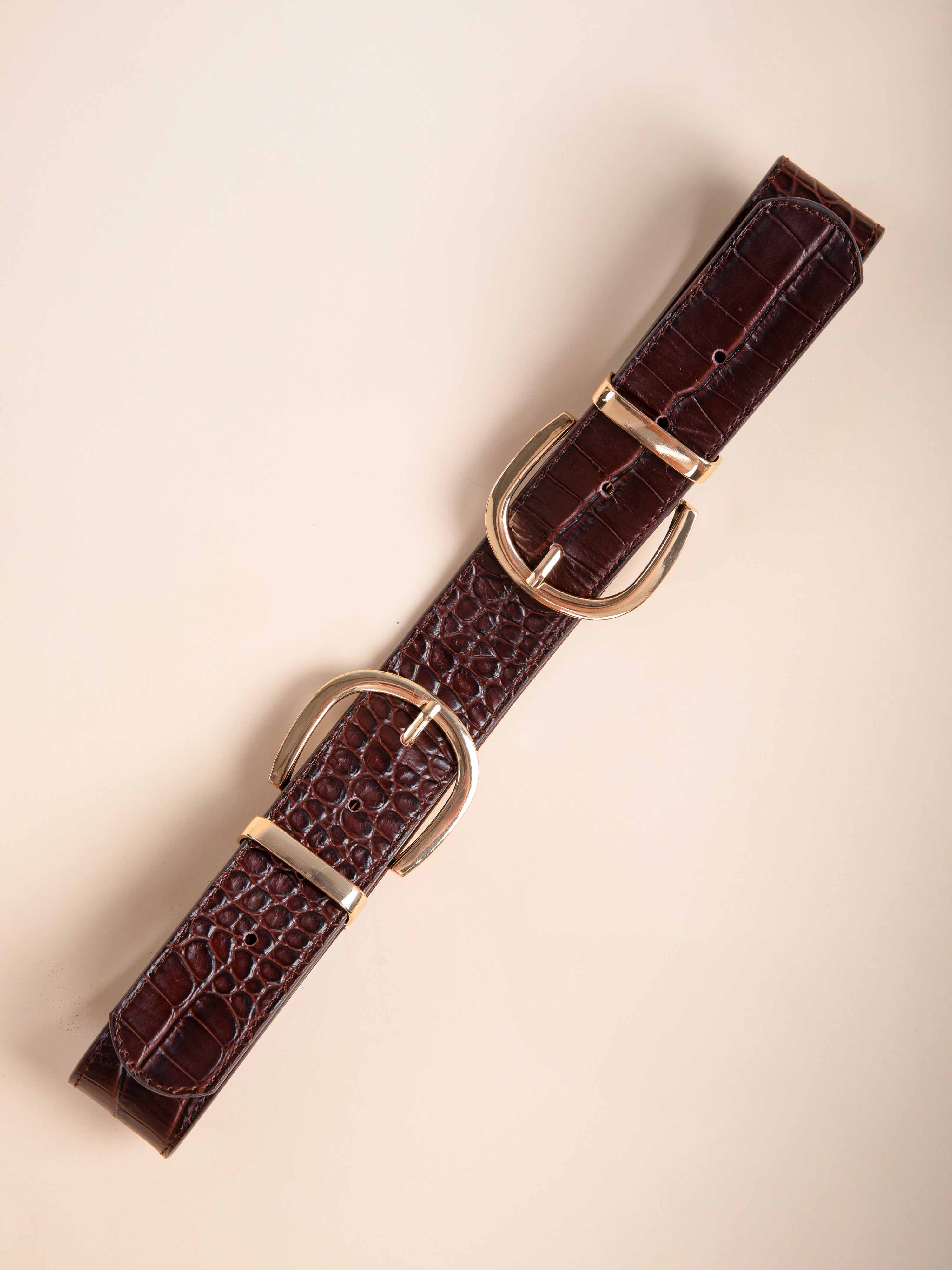 Adoptez la ceinture effet croco, élégante avec son cuir texturé et sa double boucle métal, pour une touche sophistiquée à votre silhouette.