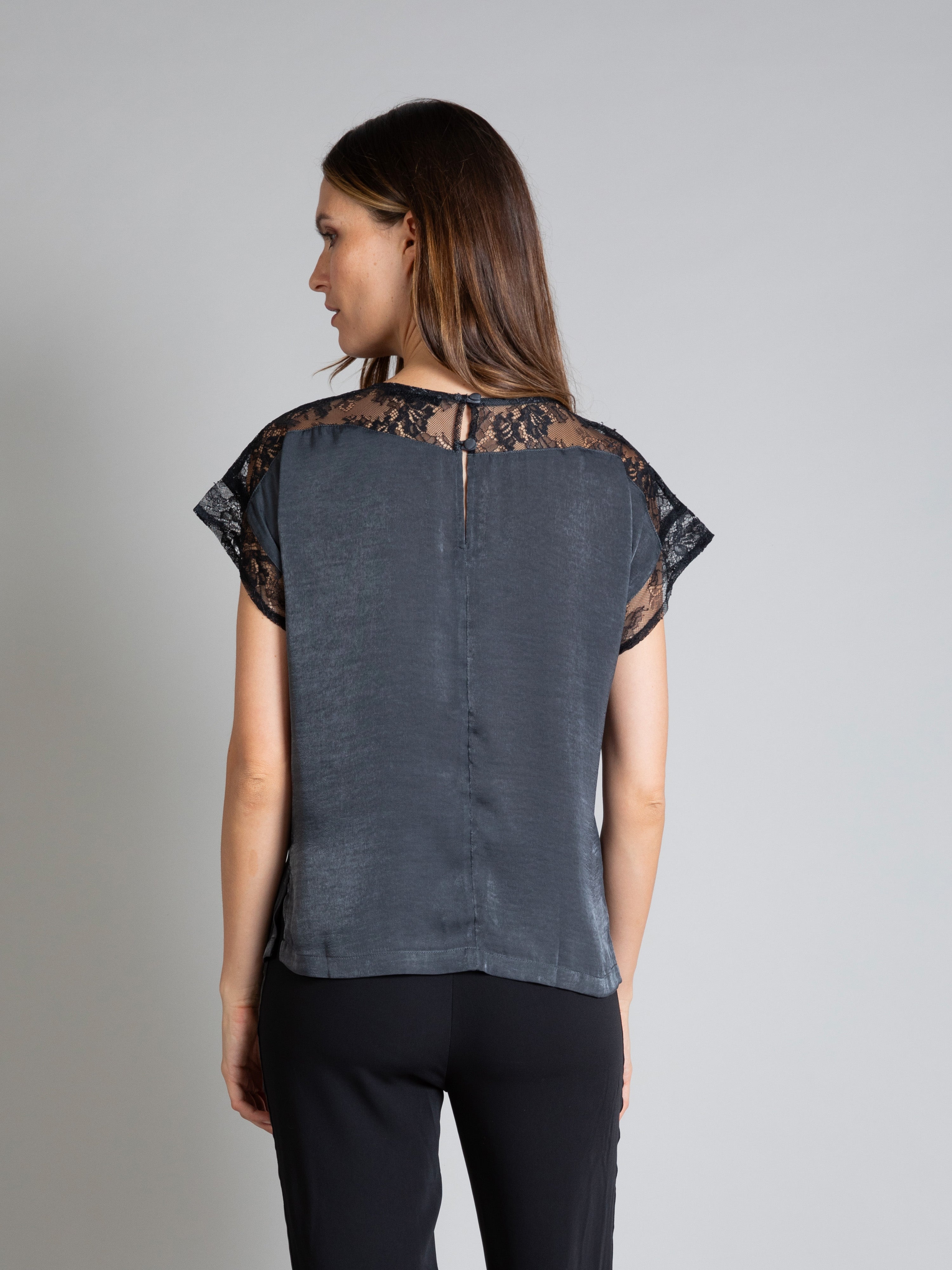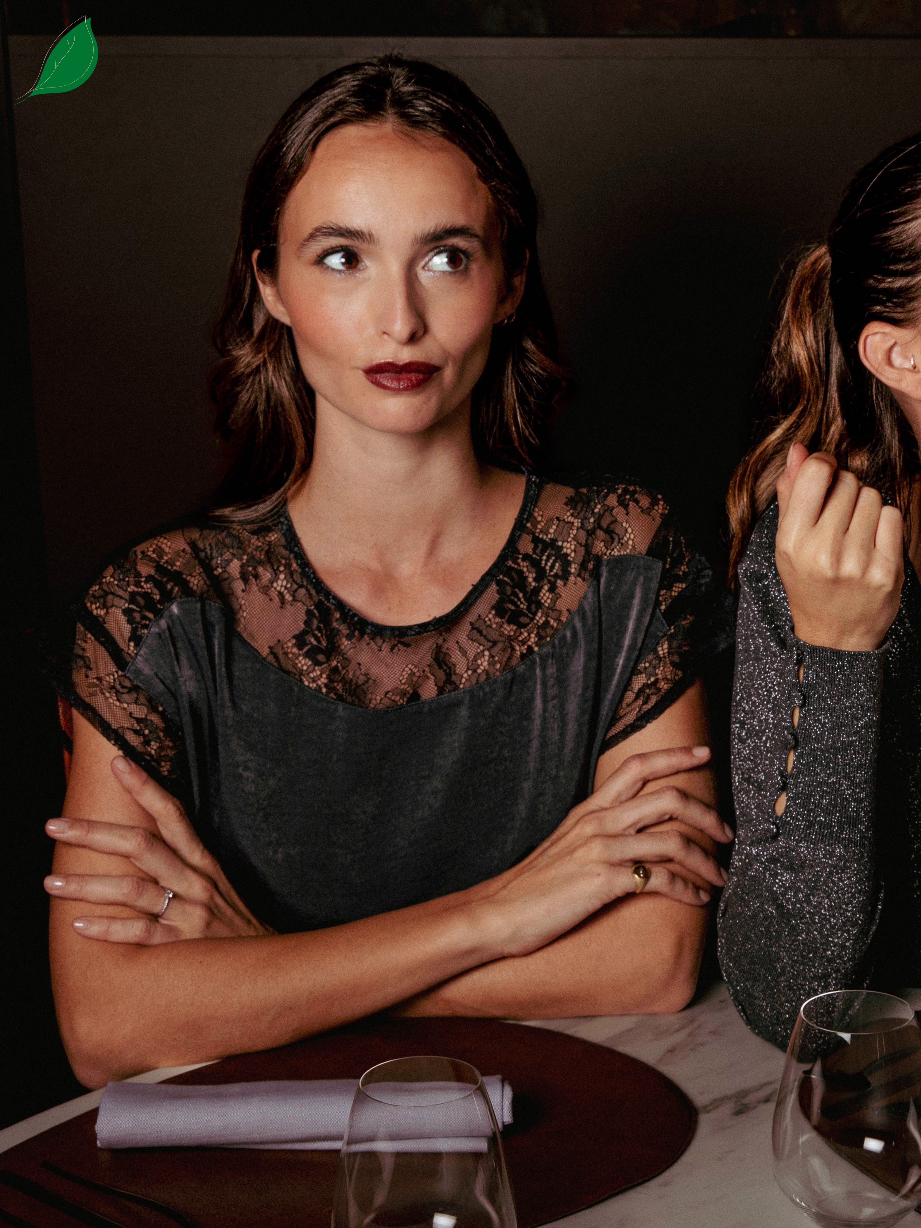 Ce top effet peau de pêche avec ses manches papillon en dentelle est un véritable bijou de féminité. Idéal pour une allure romantique et chic à souhait.