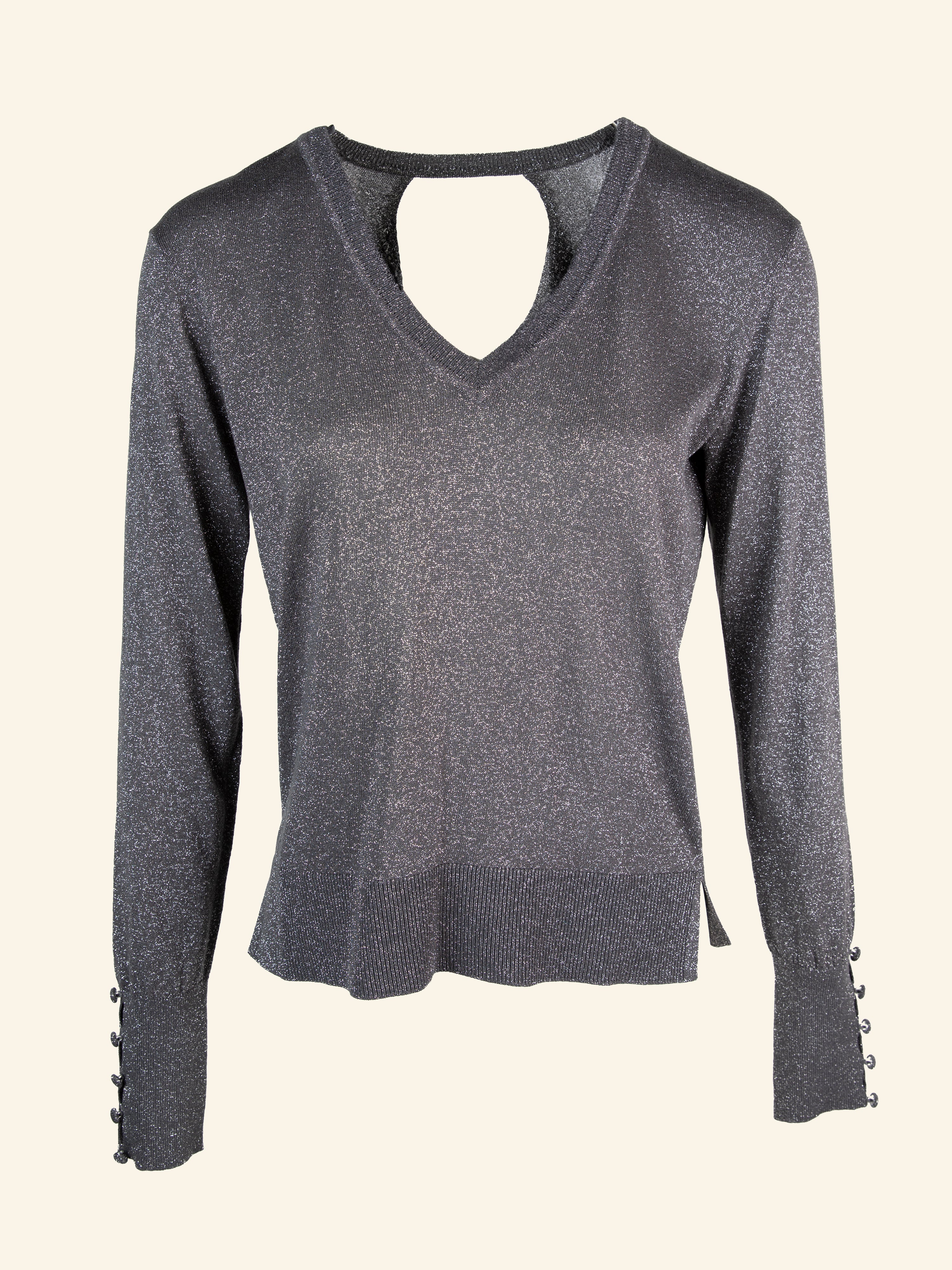 Brillez tout en élégance avec ce pull en lurex à encolure V et dos croisé. Sa coupe ajustée et ses poignets bord-côtes en font un indispensable pour des looks festifs et cosy.
