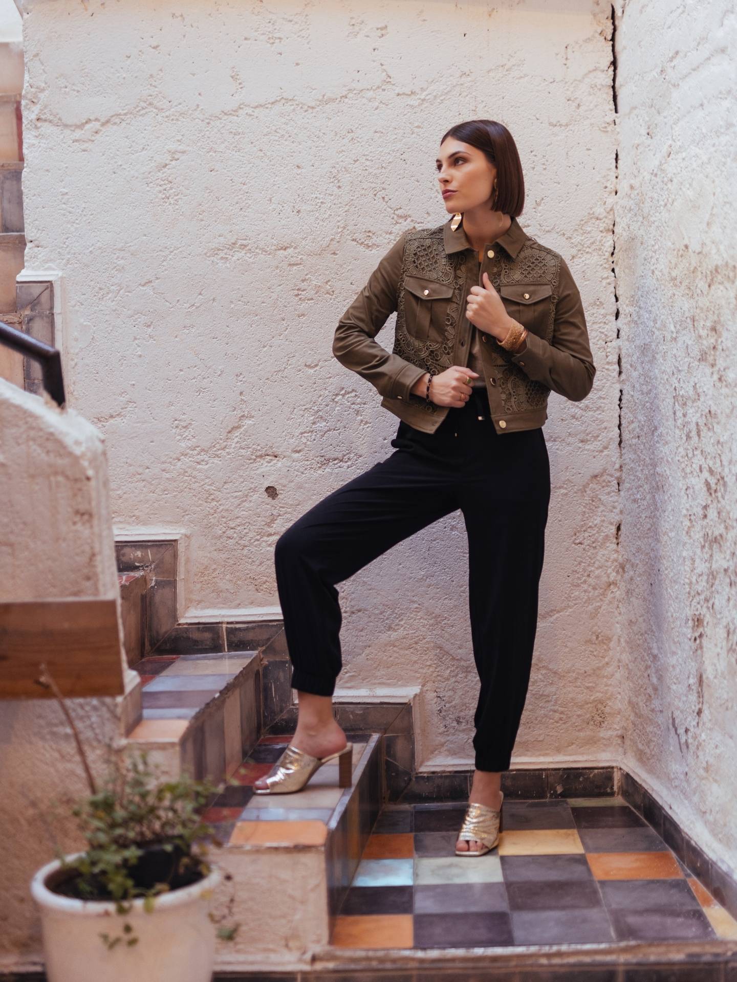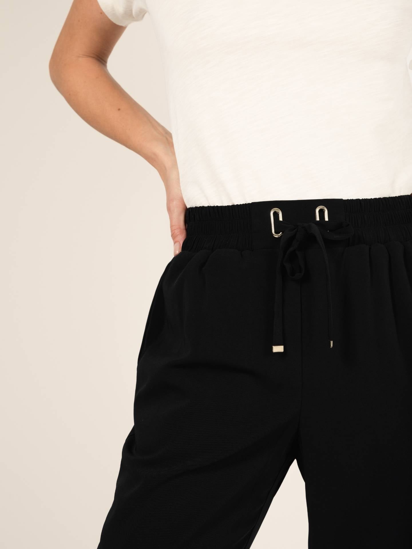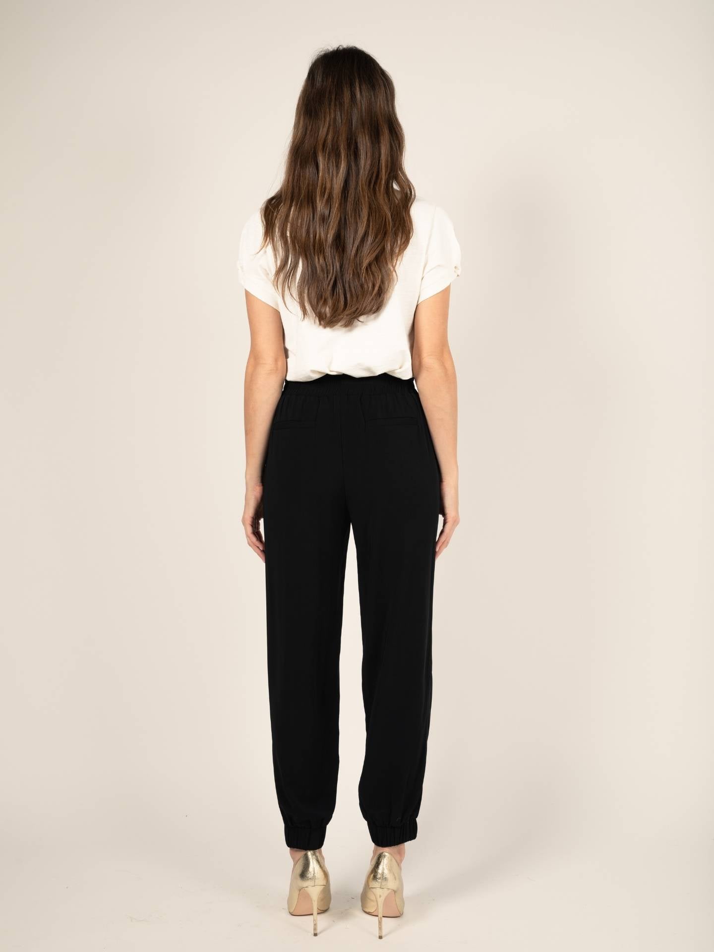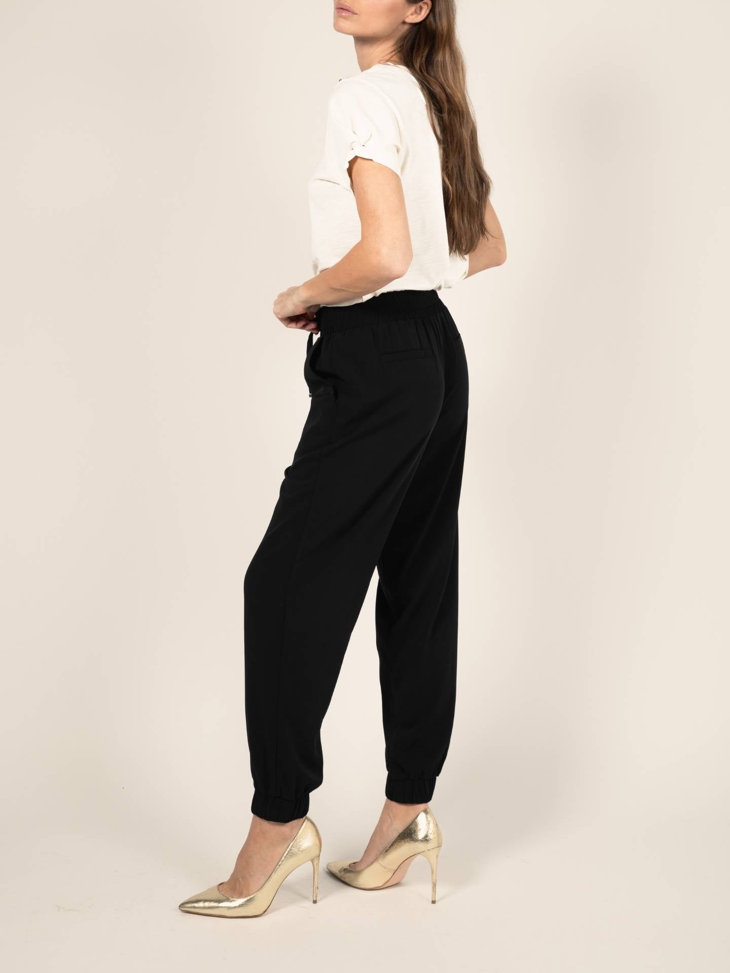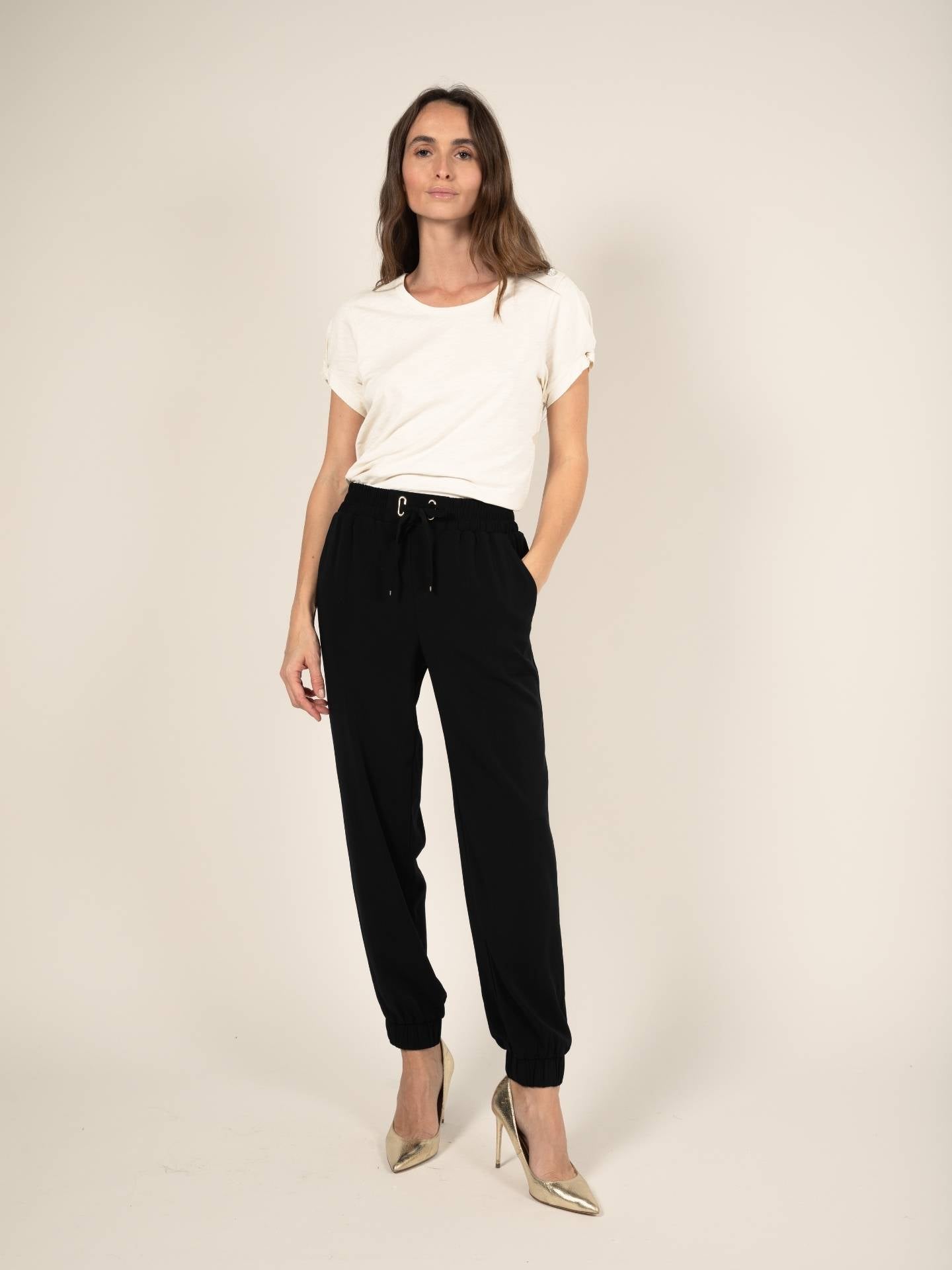 Entre confort et style : le pantalon sporty chic. Sa taille élastiquée et ses détails métalliques allient modernité et praticité.