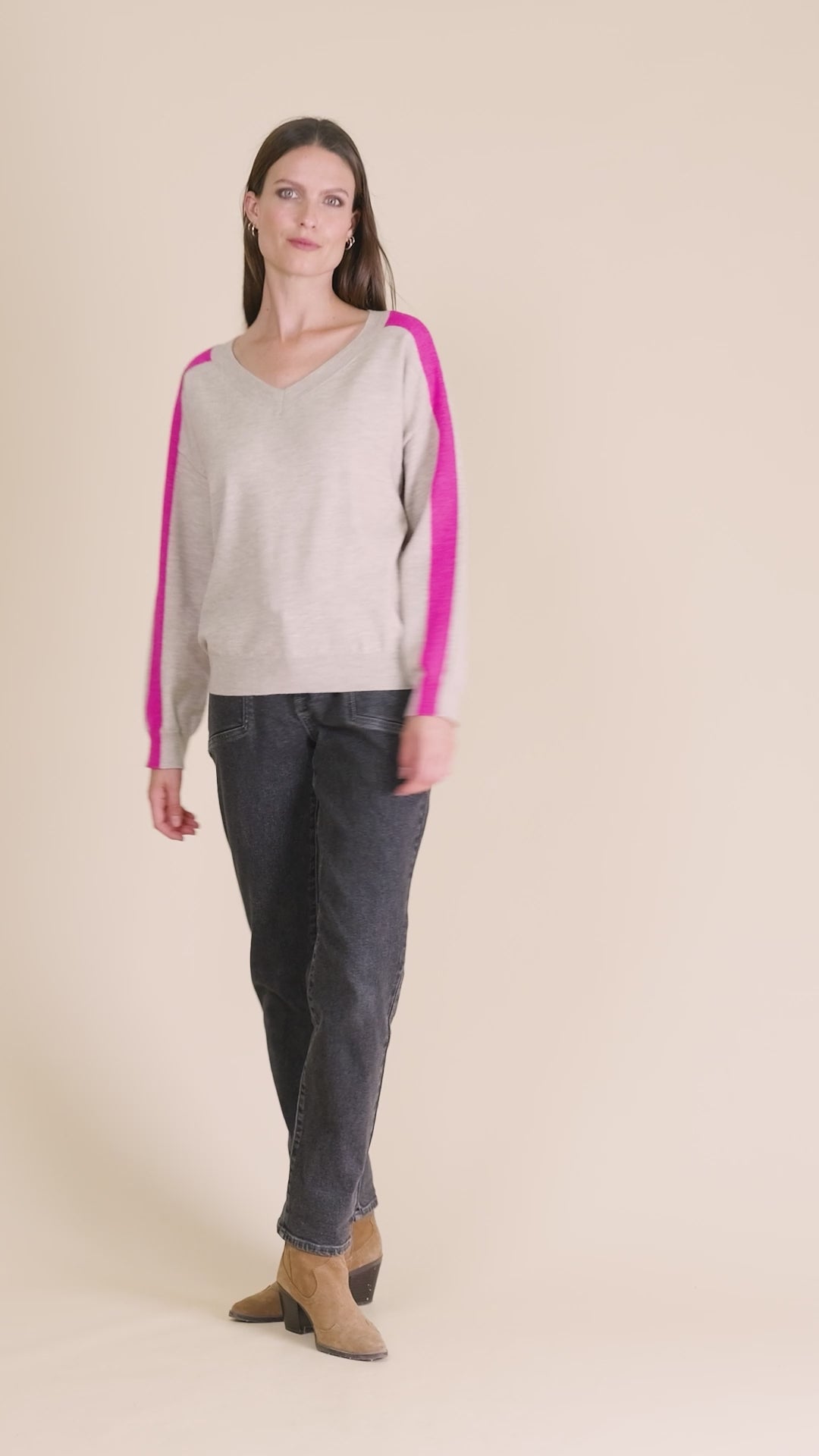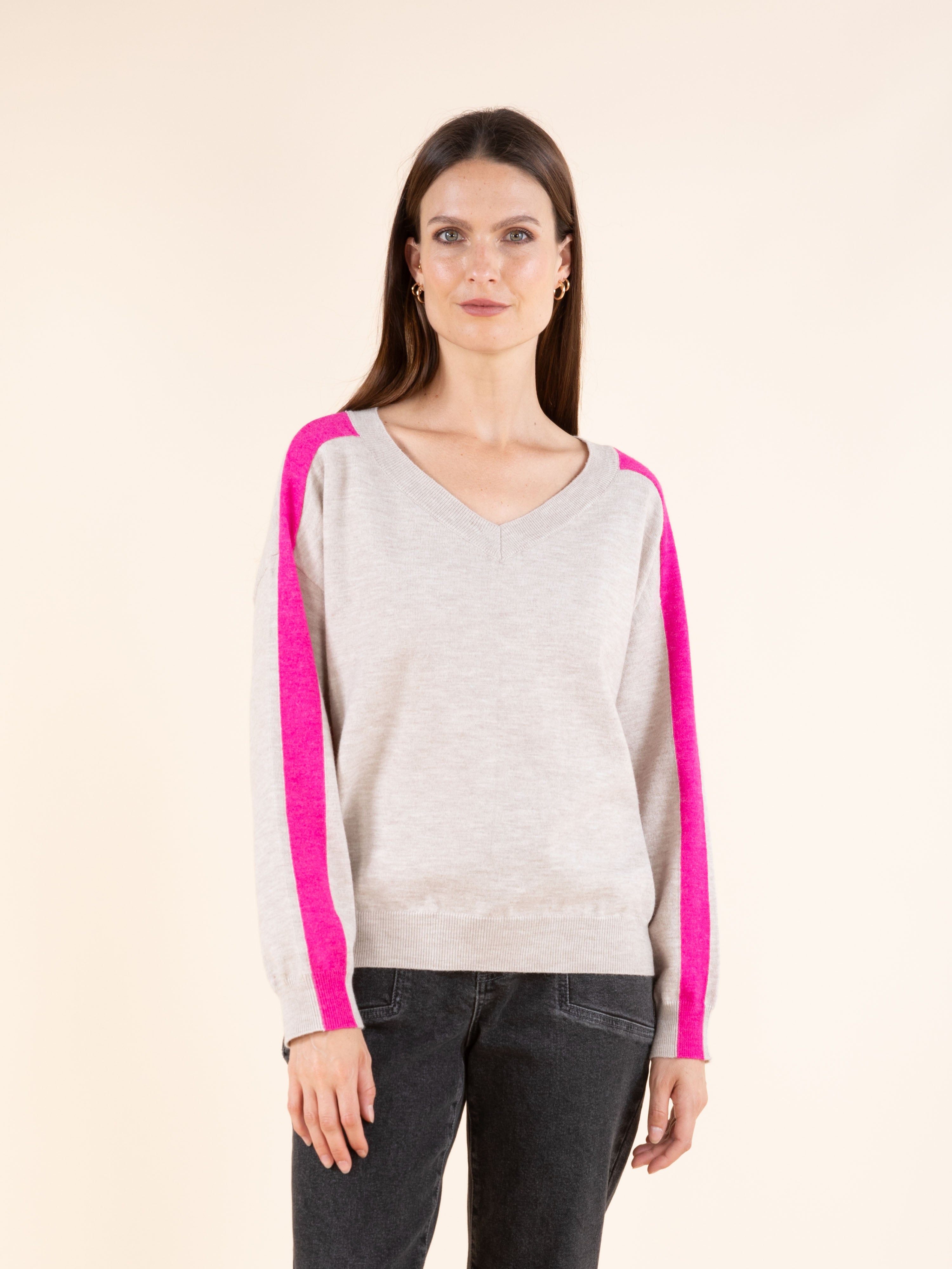 Adoptez ce pull col V avec bandes contrastées, parfait pour apporter une touche graphique à votre look.