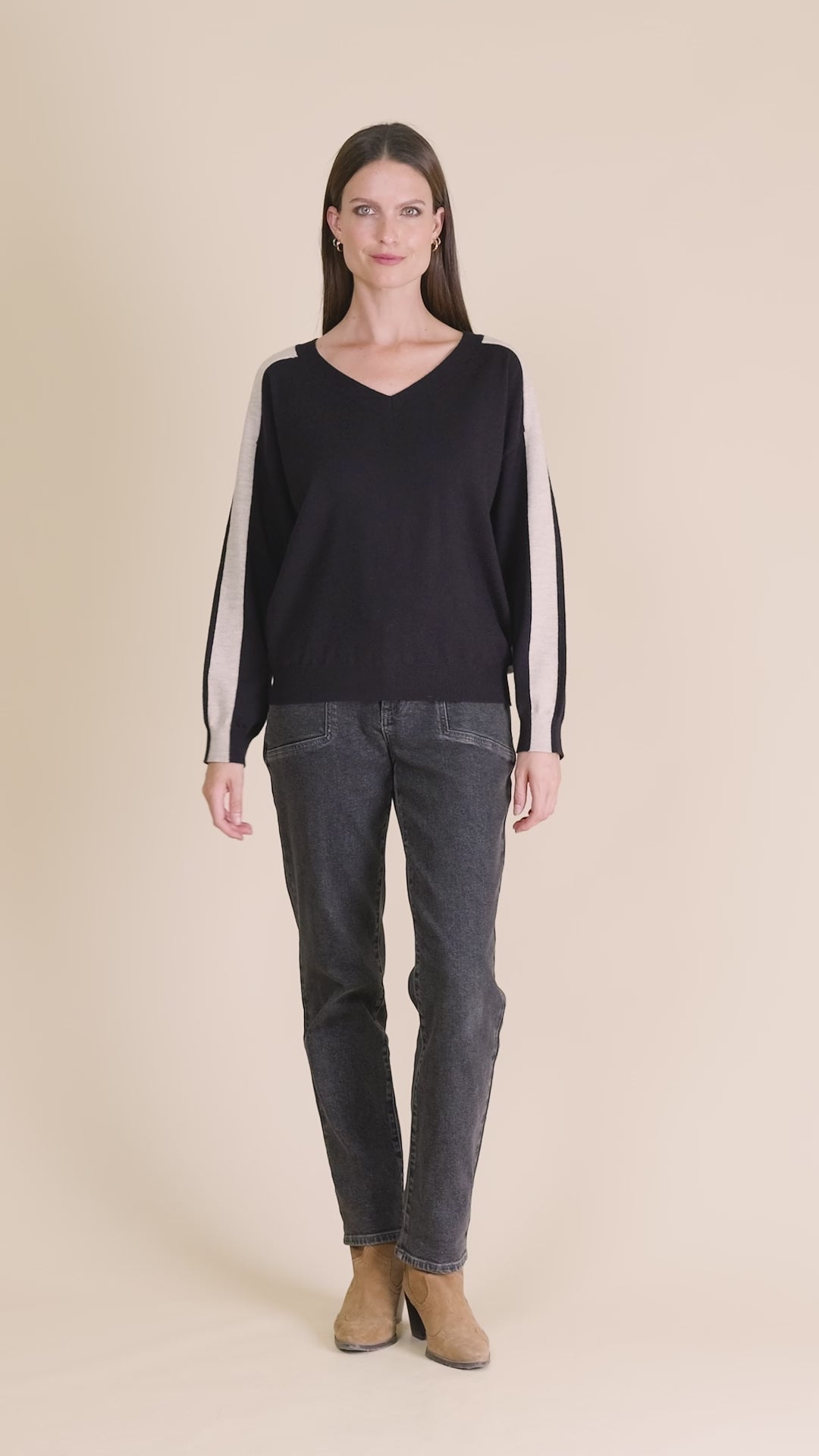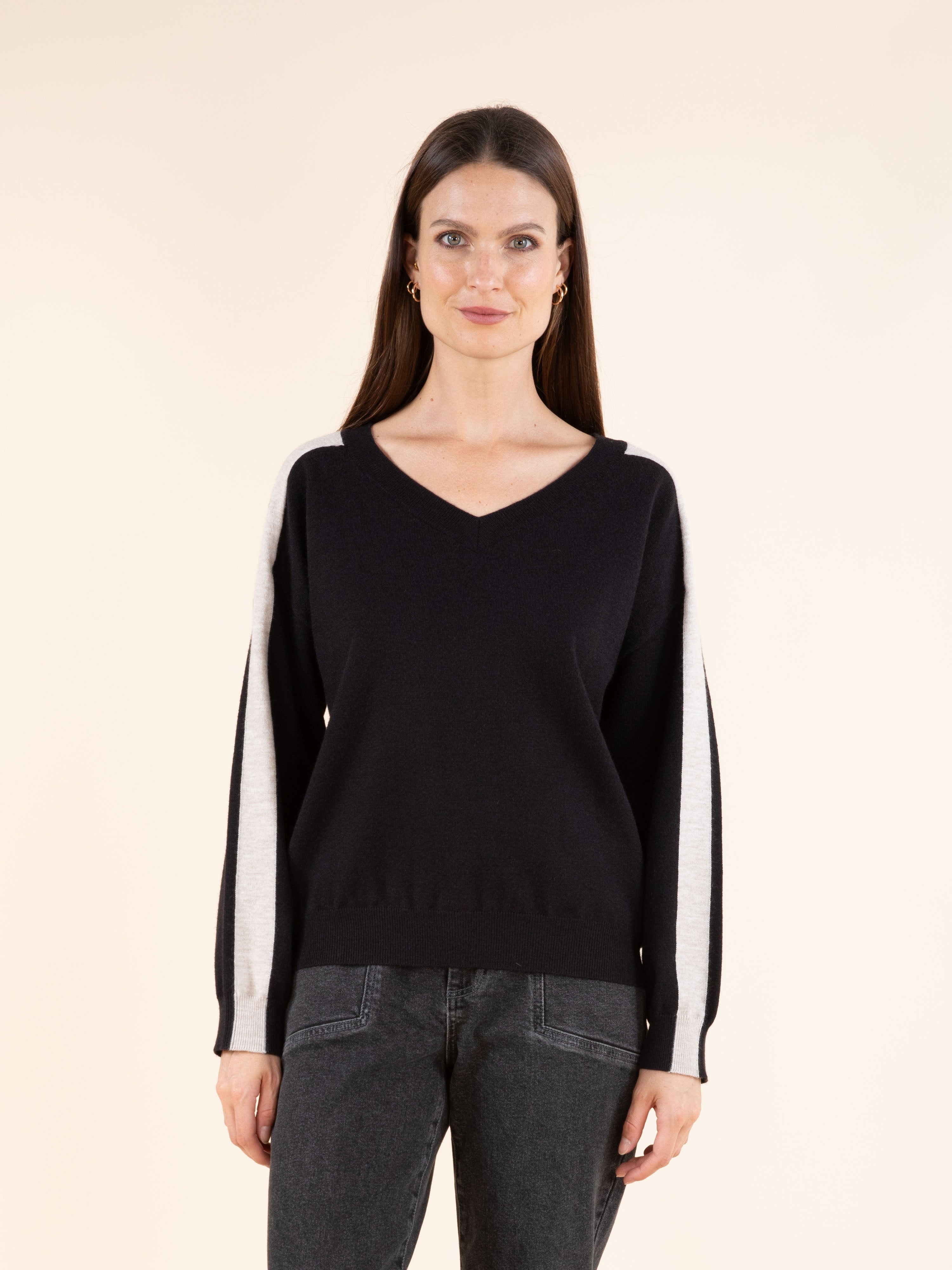 Adoptez ce pull col V avec bandes contrastées, parfait pour apporter une touche graphique à votre look.
