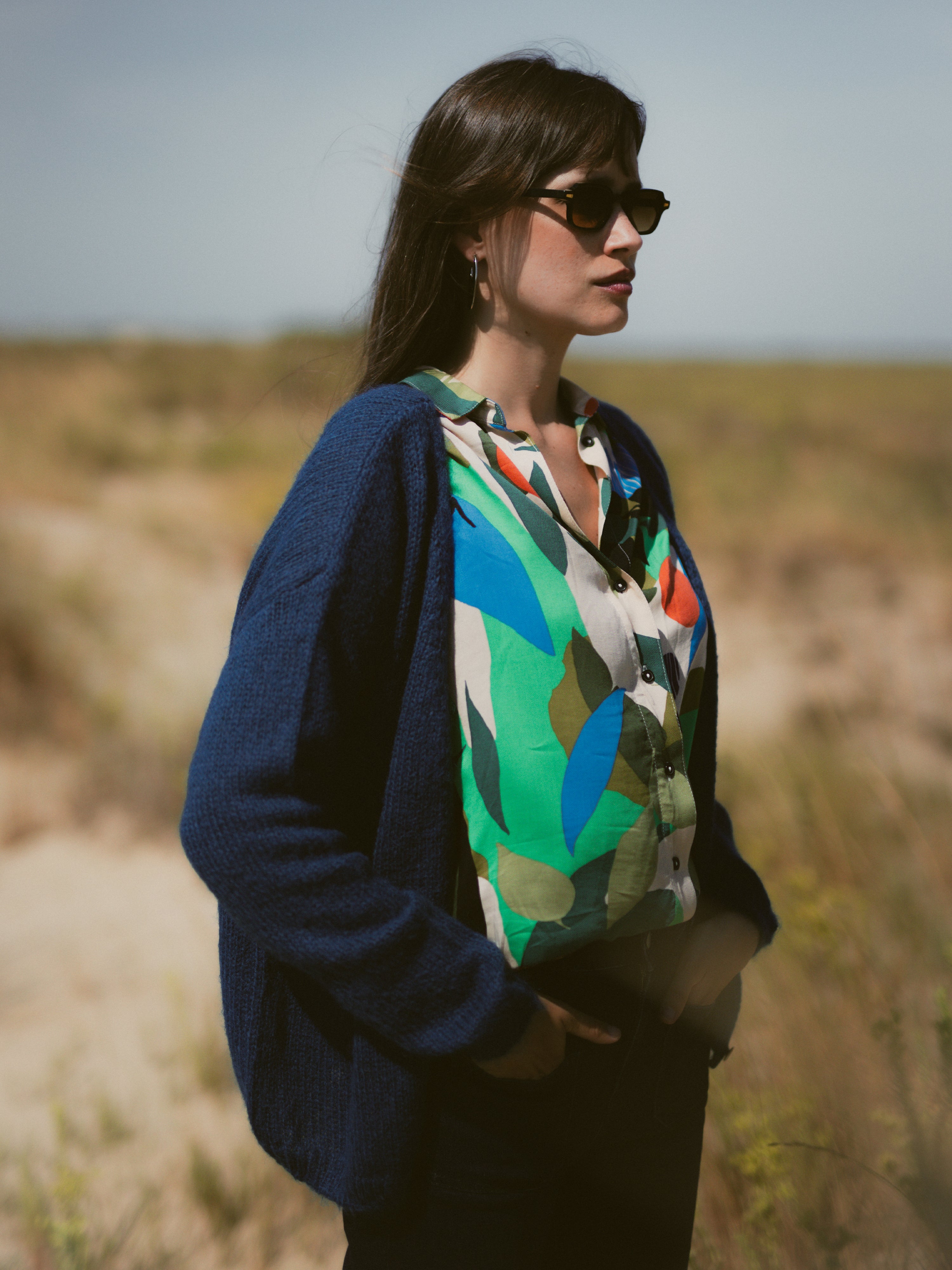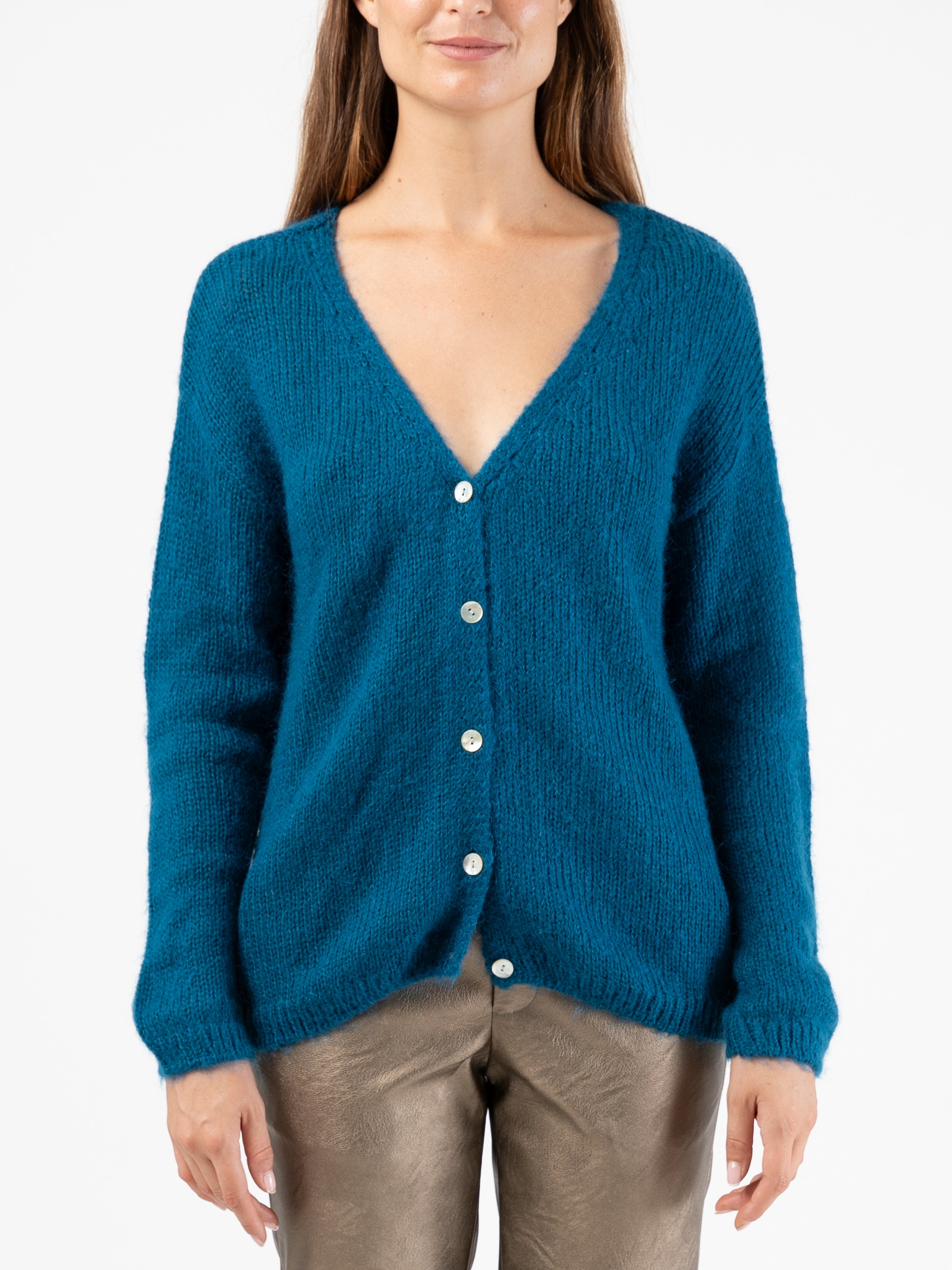Ce cardigan boutonné en nacre allie simplicité et chic pour un style polyvalent. Idéal pour superposer, sa coupe droite et ses épaules tombantes apportent une allure décontractée et raffinée.