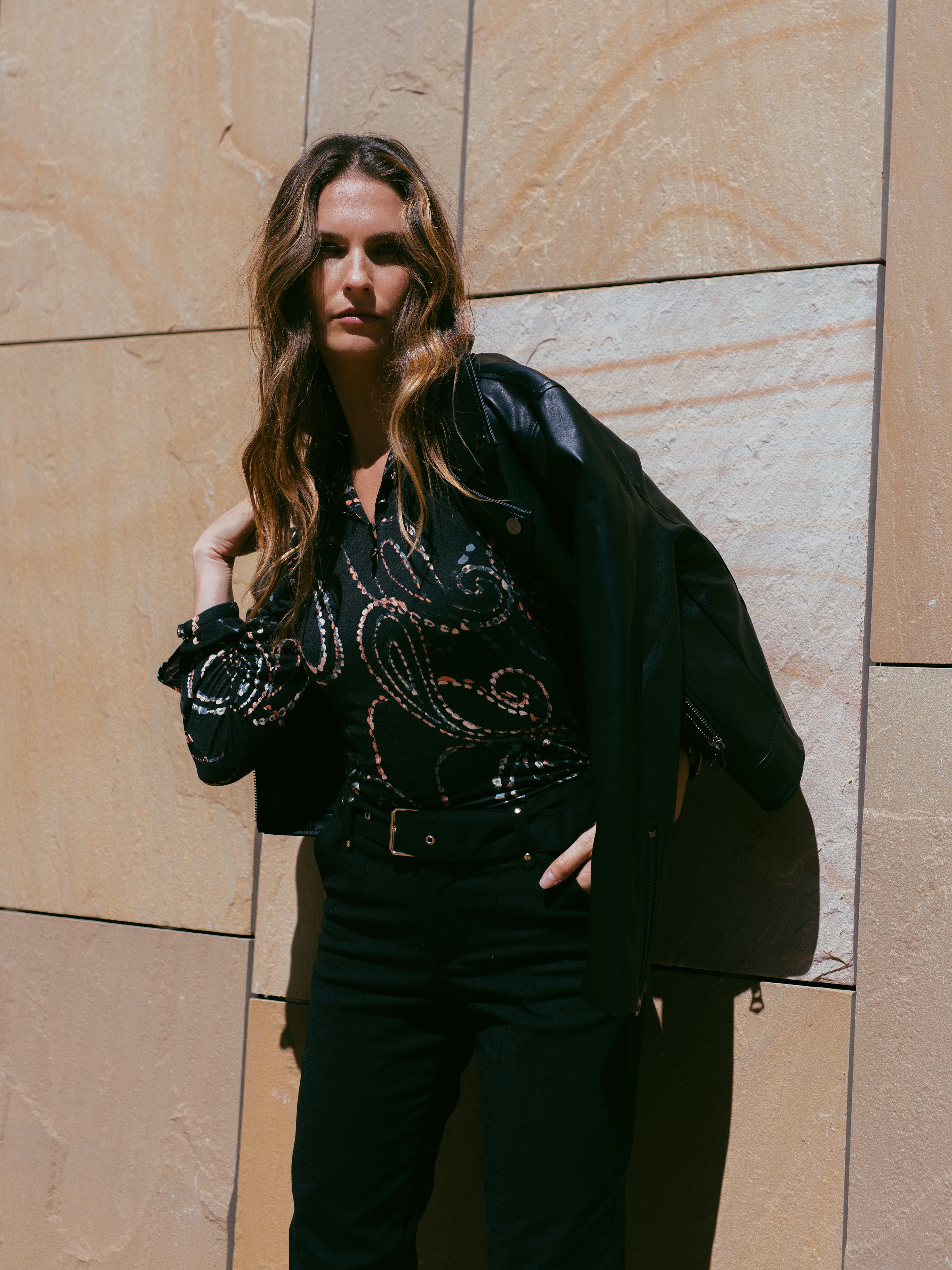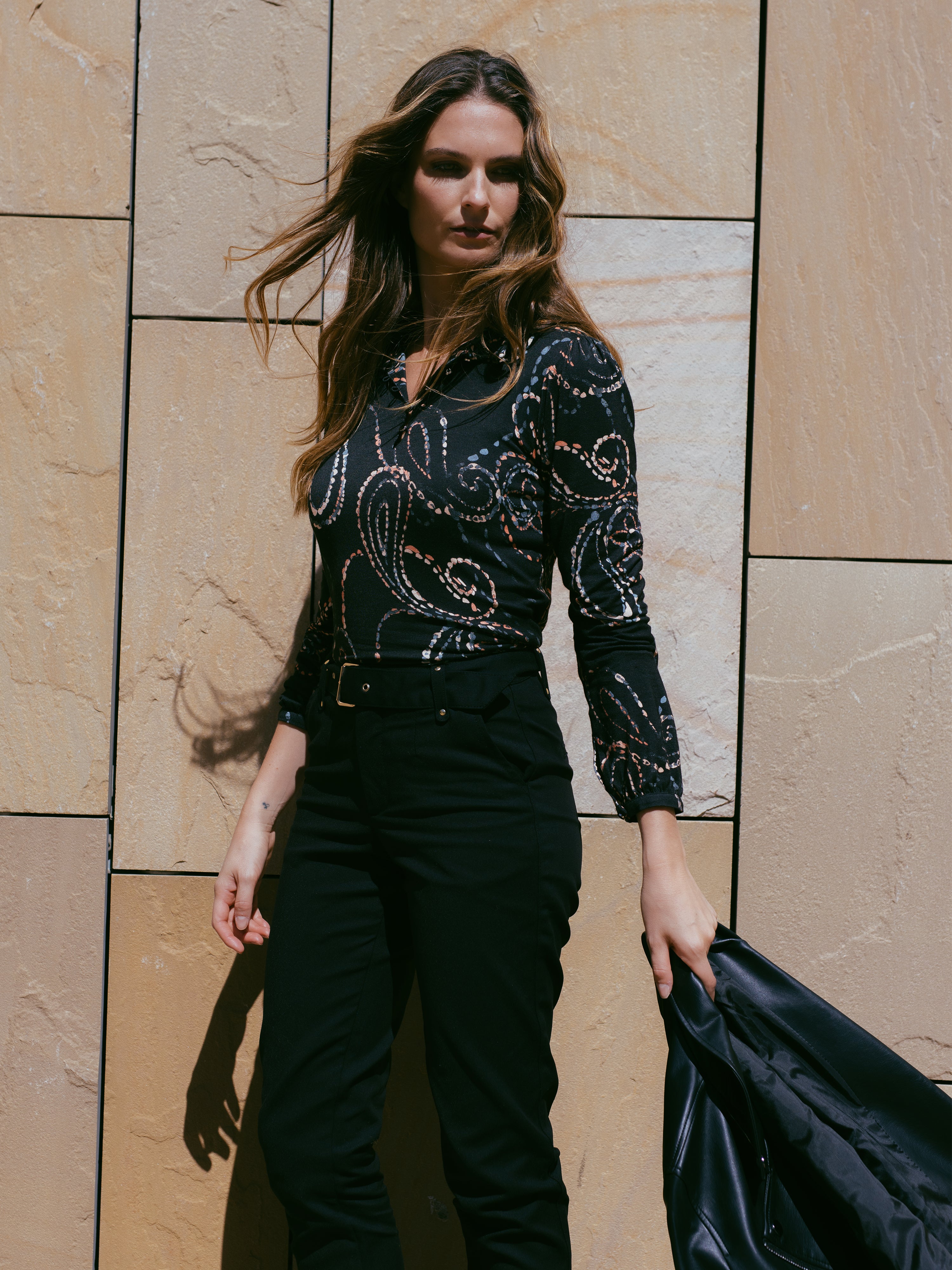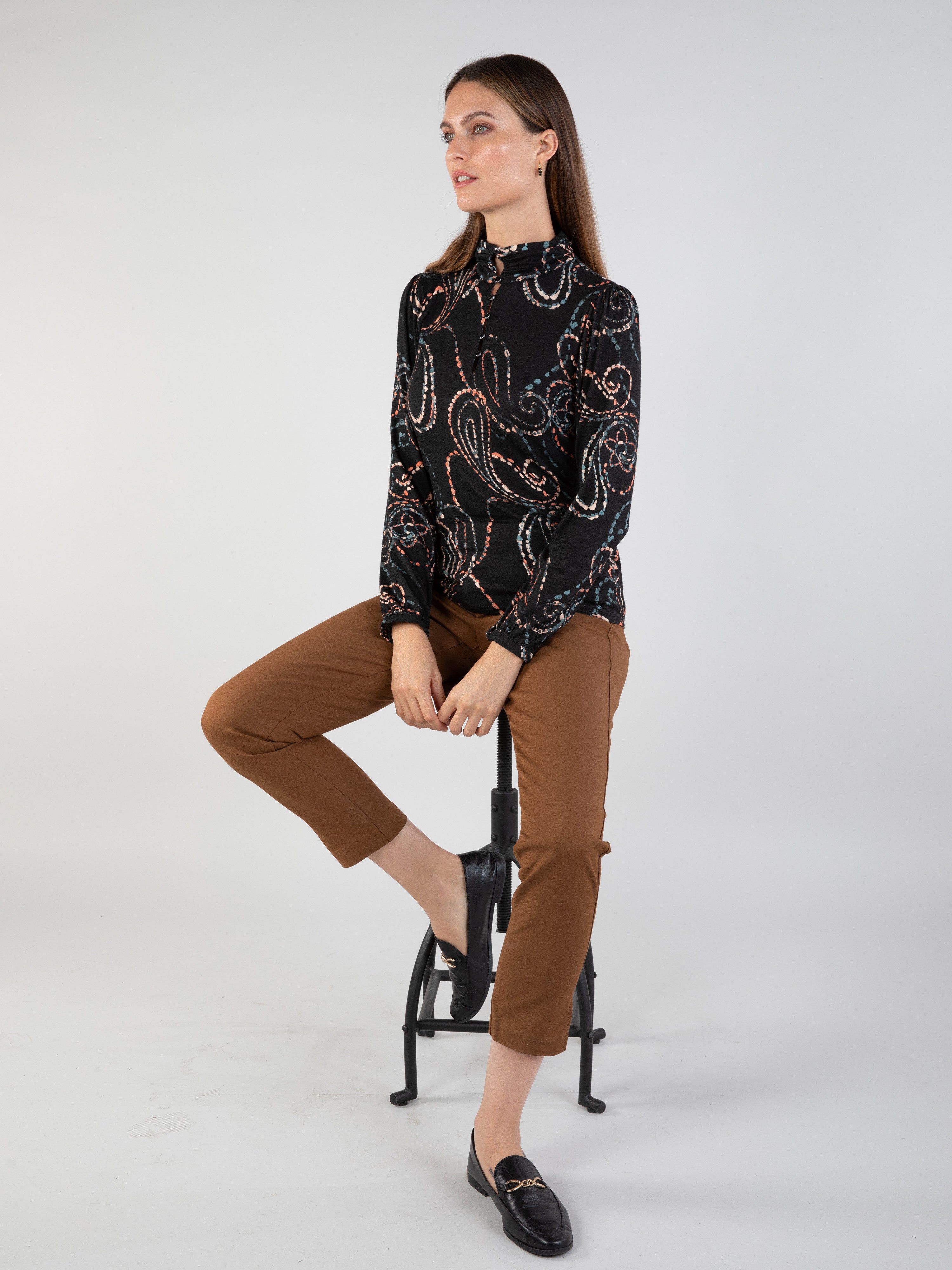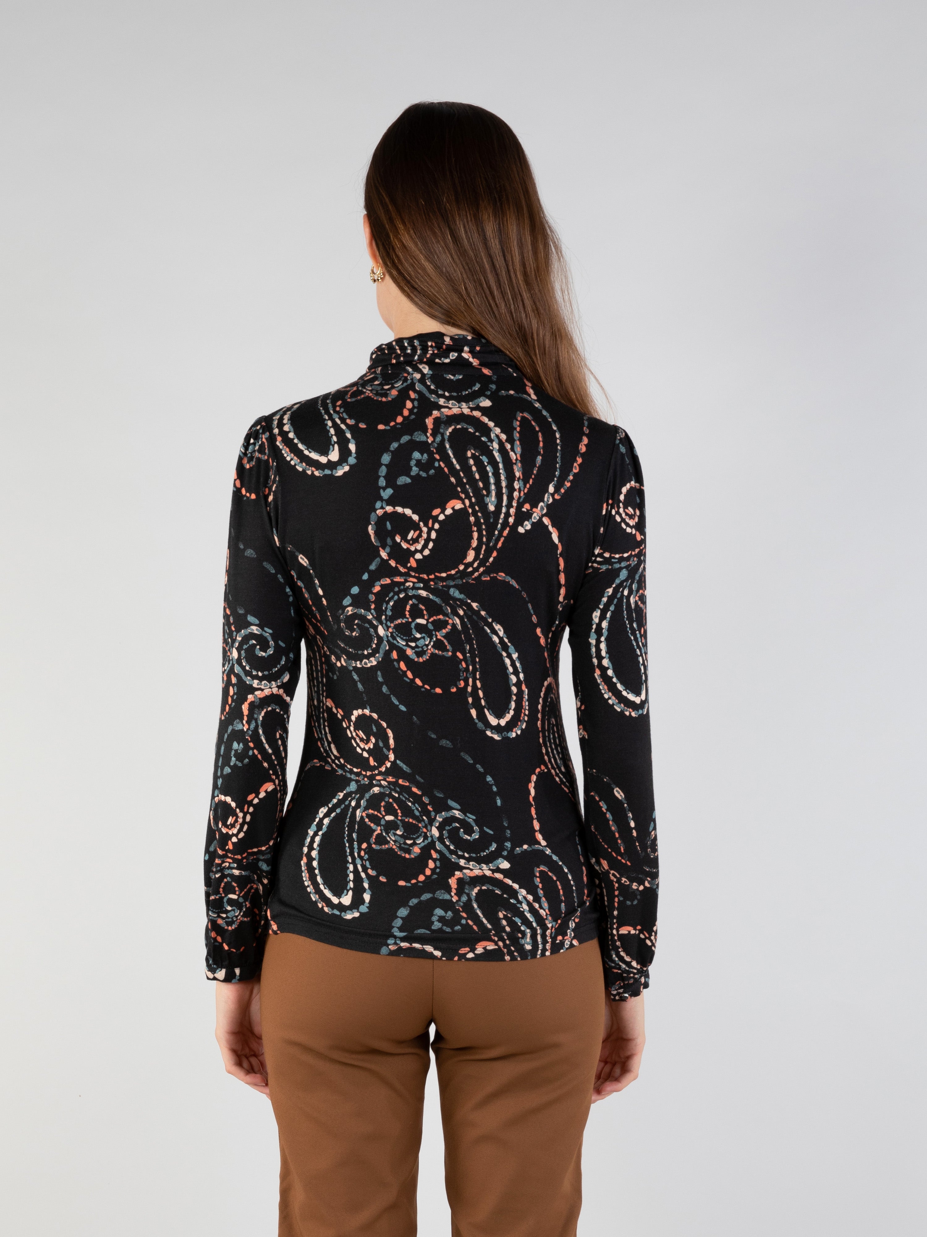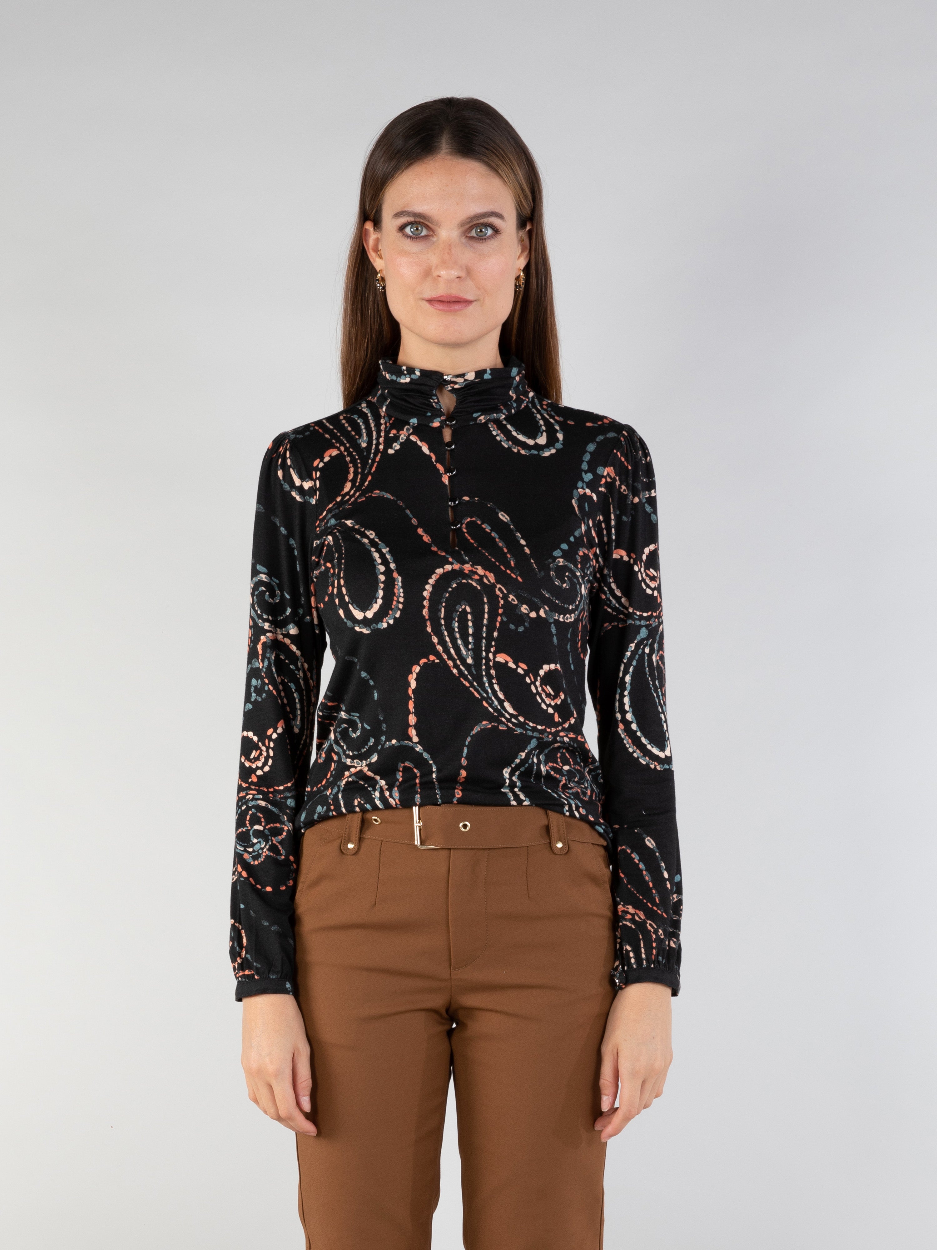 Le t-shirt qui sort du lot ! Son col montant plissé et ses petits boutons élégants en font un indispensable pour un look sophistiqué. Imprimé tendance, manches longues et coupe ajustée : tout ce qu’il vous faut pour un style affirmé, jour comme nuit.