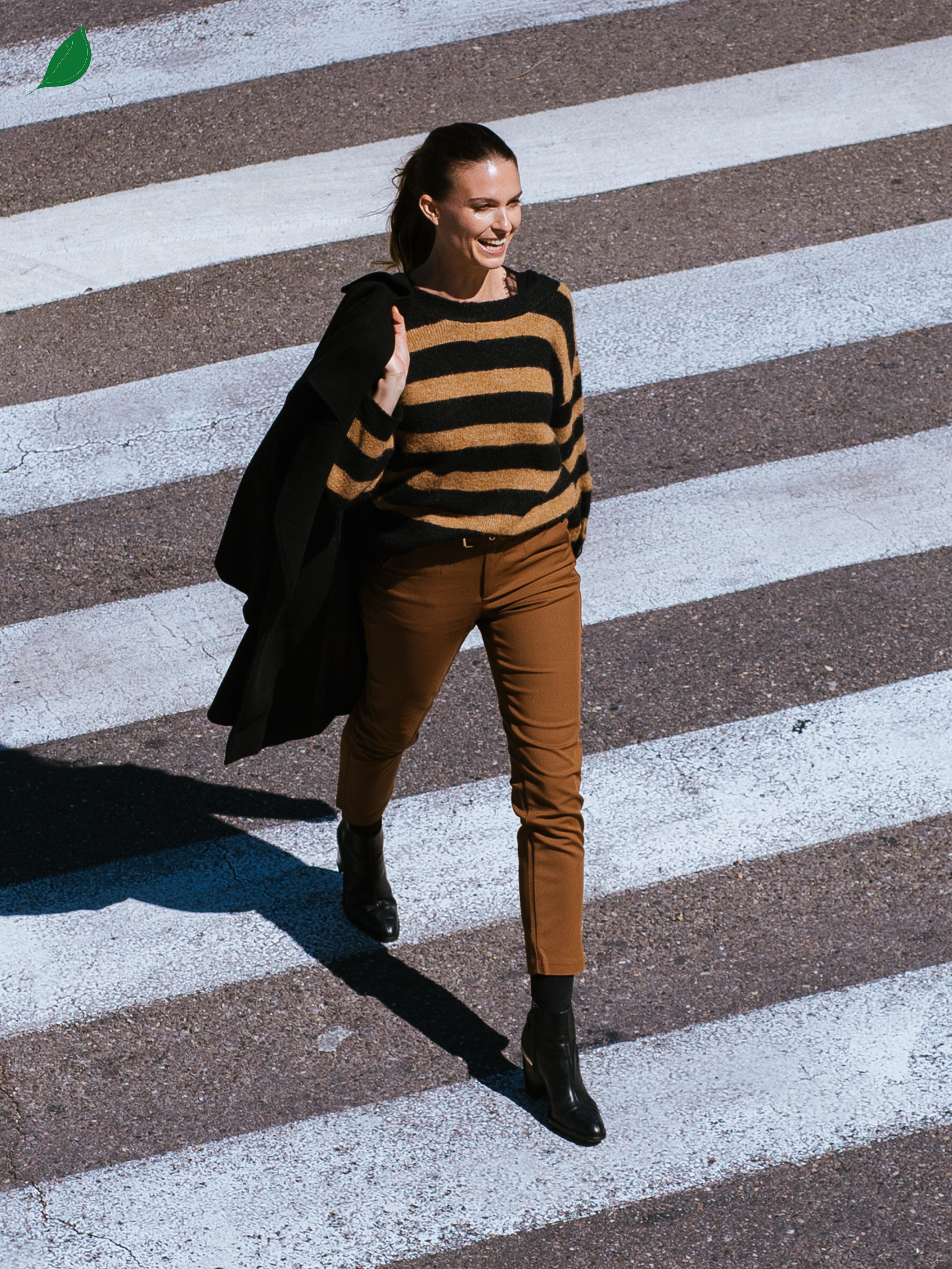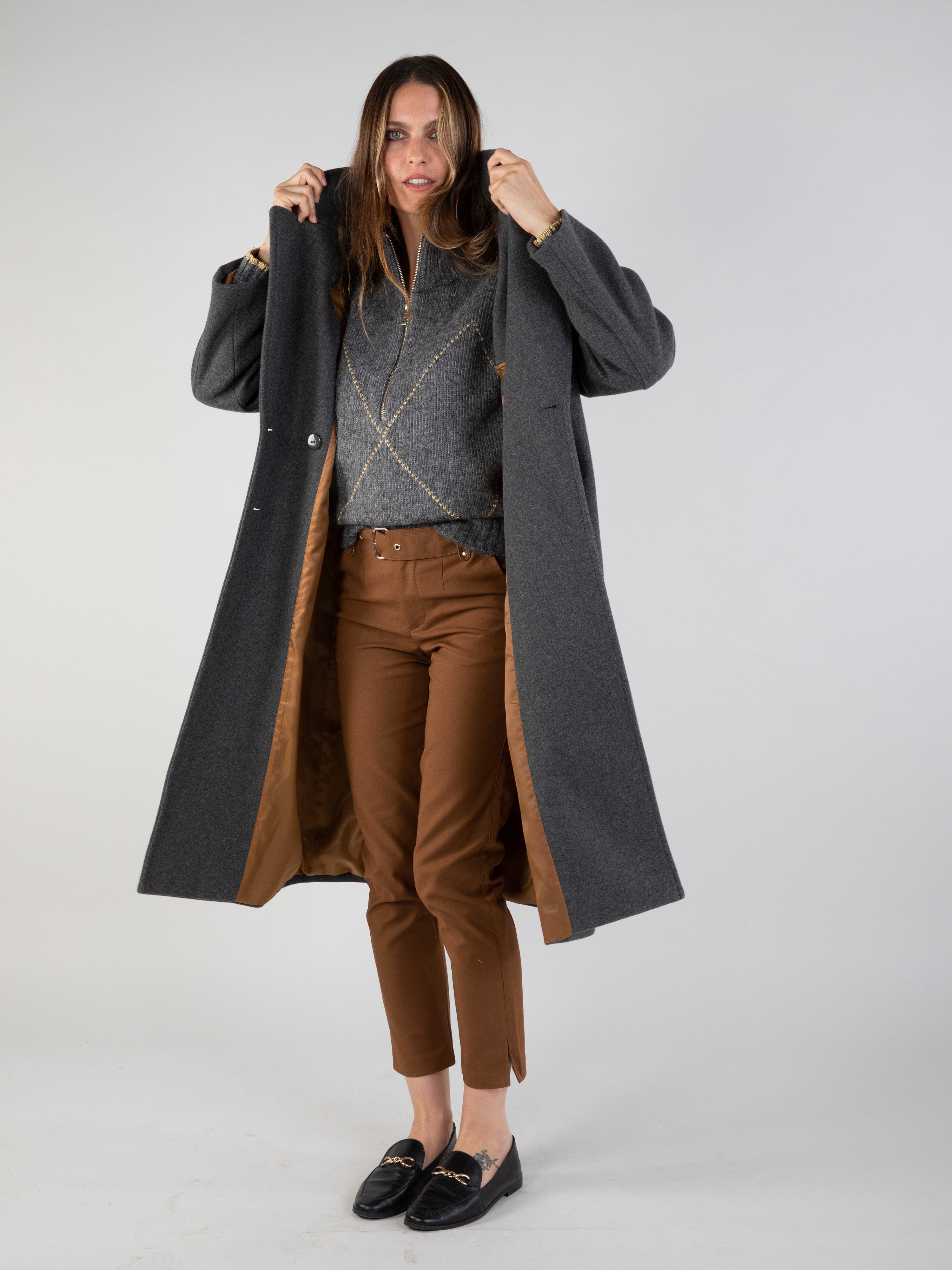 Pour un porté confort, nous vous conseillons de prendre une taille au dessus de votre taille habituelle. Johanna mesure 1,74m et porte une taille 34.