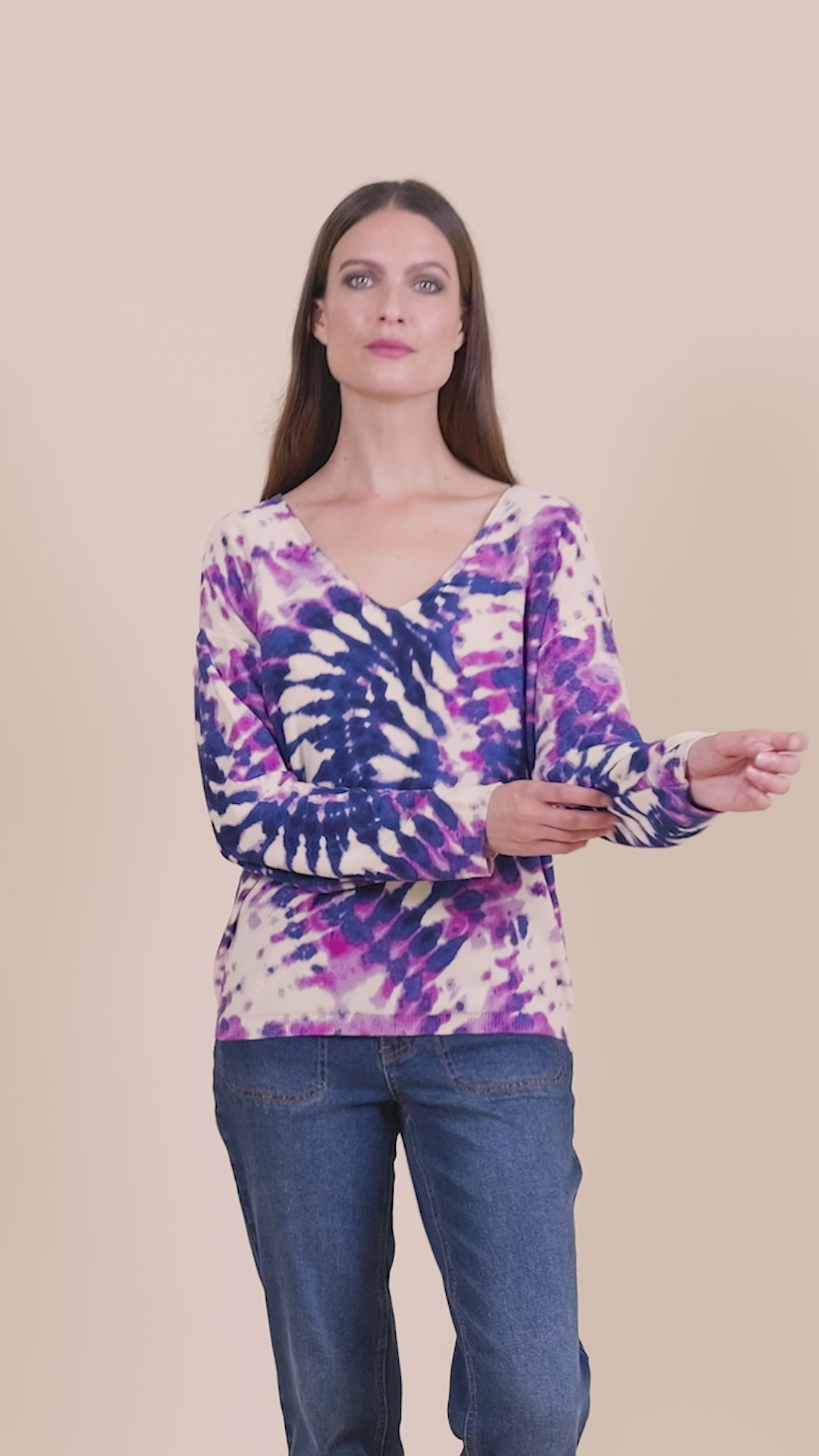 Craquez pour ce pull tie & dye à encolure V, parfait pour une allure décontractée et tendance avec sa coupe V et ses finitions en bord-côte.
