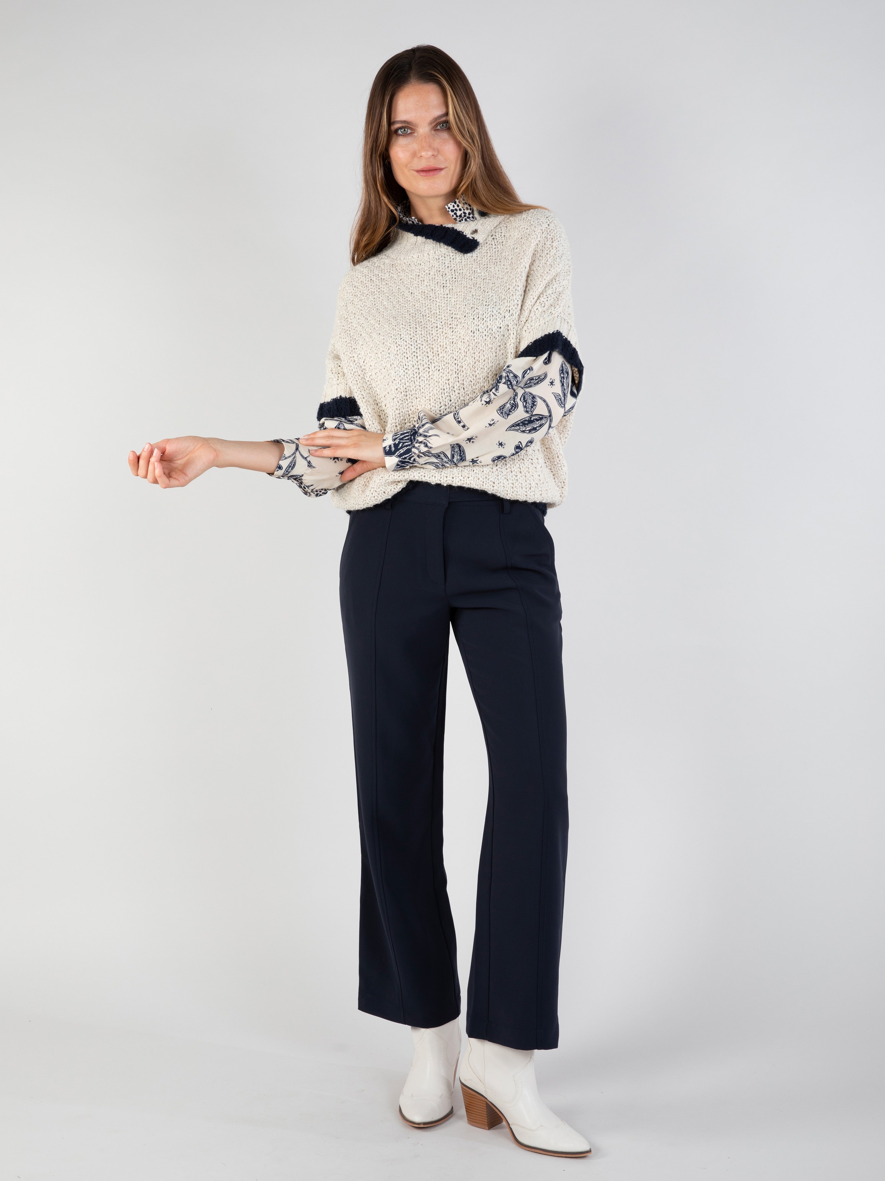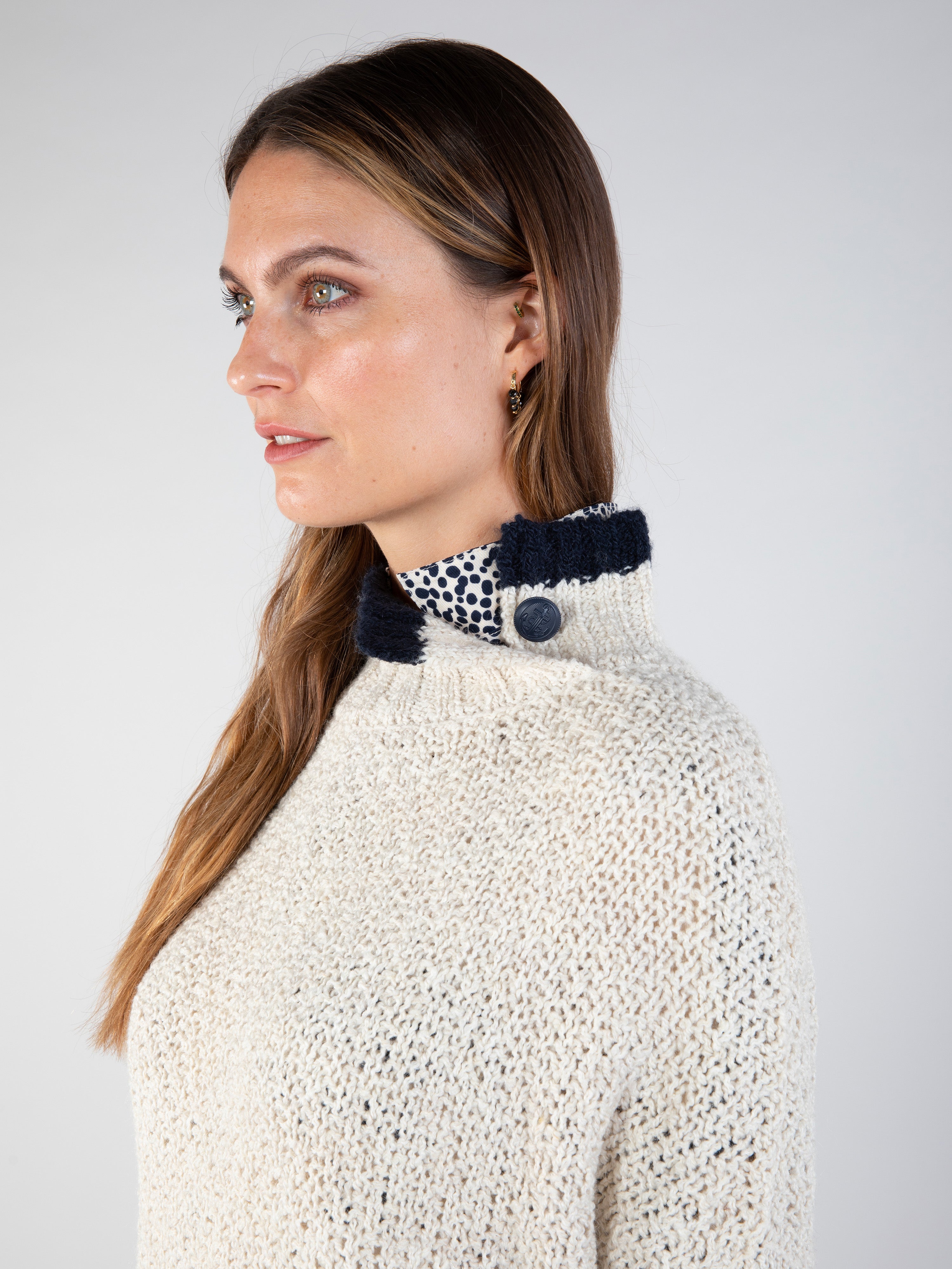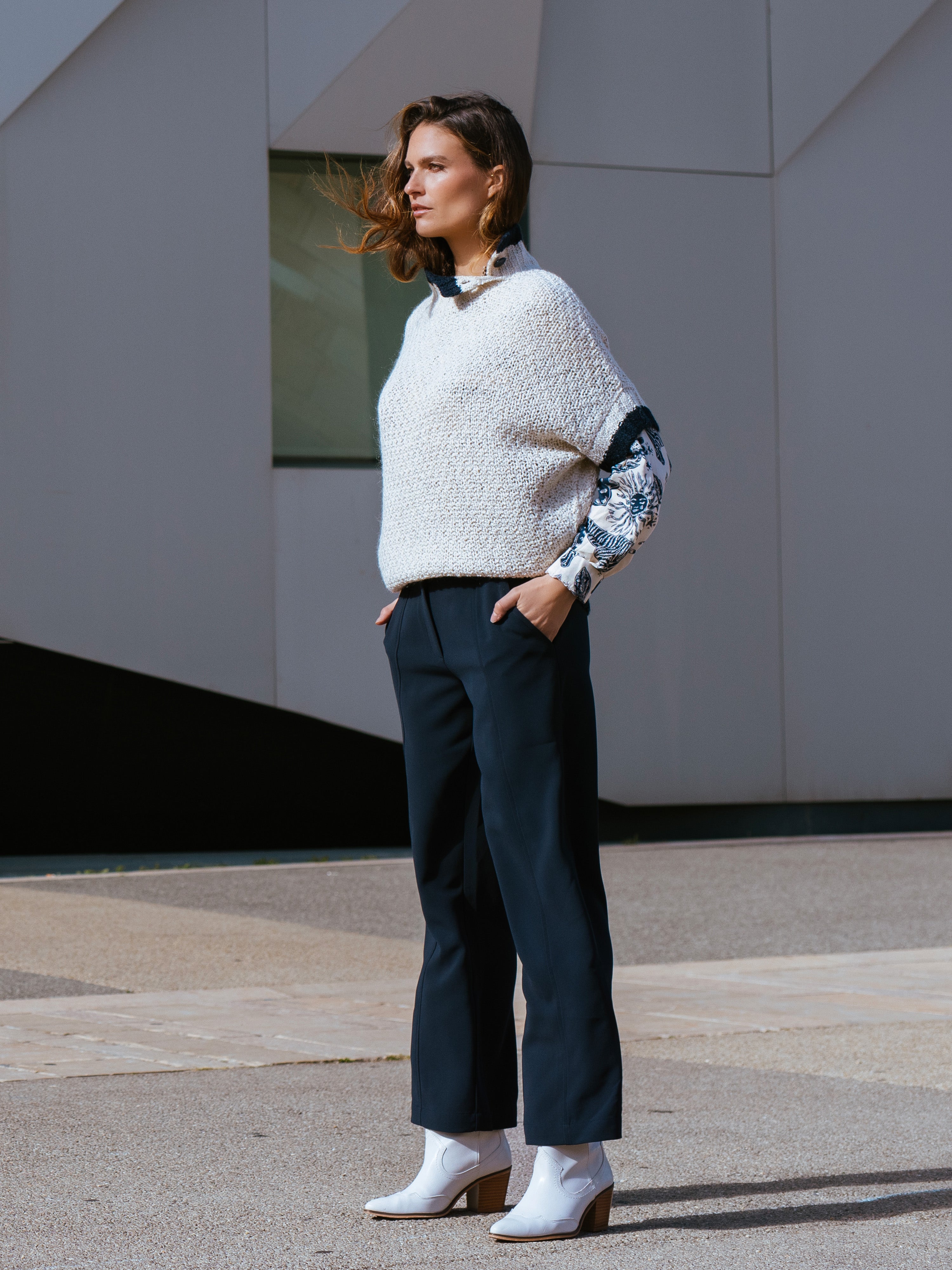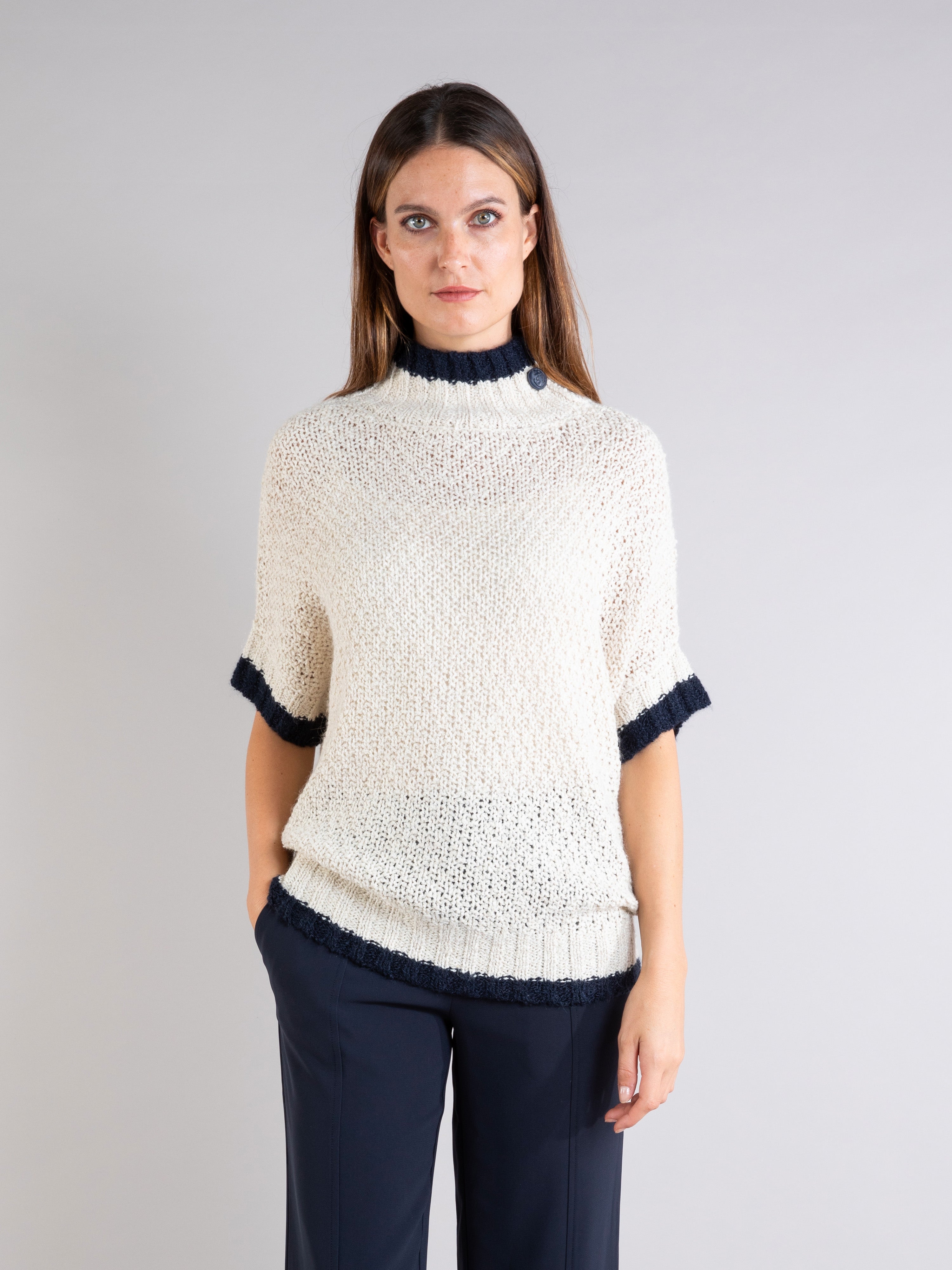 Ce pull à manches courtes est la définition même du chic minimaliste. Avec son col montant orné d’un bouton métal et ses bandes contrastées, il transforme une tenue simple en véritable look de mode. Sa coupe ample et son effet chauve-souris offrent confort et allure sophistiquée.