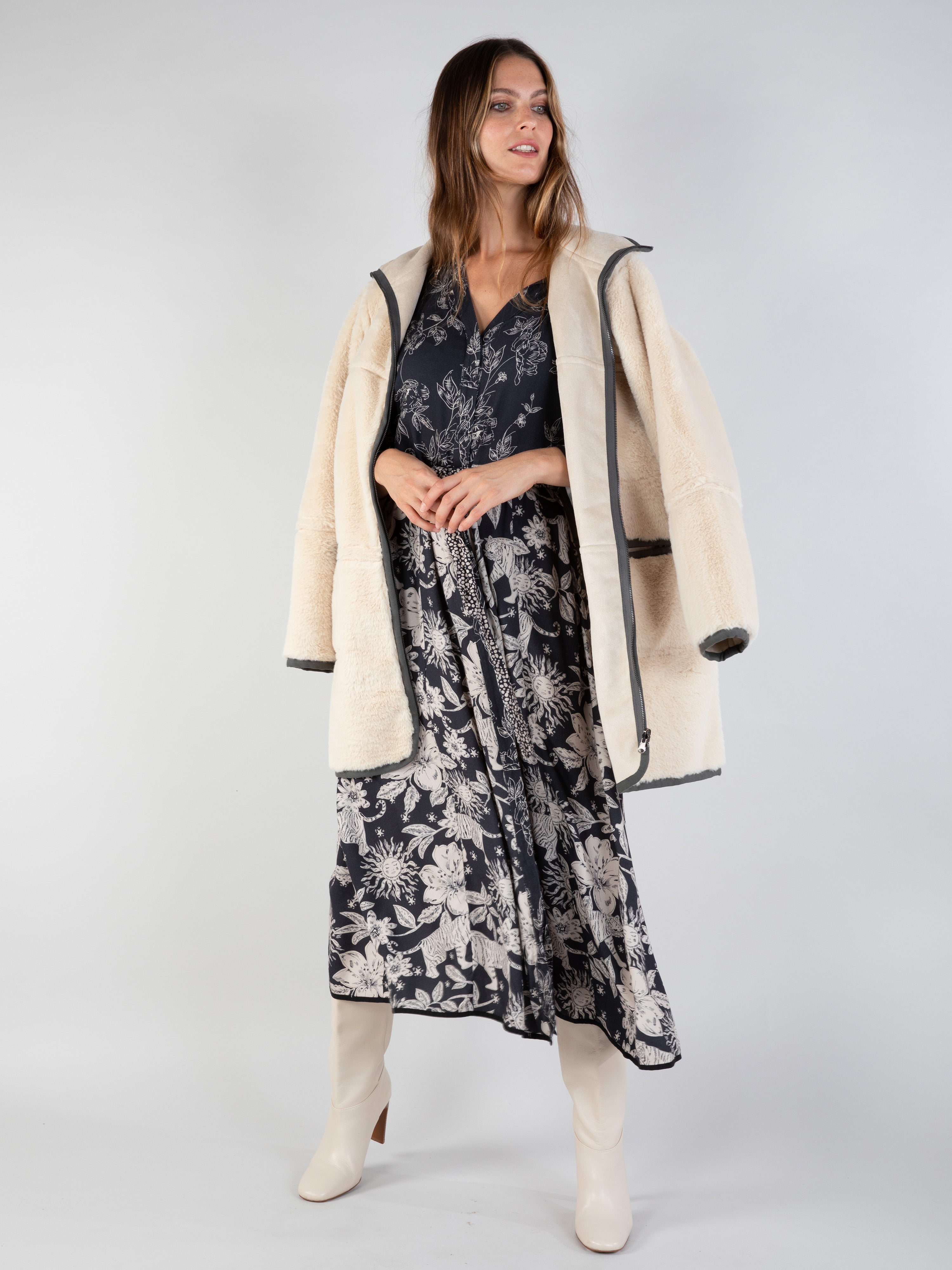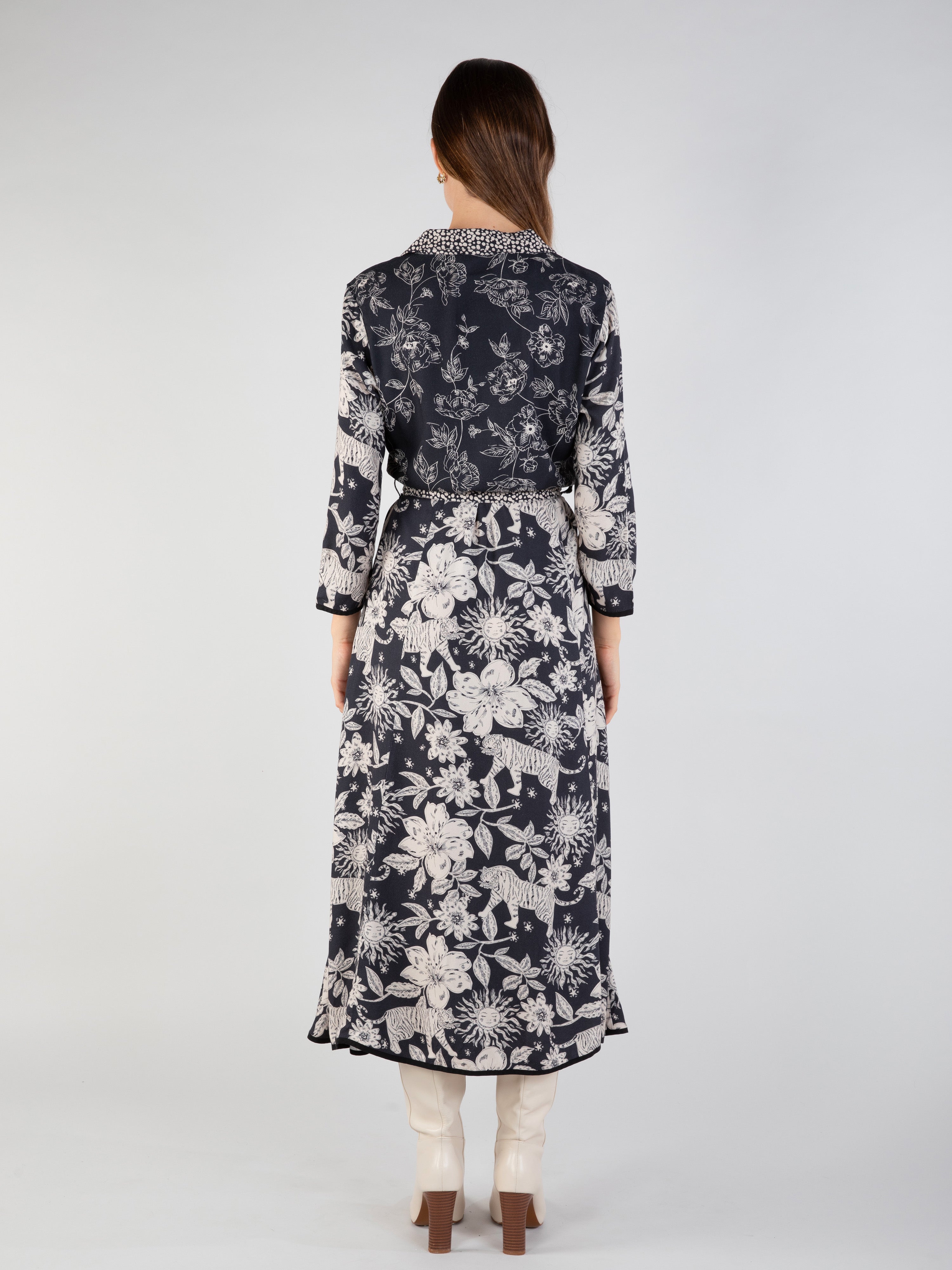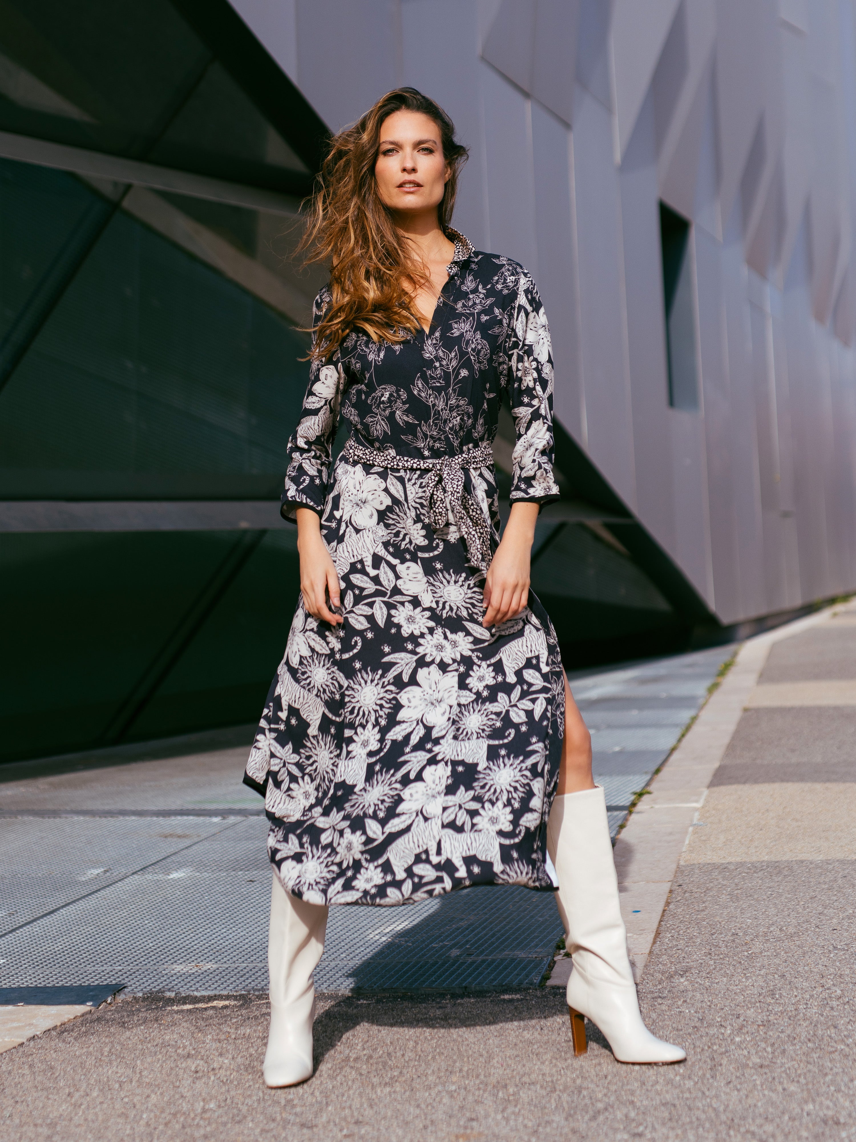 La robe chemise qu’il vous faut absolument ! Mix d’imprimés audacieux, ceinture amovible pour marquer la taille et coupe évasée en bas pour un effet wahou. Ses manches 3/4 et son boutonnage caché ajoutent une touche d’élégance subtile. À porter avec des bottes pour un look chic et tendance !