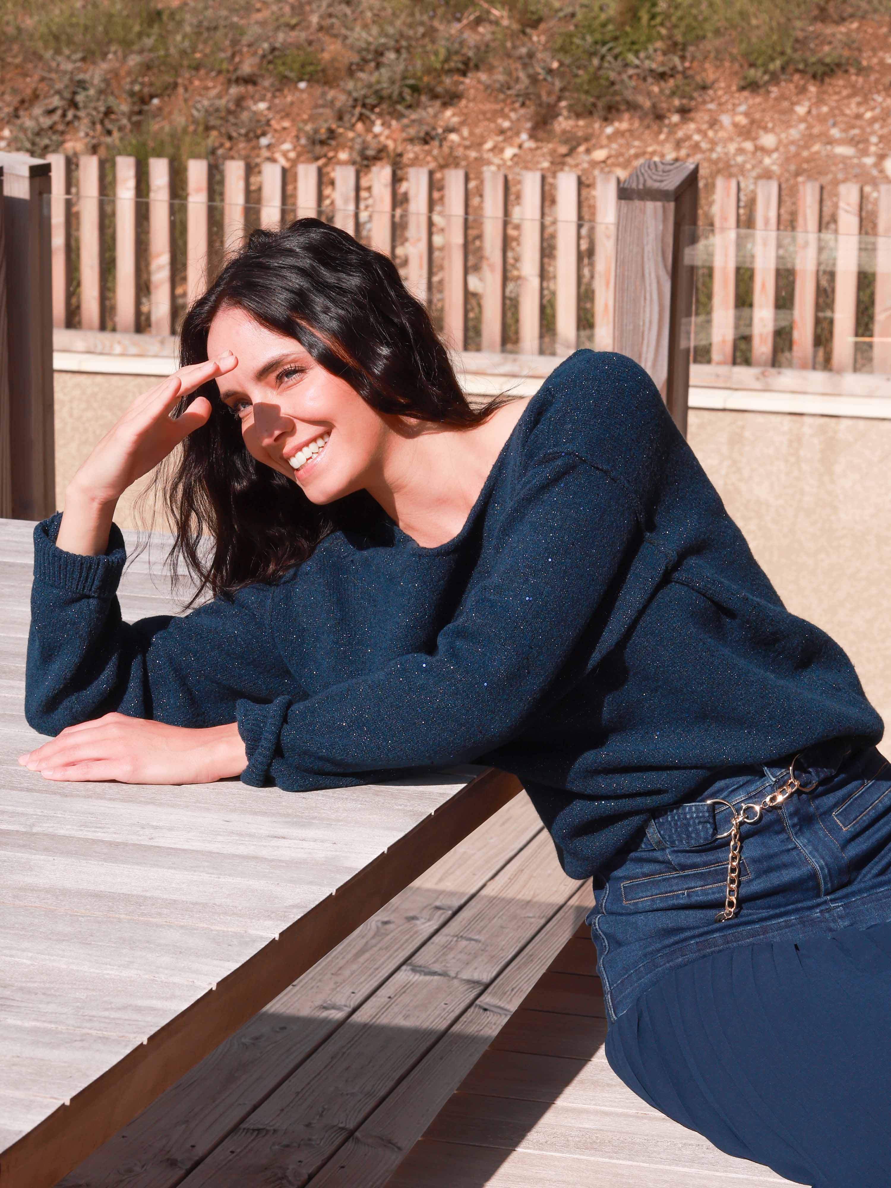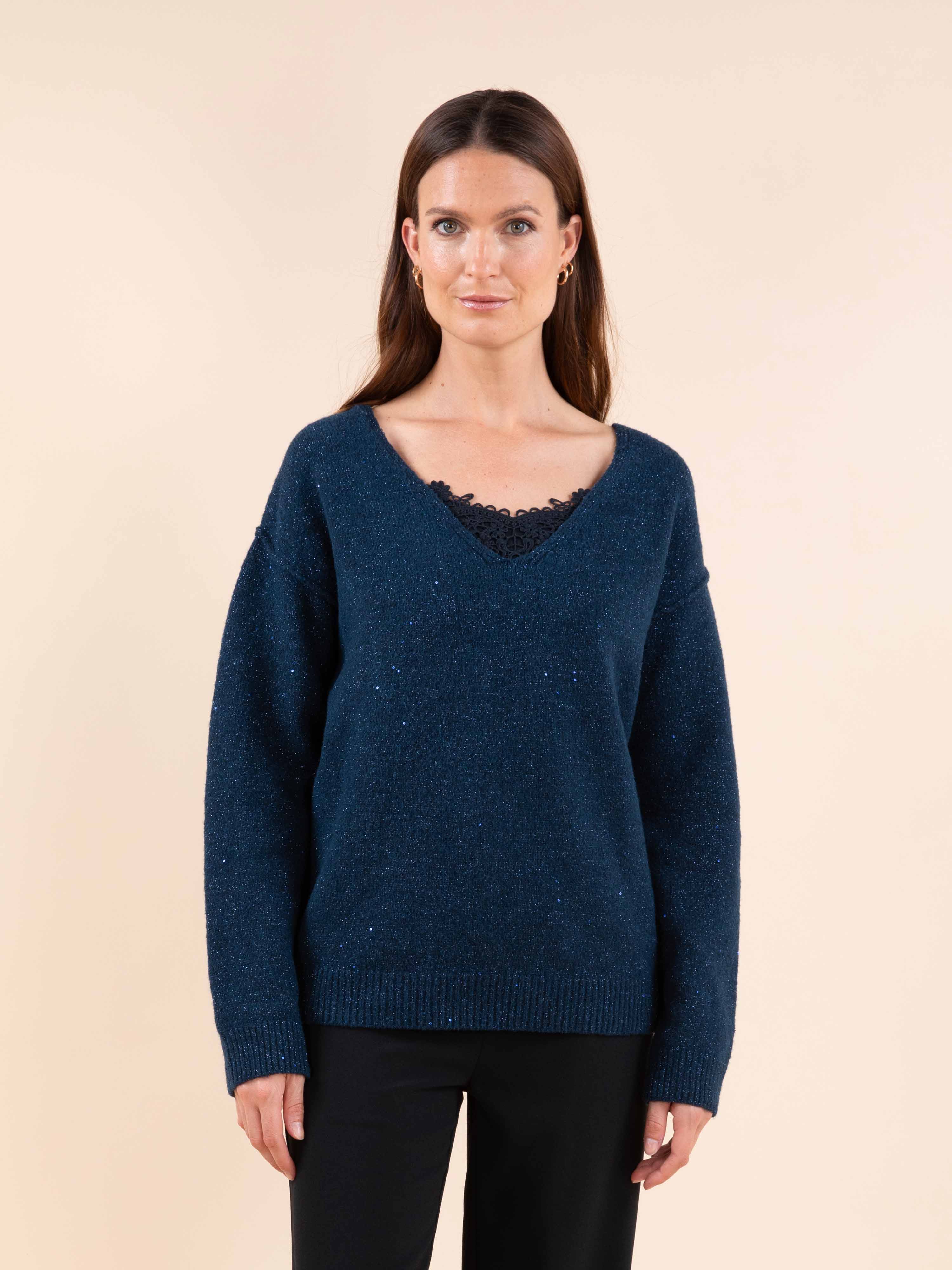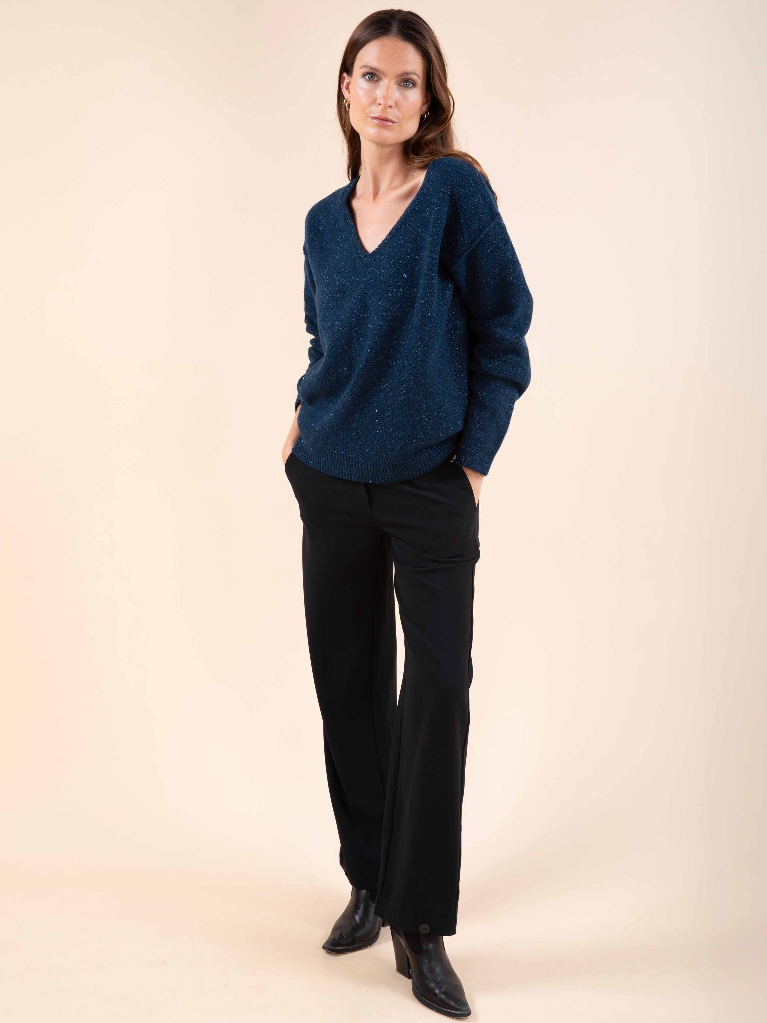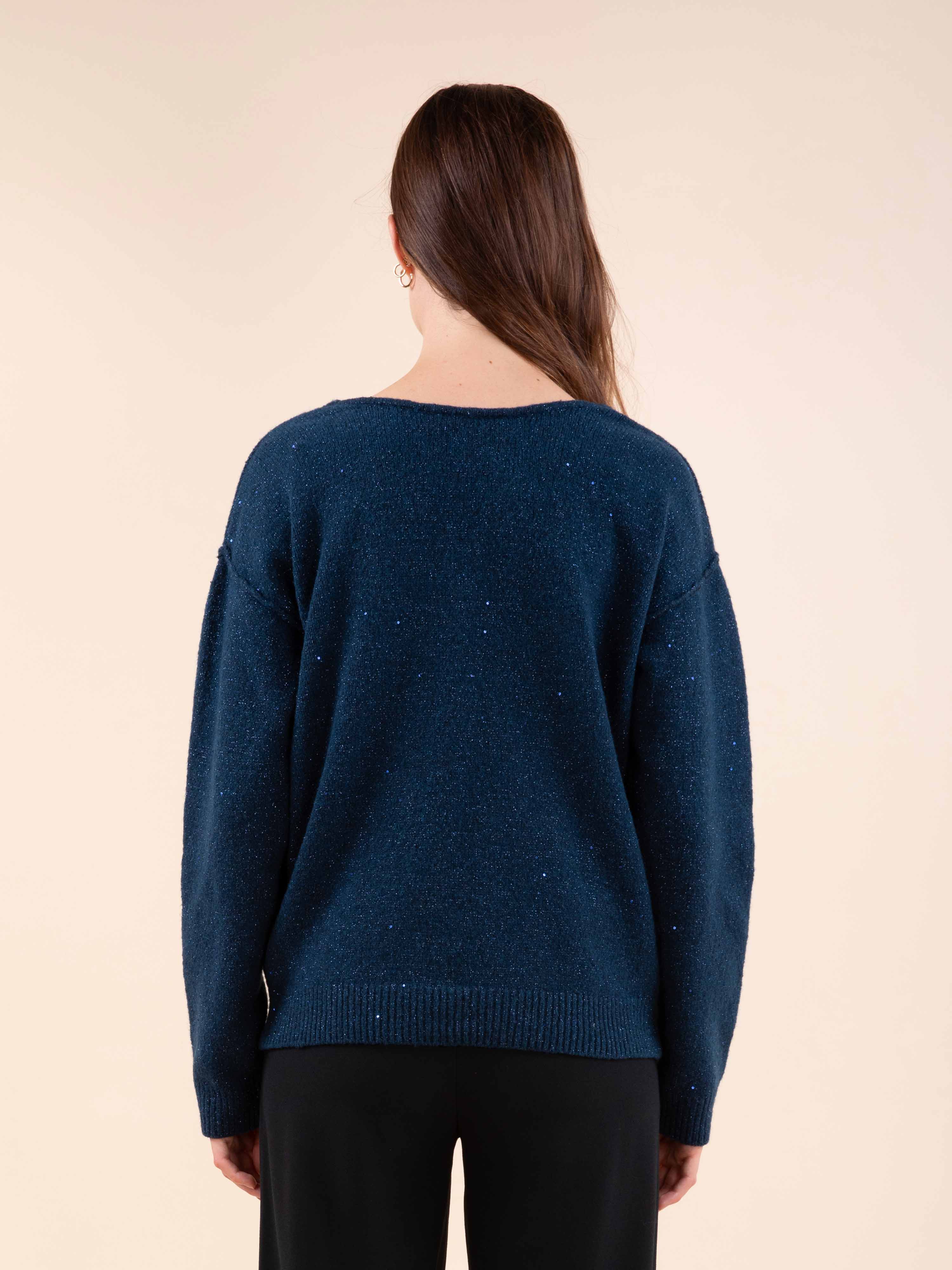 Ce pull encolure V joue la carte de l’éclat discret avec son tricotage jersey orné de petits sequins, pour un effet lumineux tout en finesse.