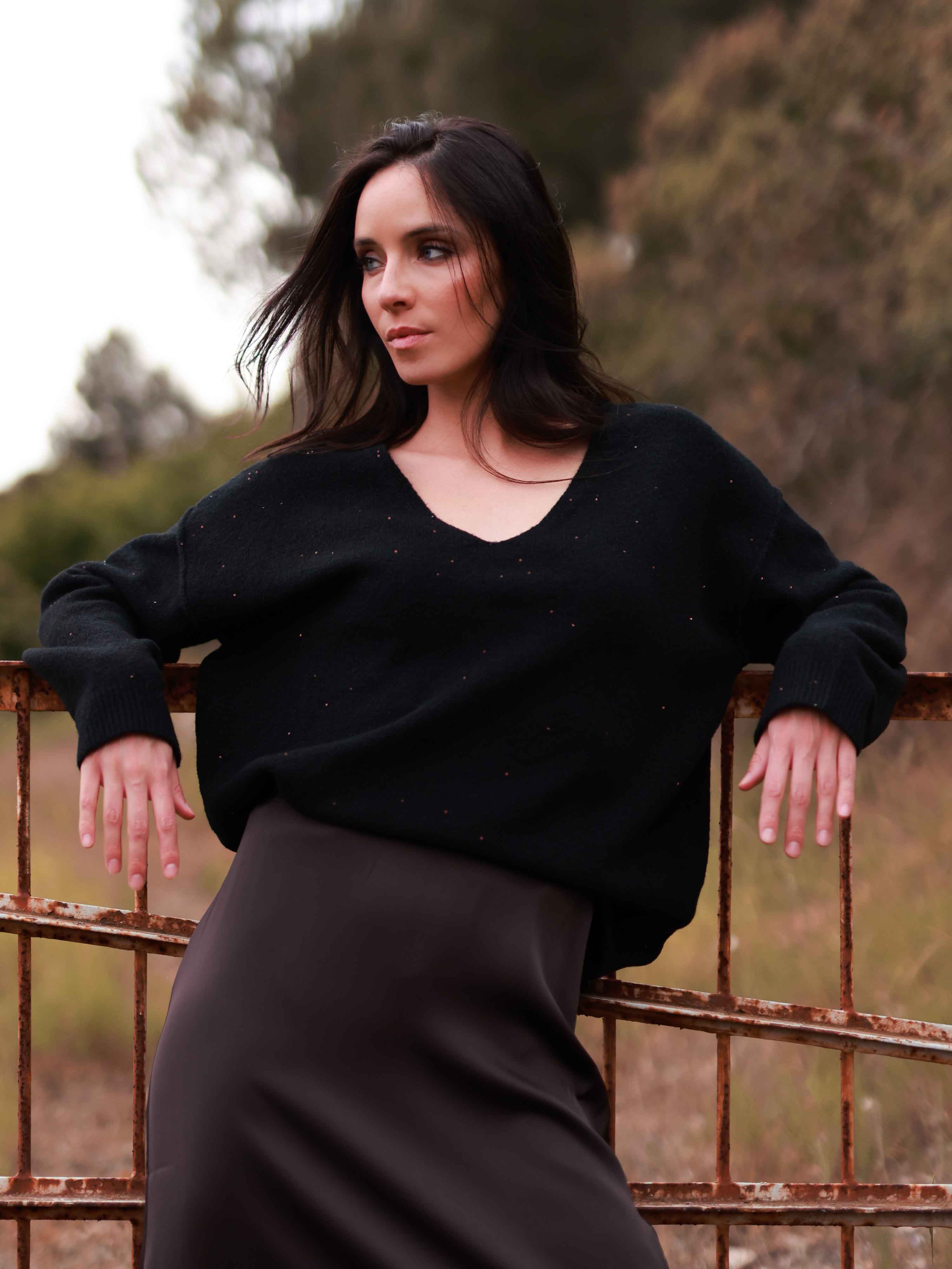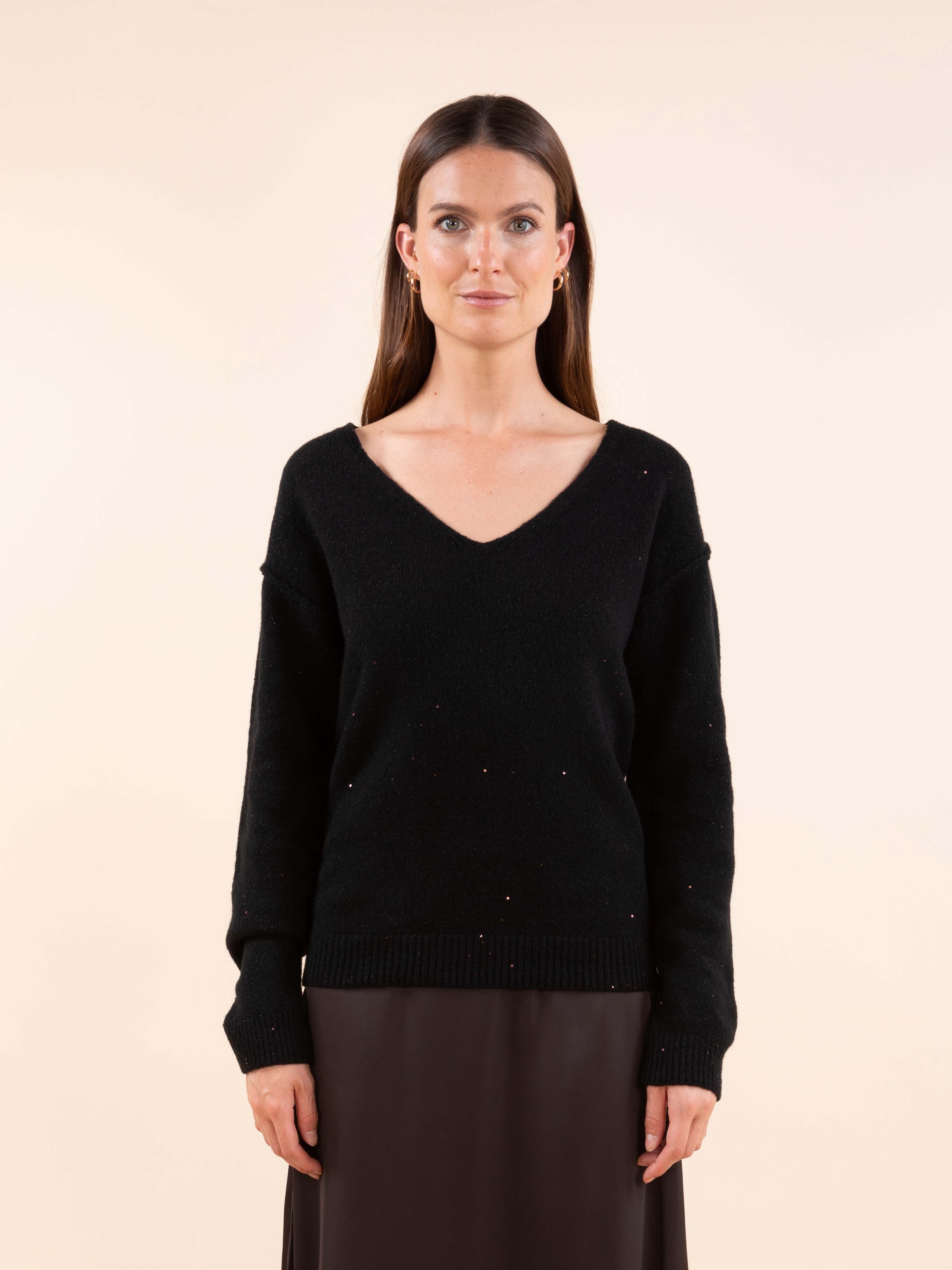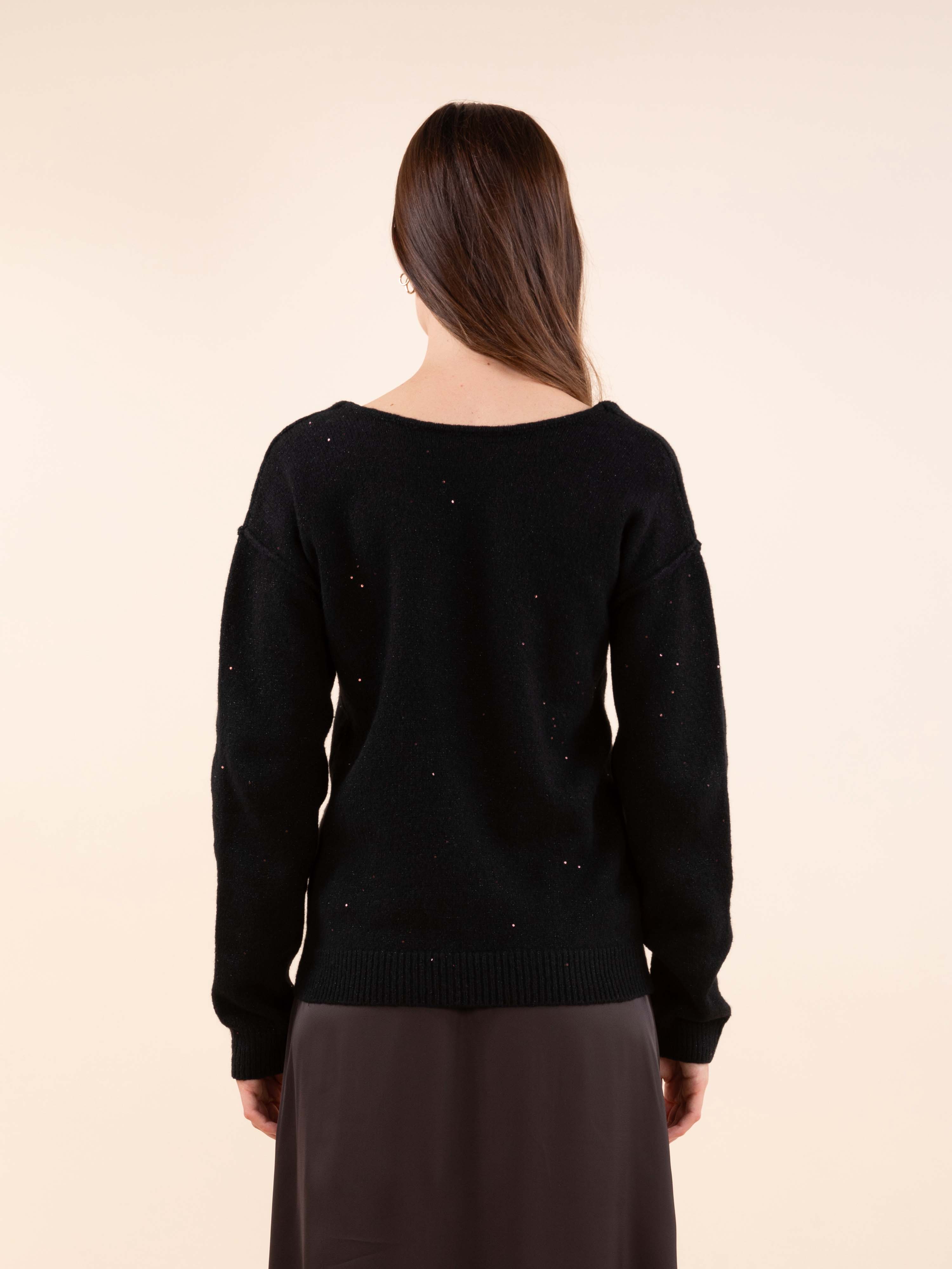 Illuminez vos looks avec ce pull réversible à sequins, au tricotage délicat et à l'encolure V ultra féminine.