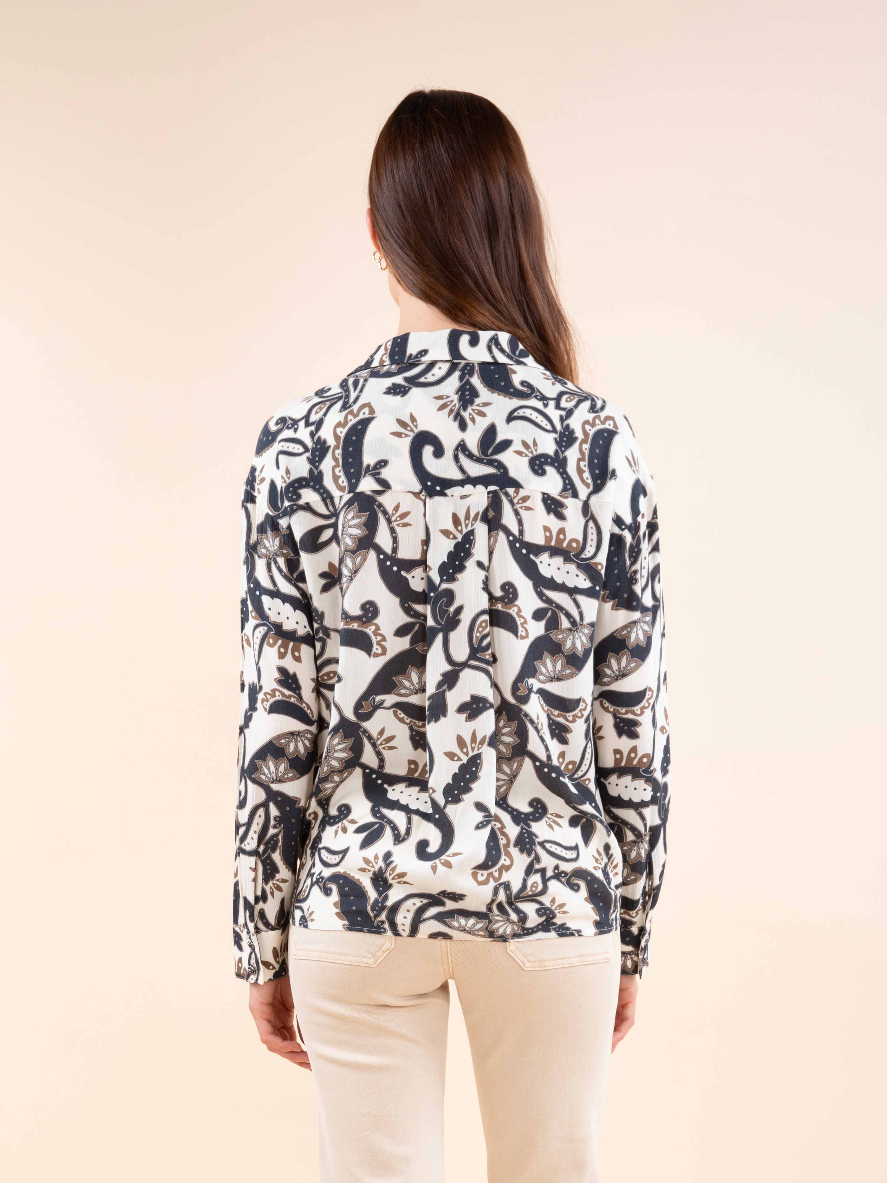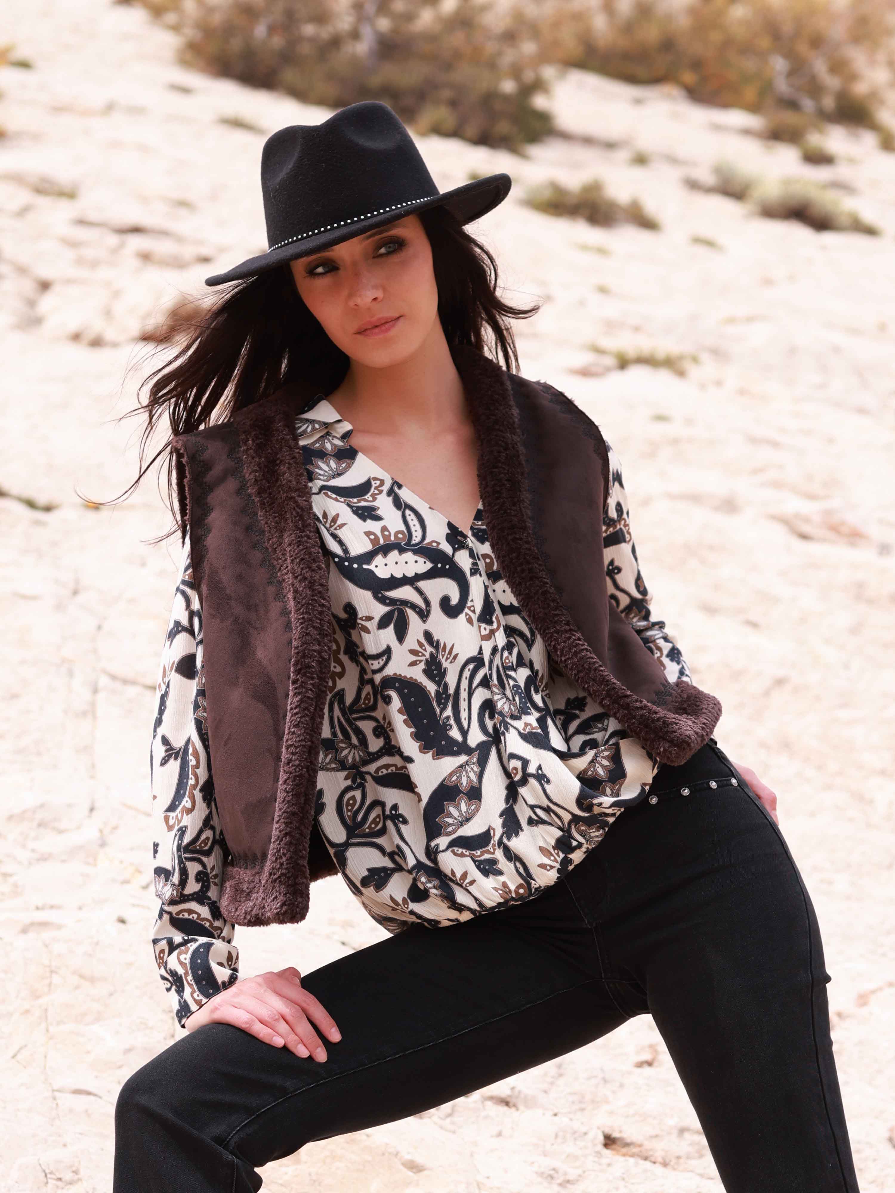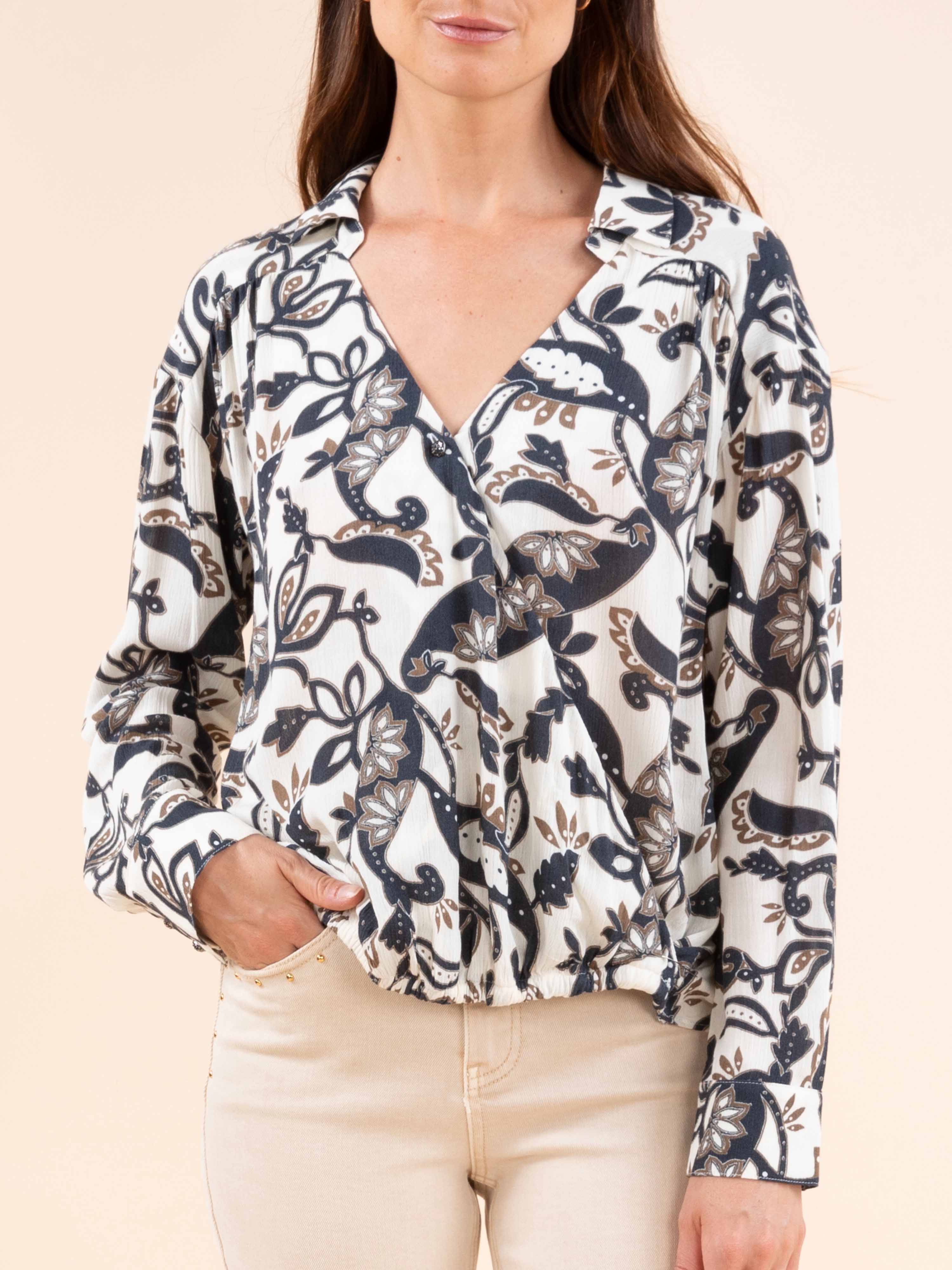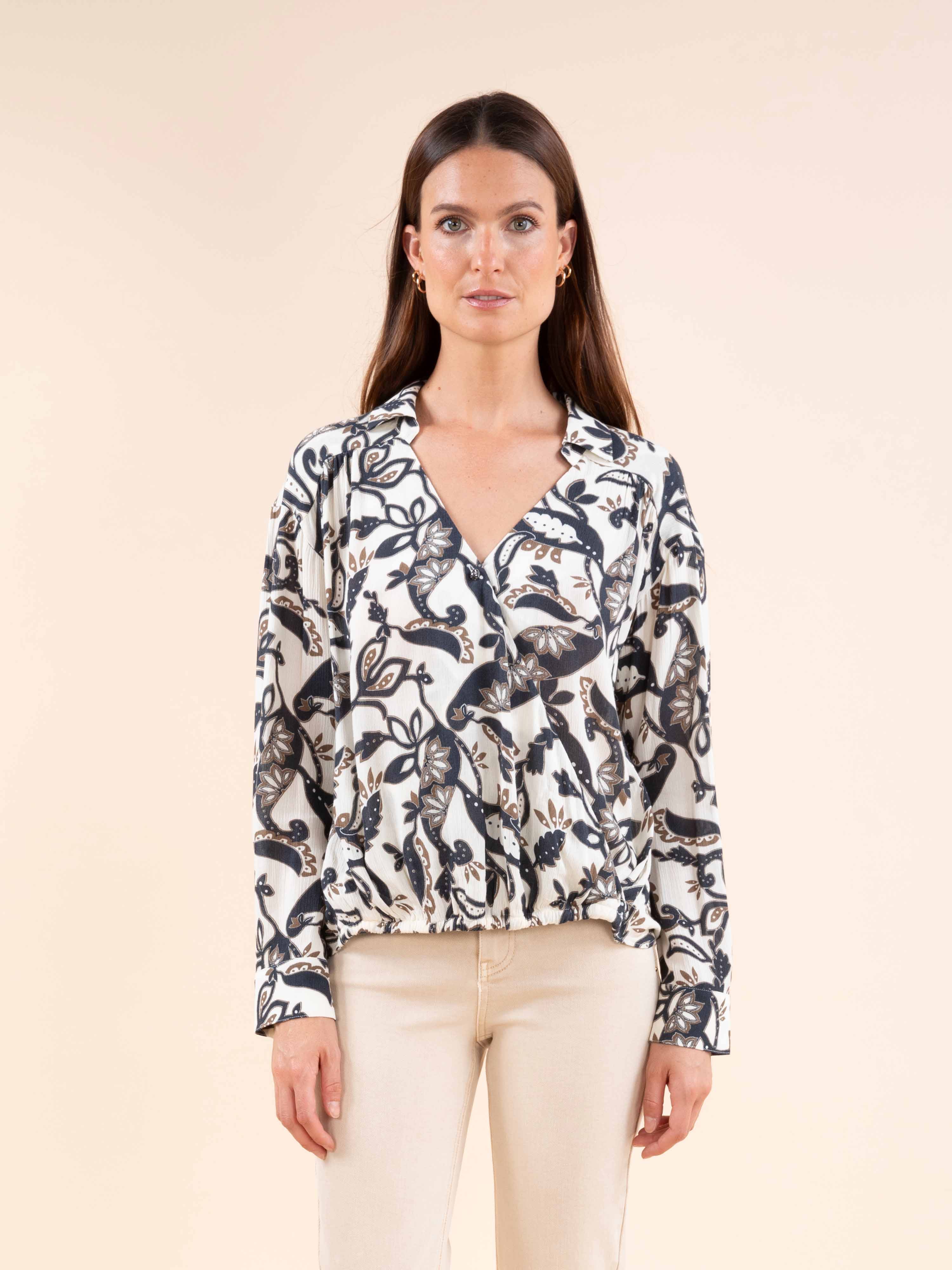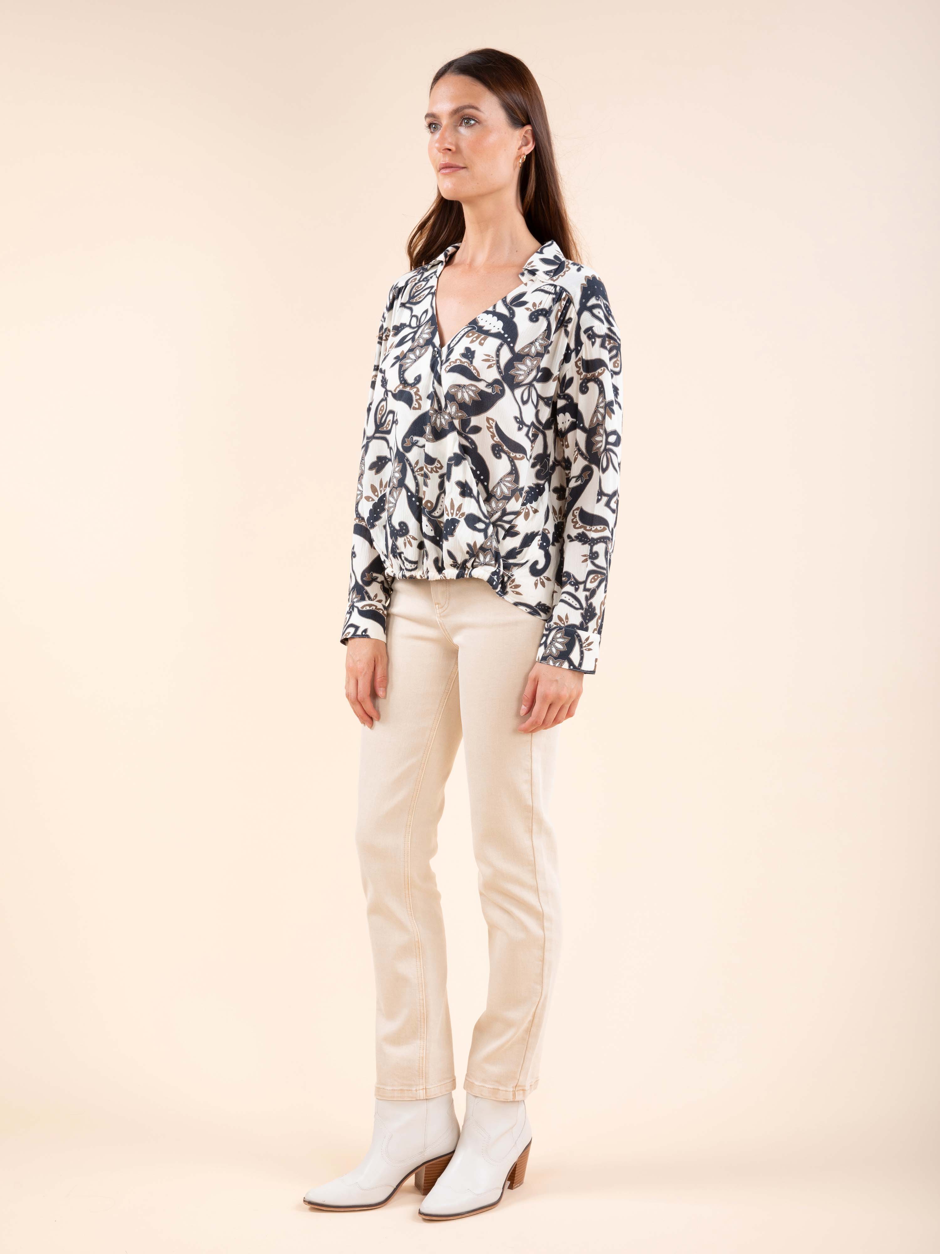 Laissez-vous charmer par cette blouse effet cache-cœur en crêpe viscose, alliant élégance et confort avec ses boutons fantaisie et sa coupe droite.