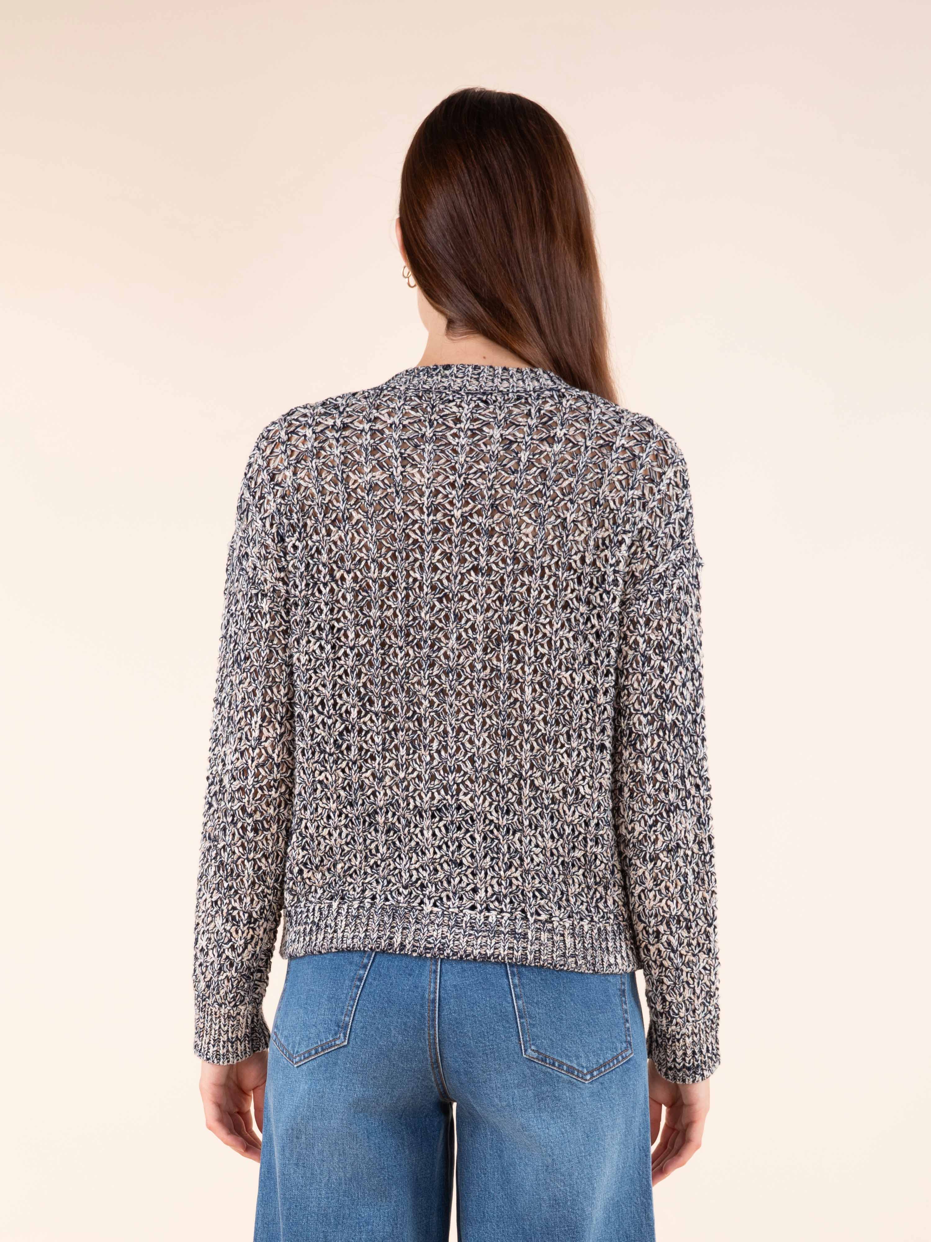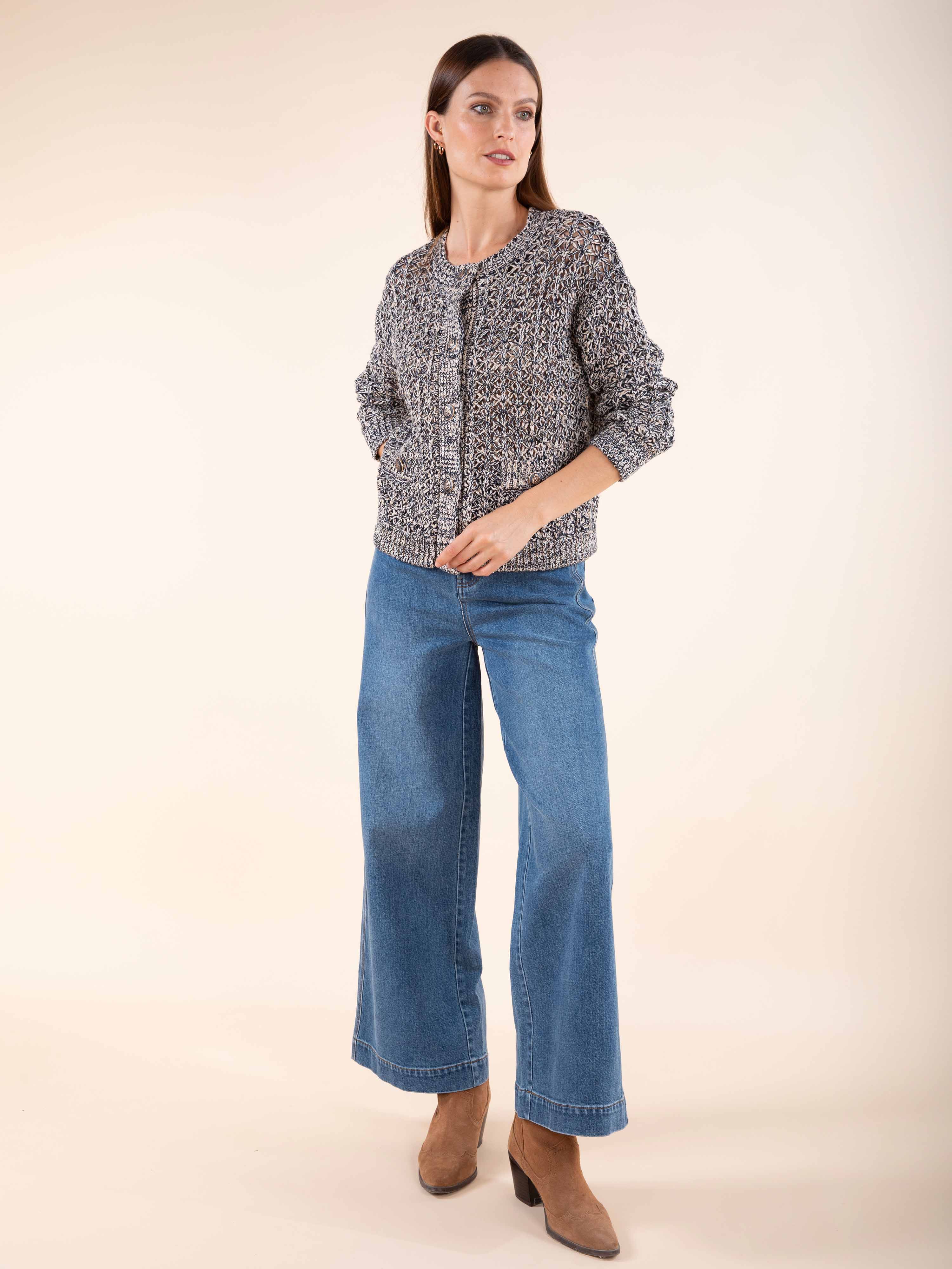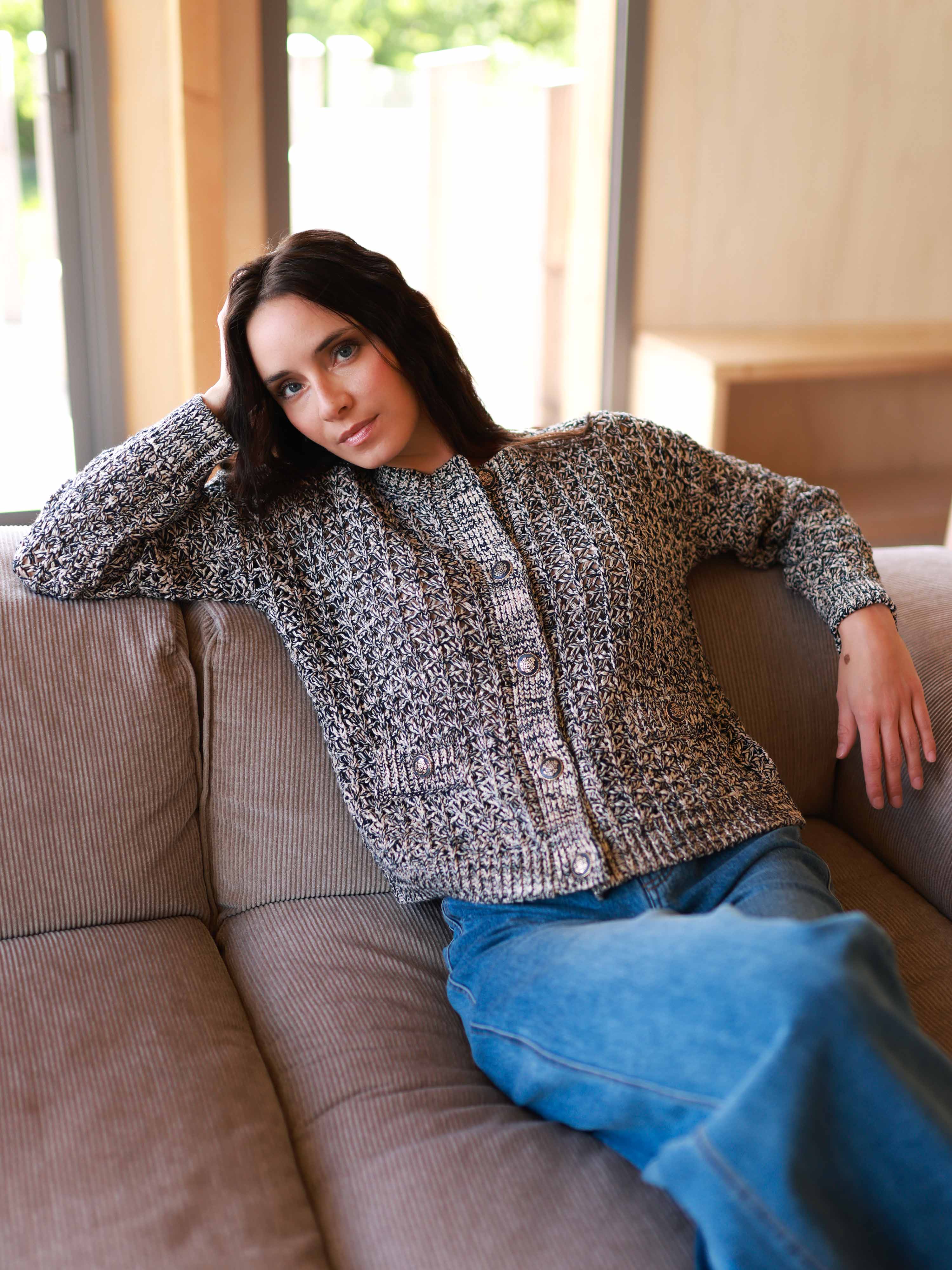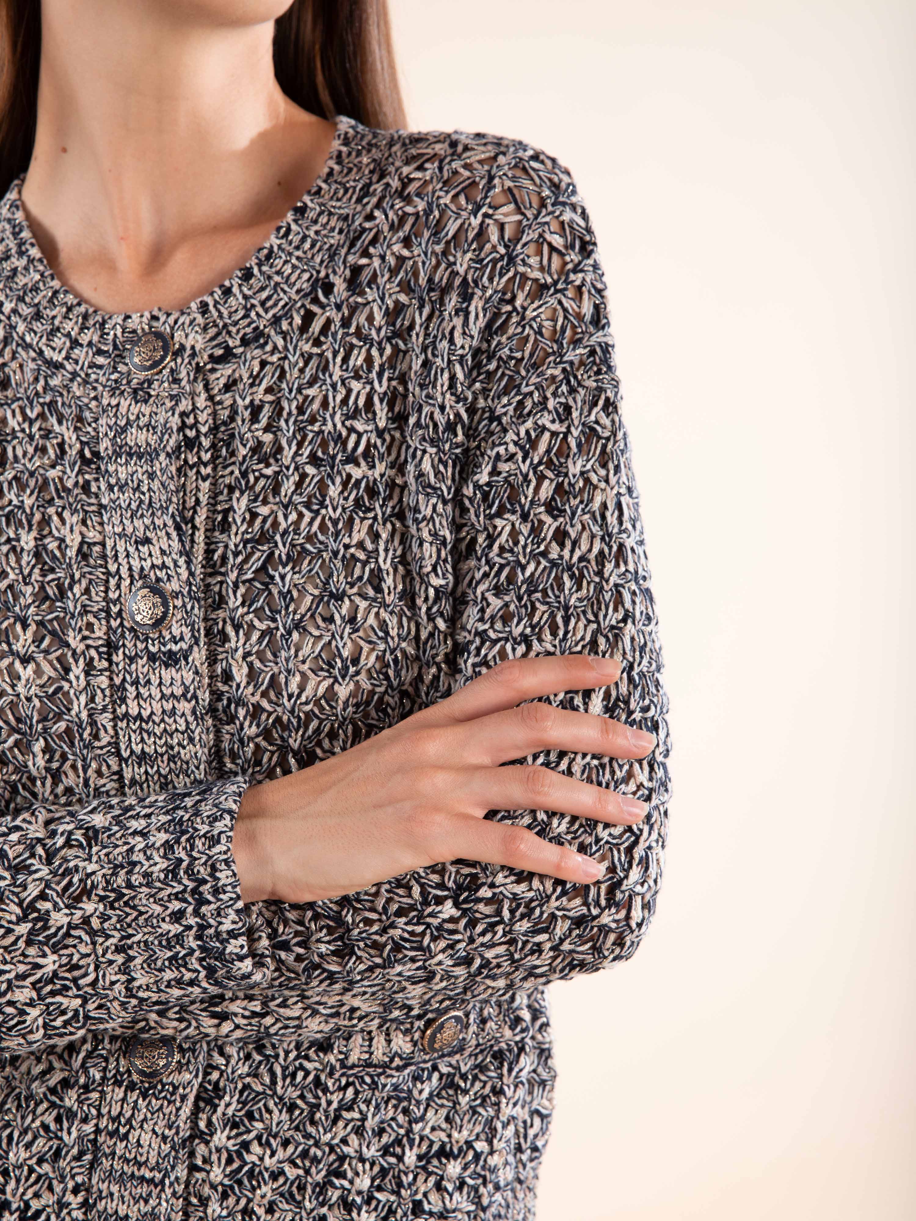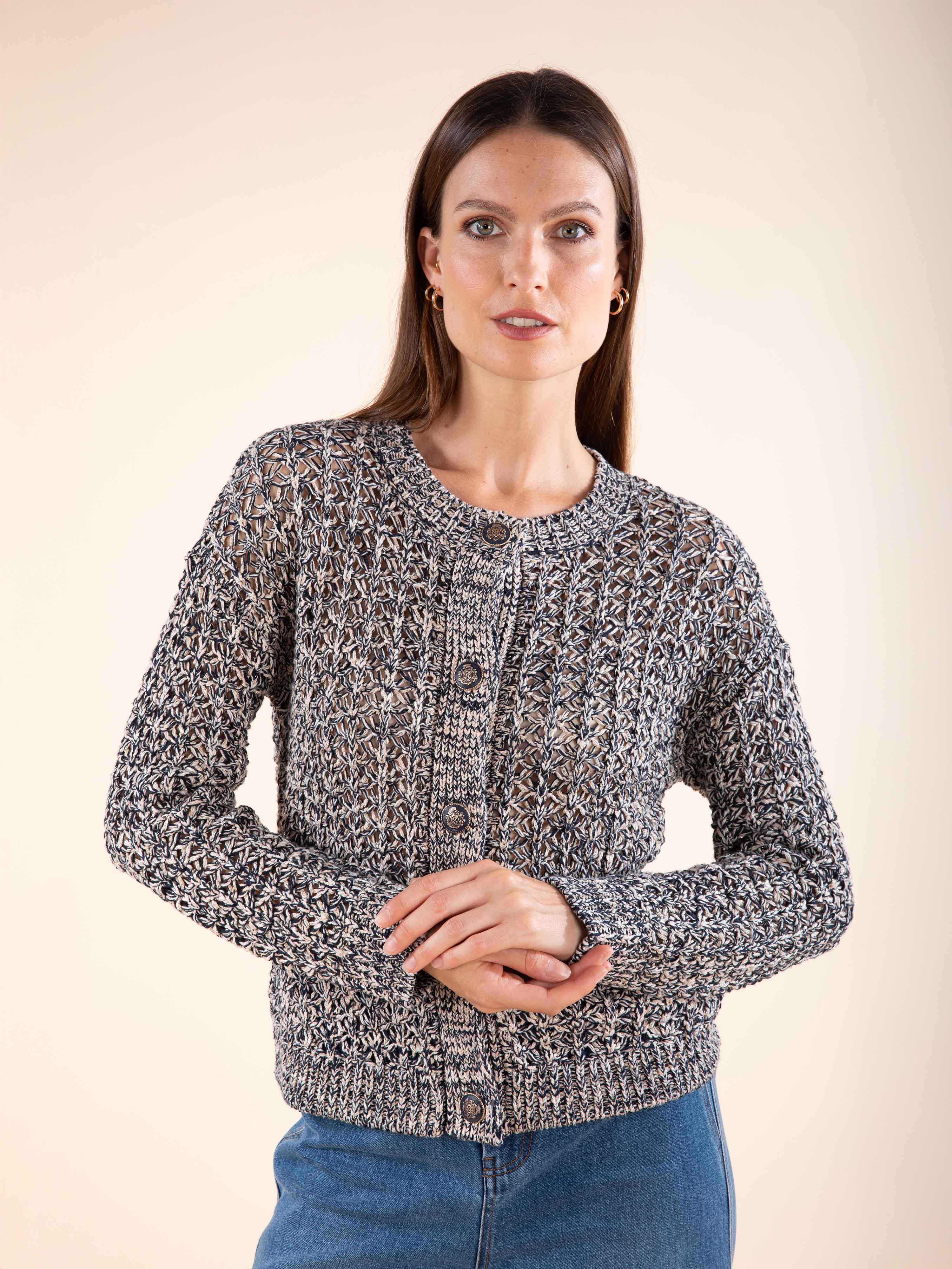 Laissez-vous séduire par ce cardigan tricolore au tricot fantaisie rehaussé de fil lurex, parfait pour briller subtilement.