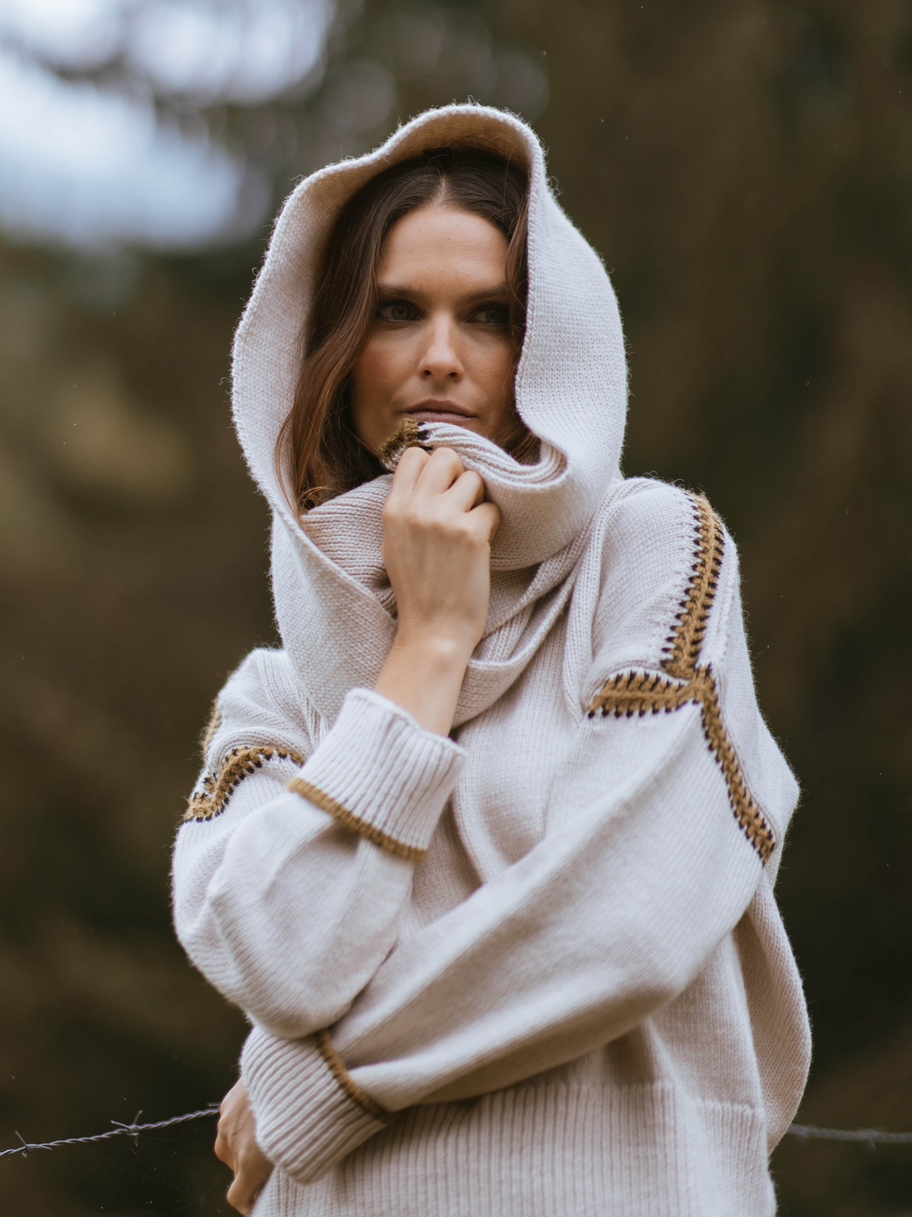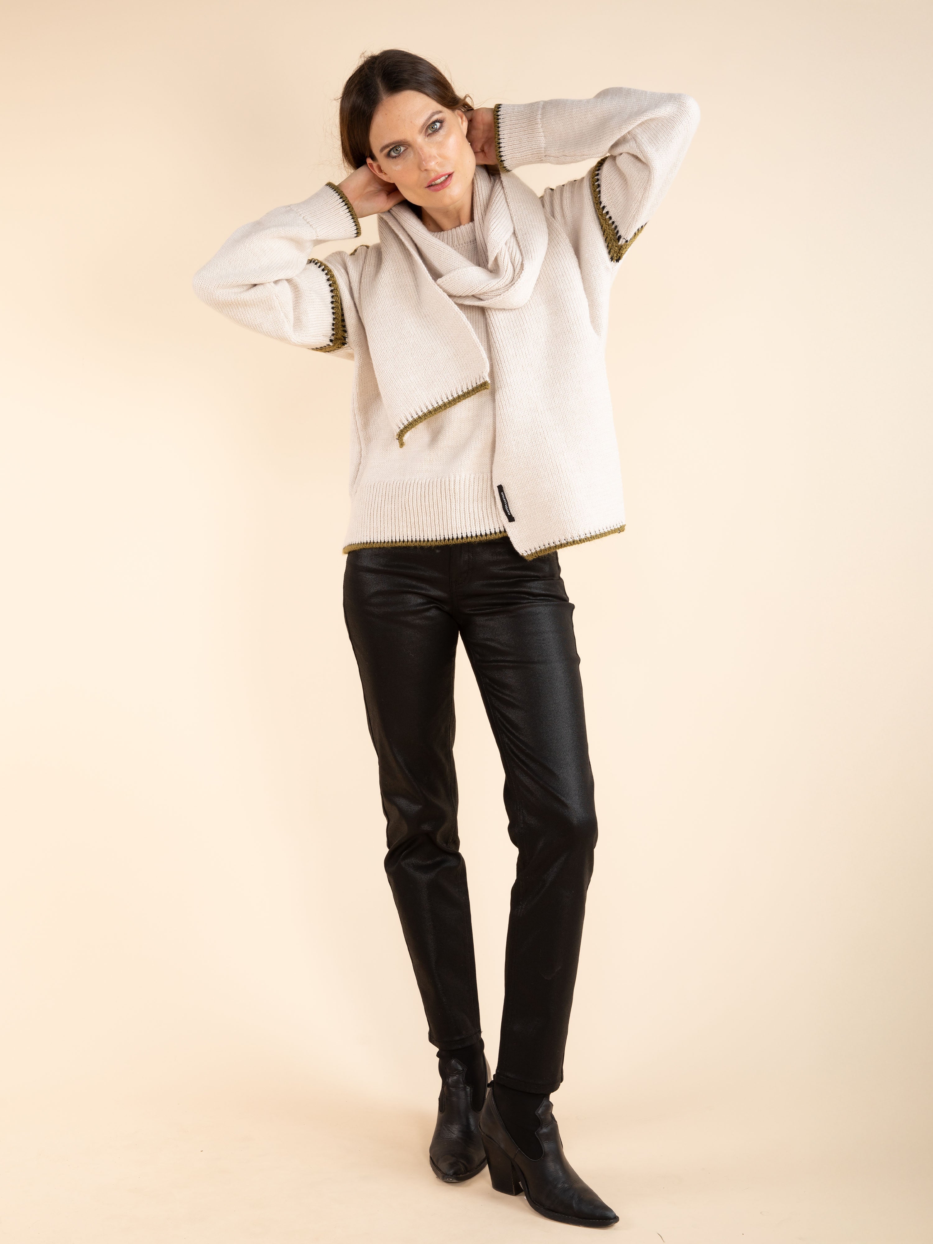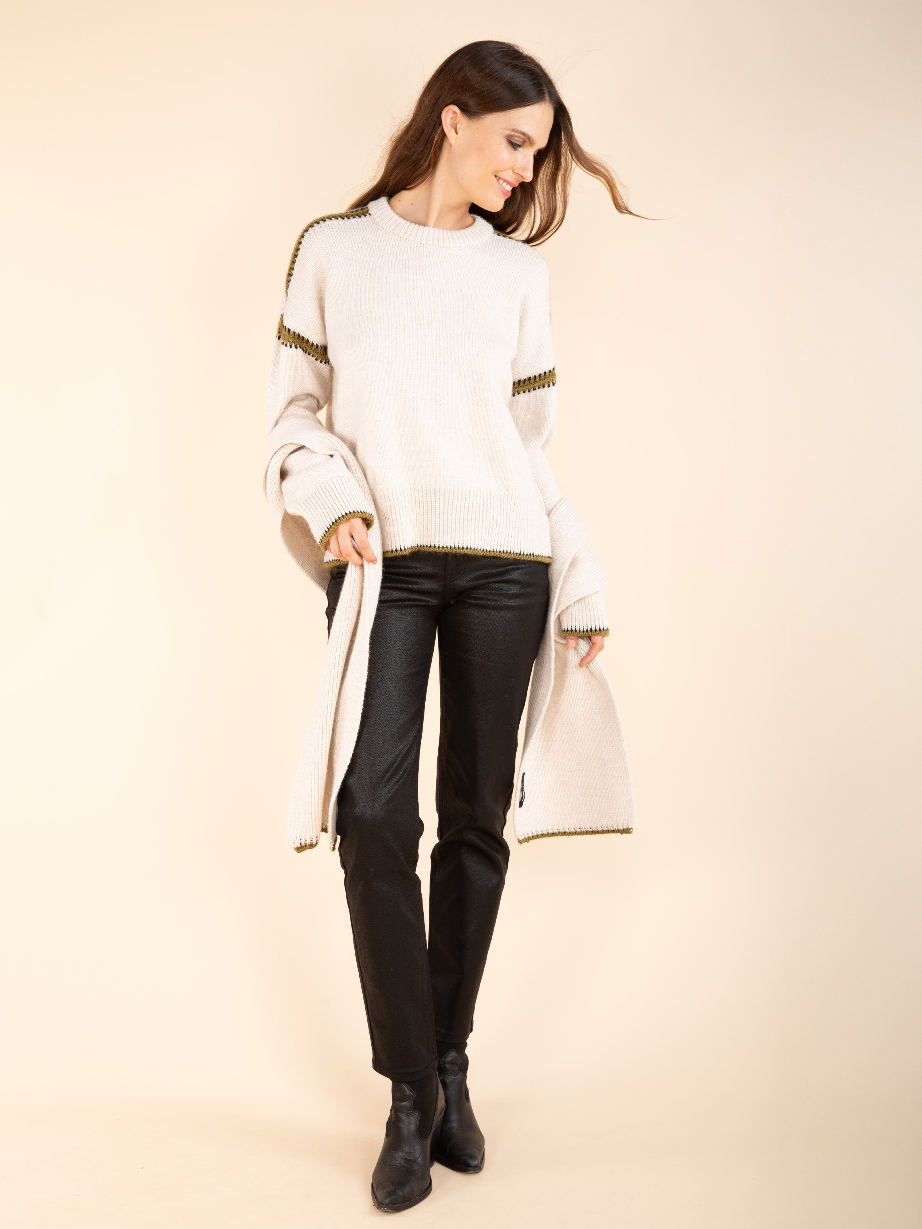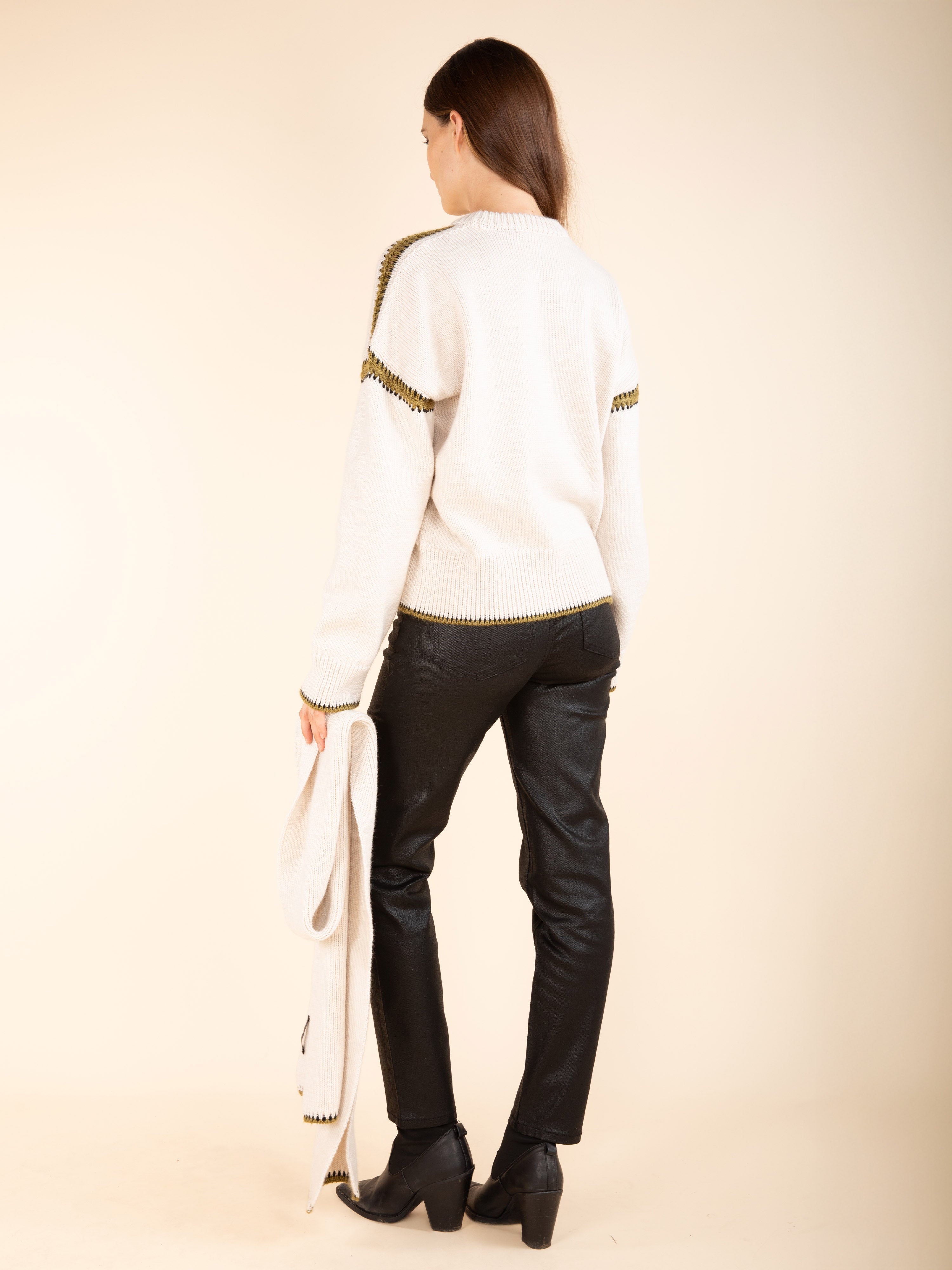 Tricotage contrasté au niveau des emmanchures, bas de manches et bas de pull