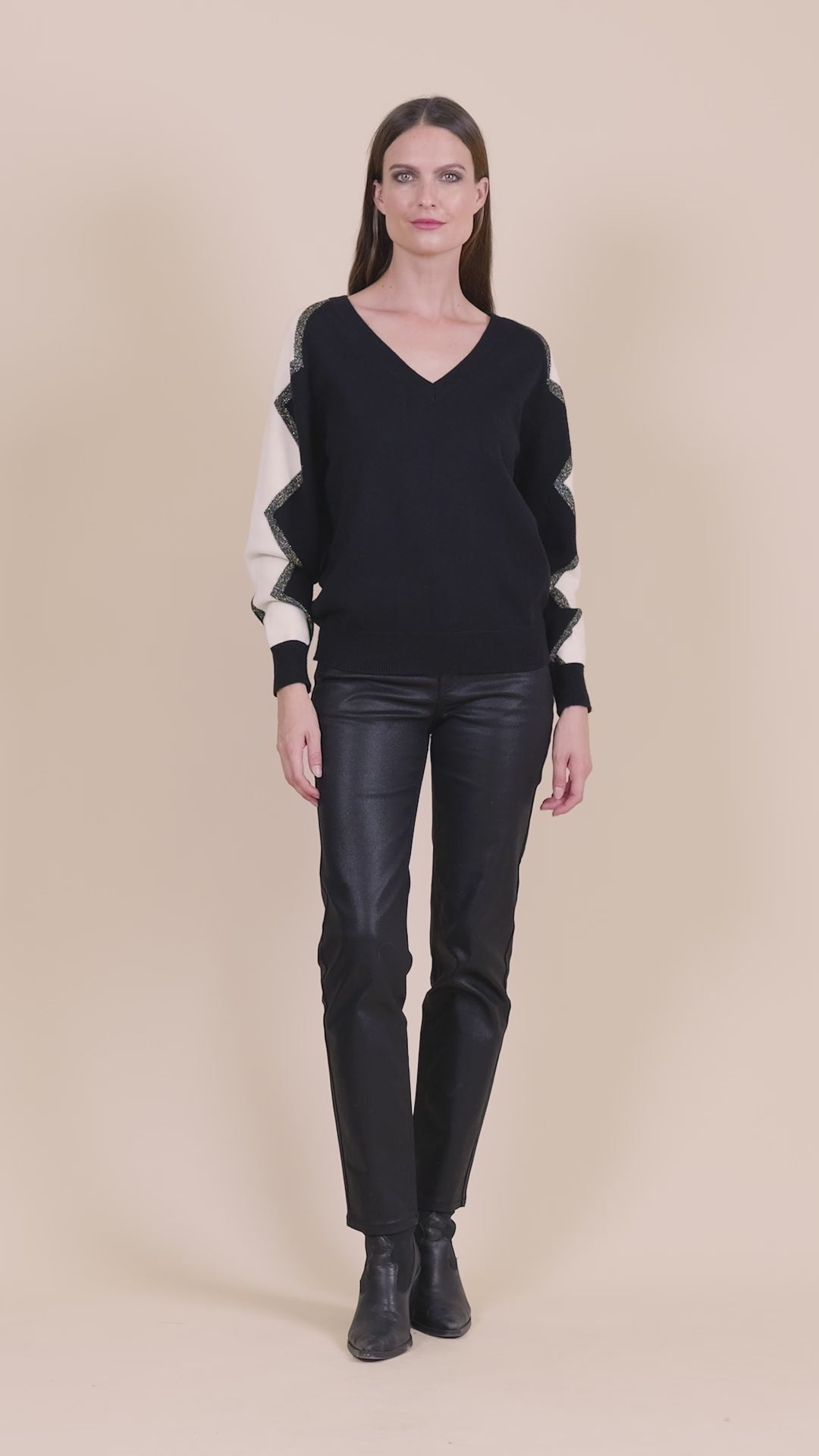 Craquez pour ce pull graphique bicolore, sublimé par ses découpes contrastées et sa bande lurex pour un look moderne et raffiné.