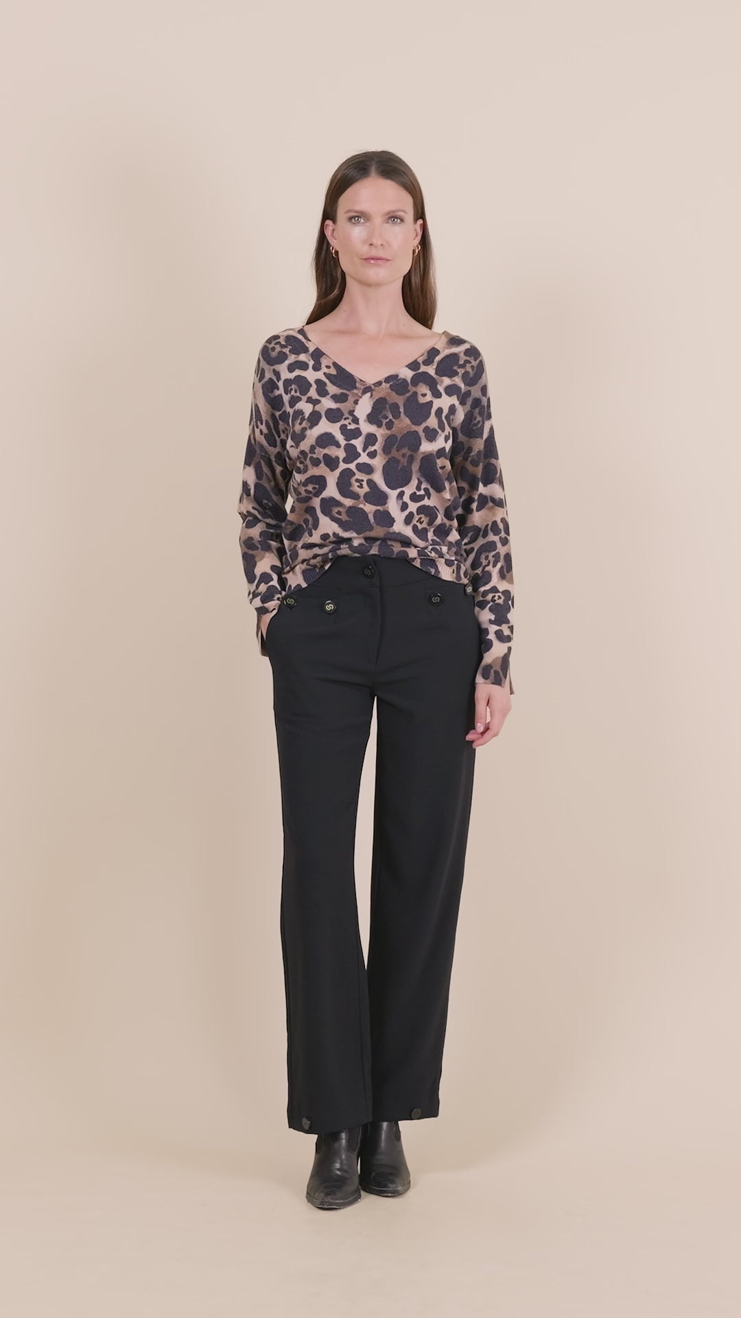 Chic et audacieux, ce pull imprimé léopard joue la carte du confort avec son jersey doux et sa coupe en V réversible.