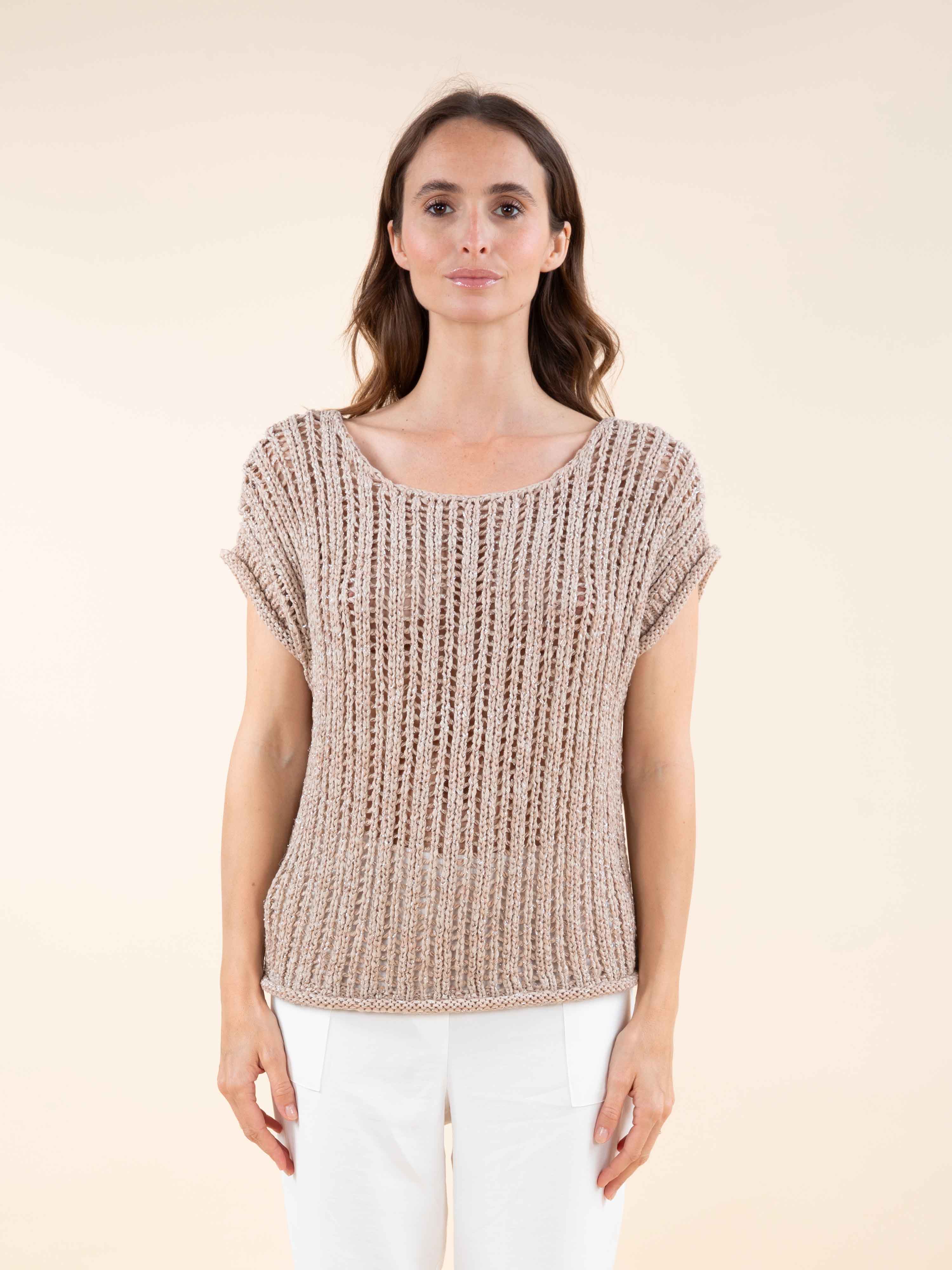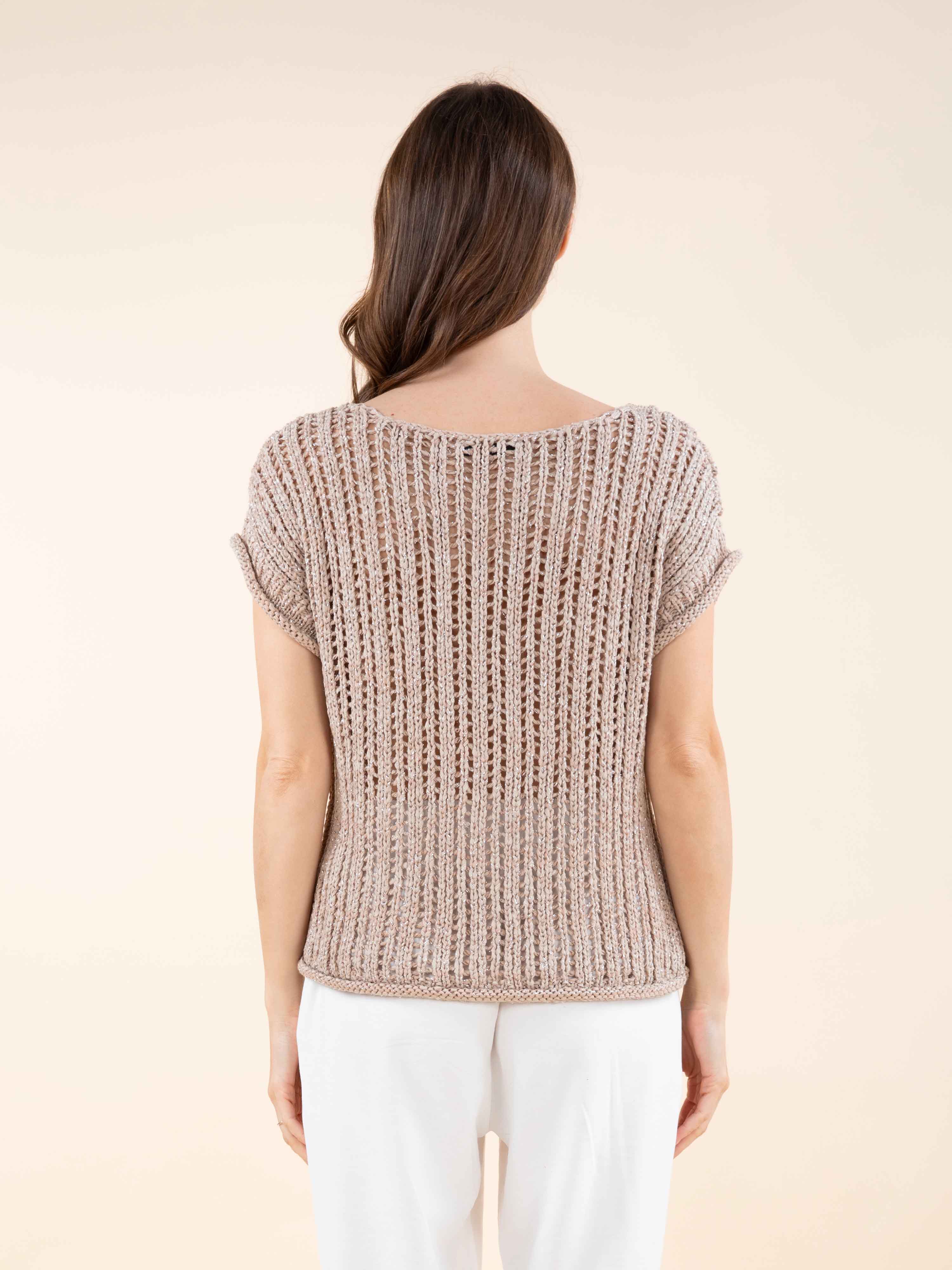 Ce pull en fil ruban avec lurex argent offre un tricotage effet cotte qui ajoute de la texture et du style.