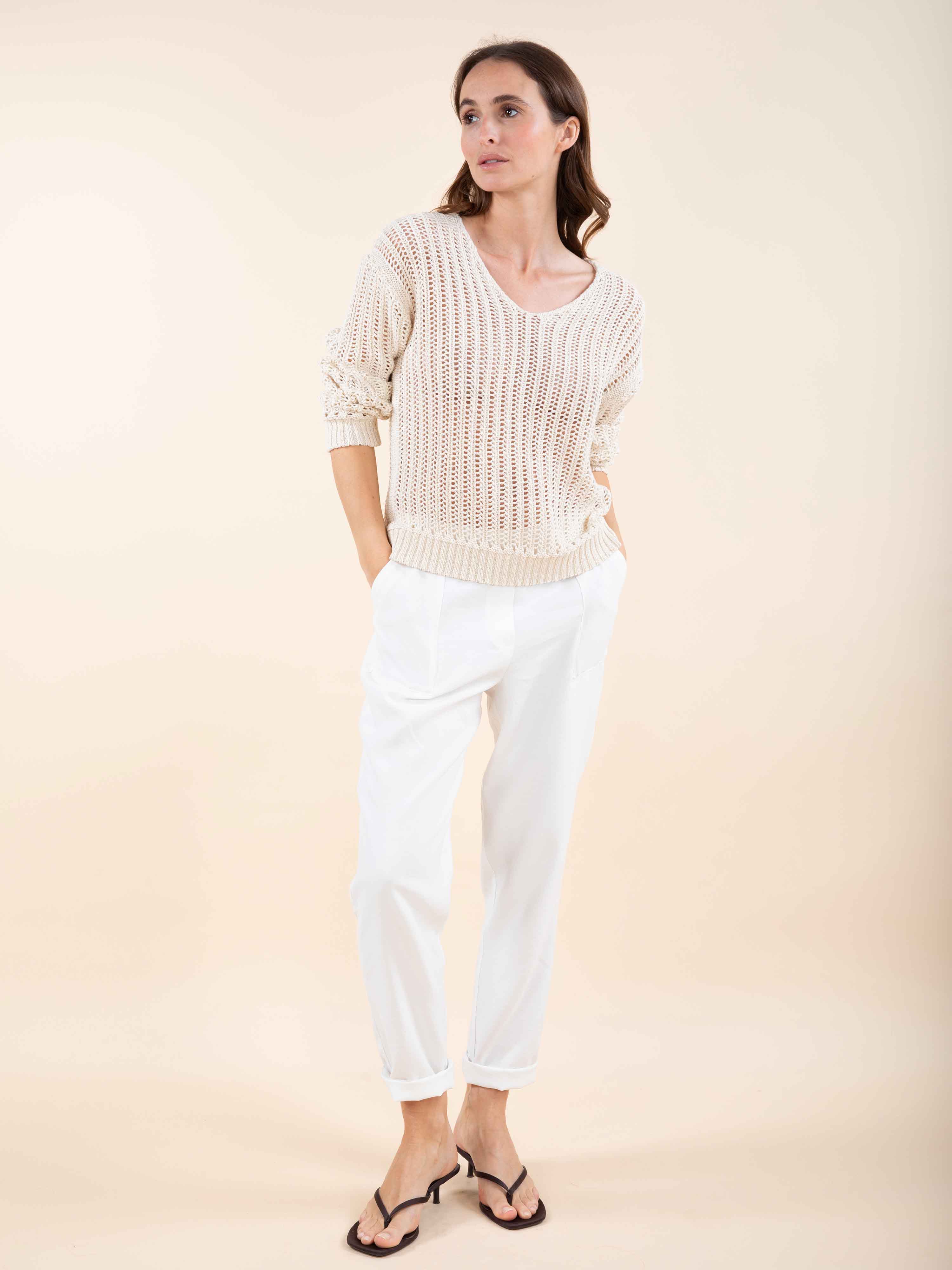 Ce pull au tricotage ajouré avec fil lurex ajoute une touche de brillance subtile et une texture aérienne à votre look.