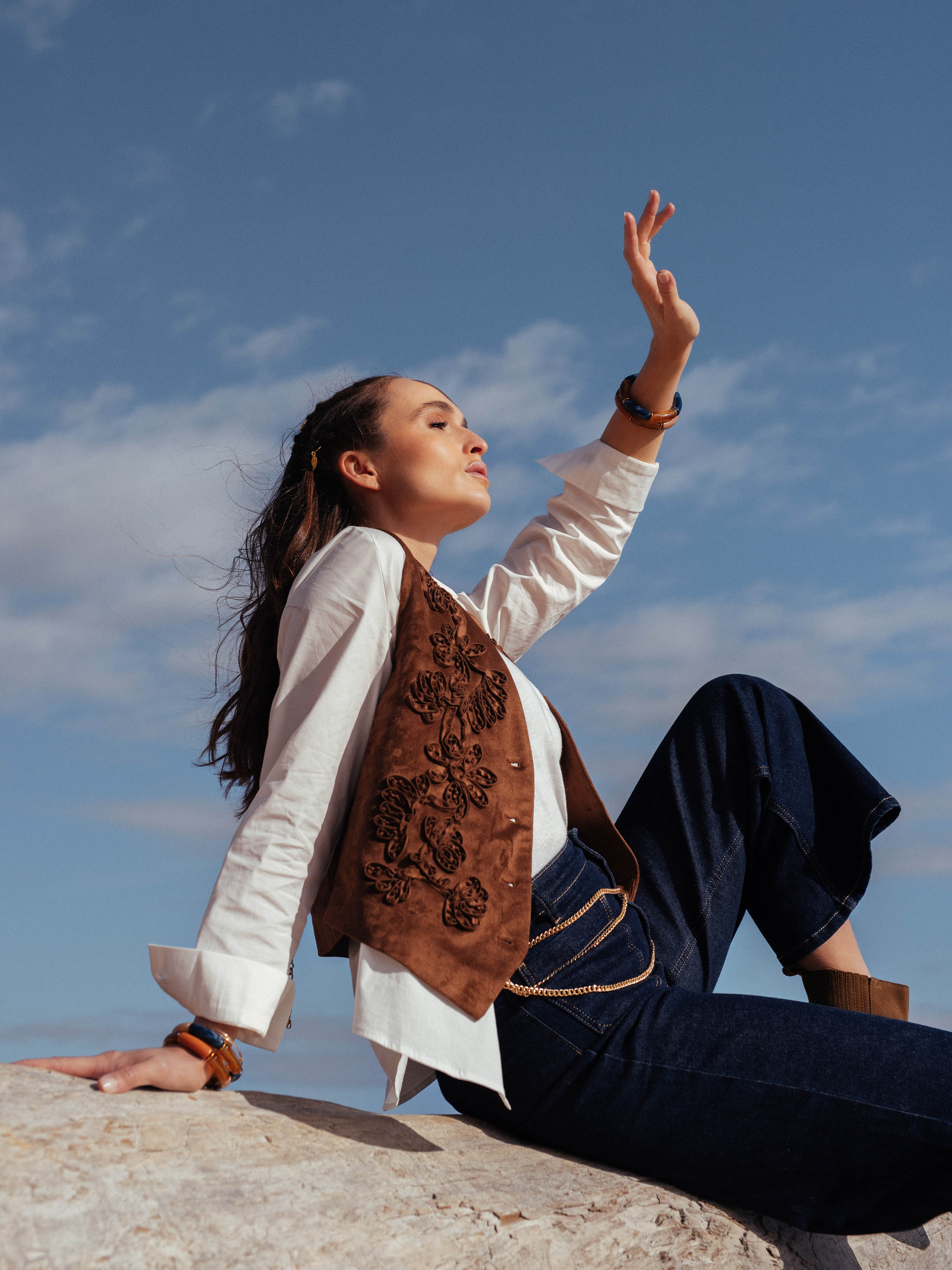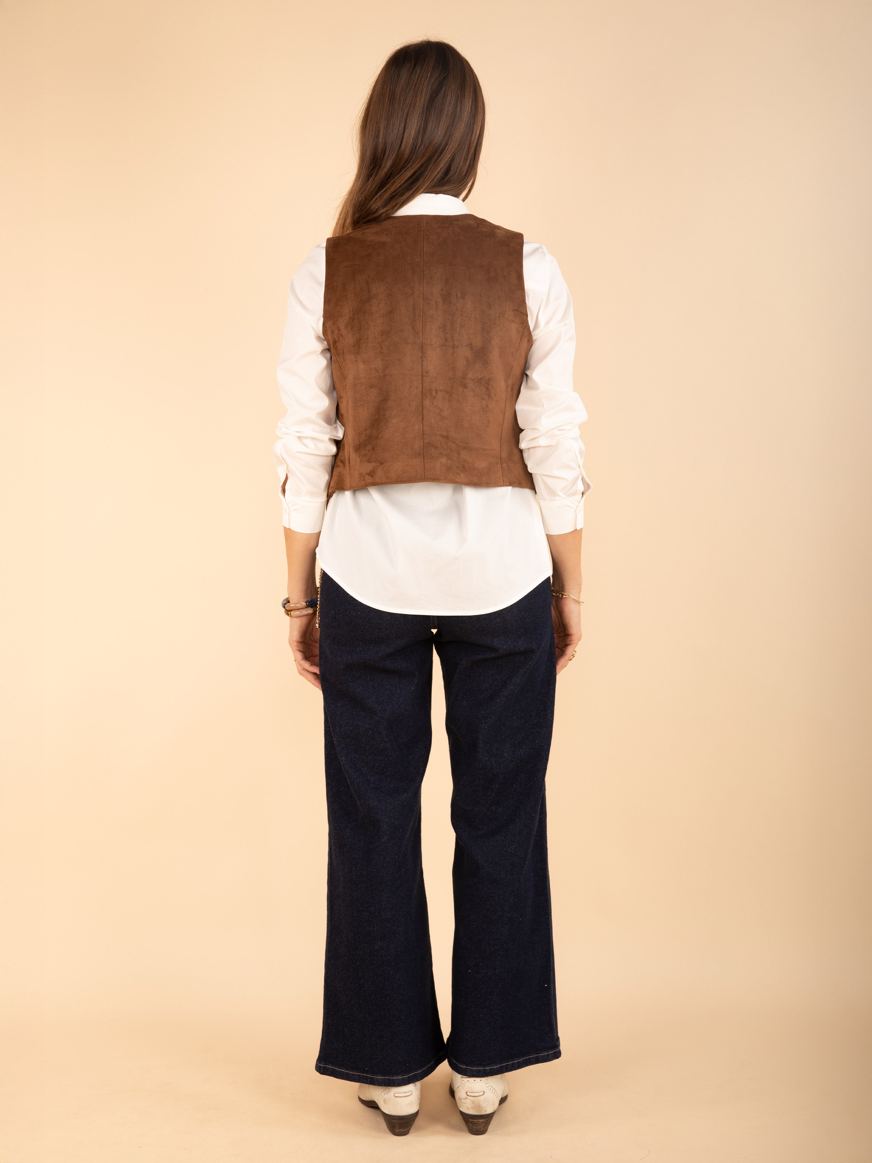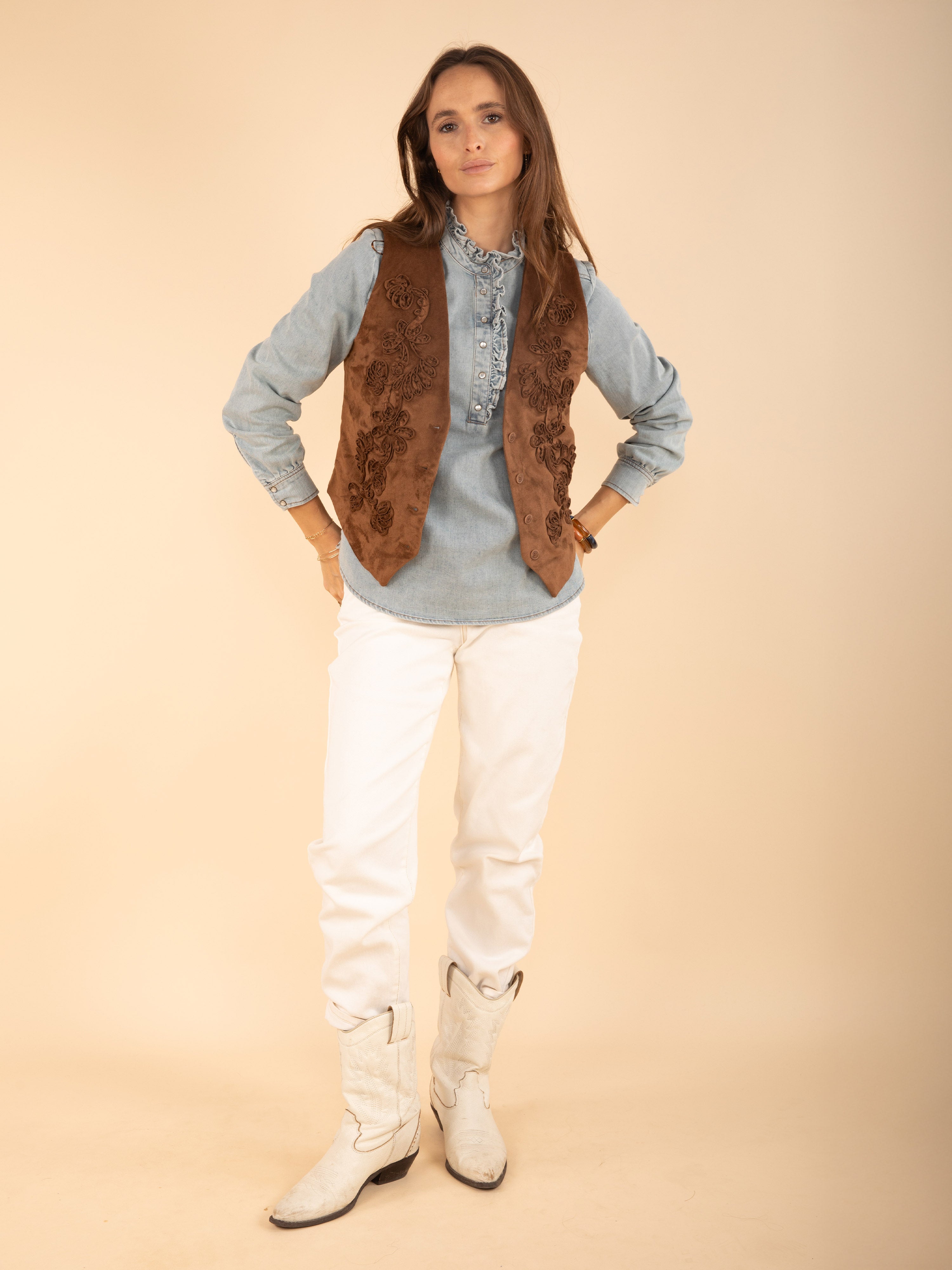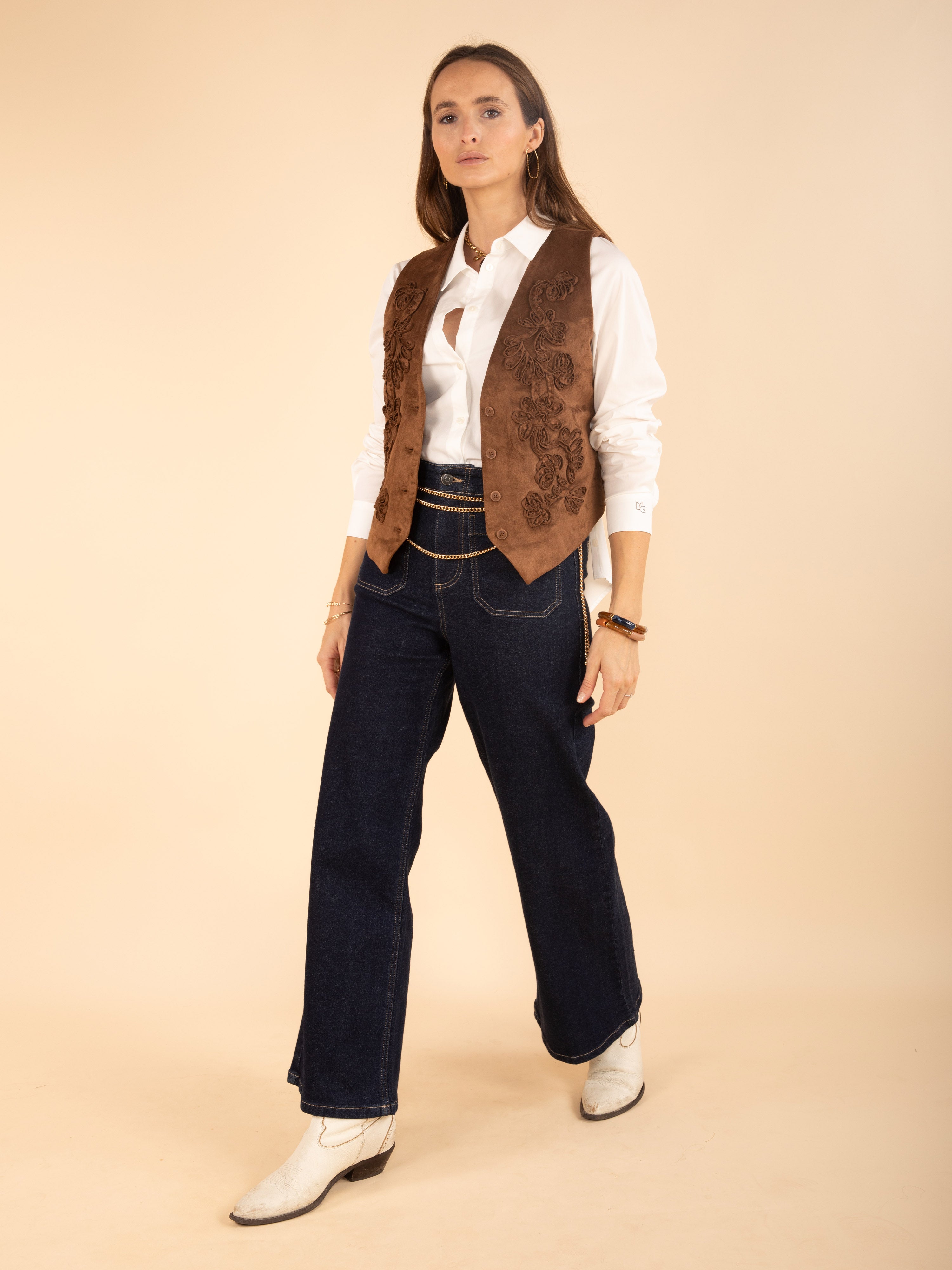 Optez pour ce gilet sans manches doublé, sublimé par sa broderie fantaisie et son encolure V pour un style chic et moderne.