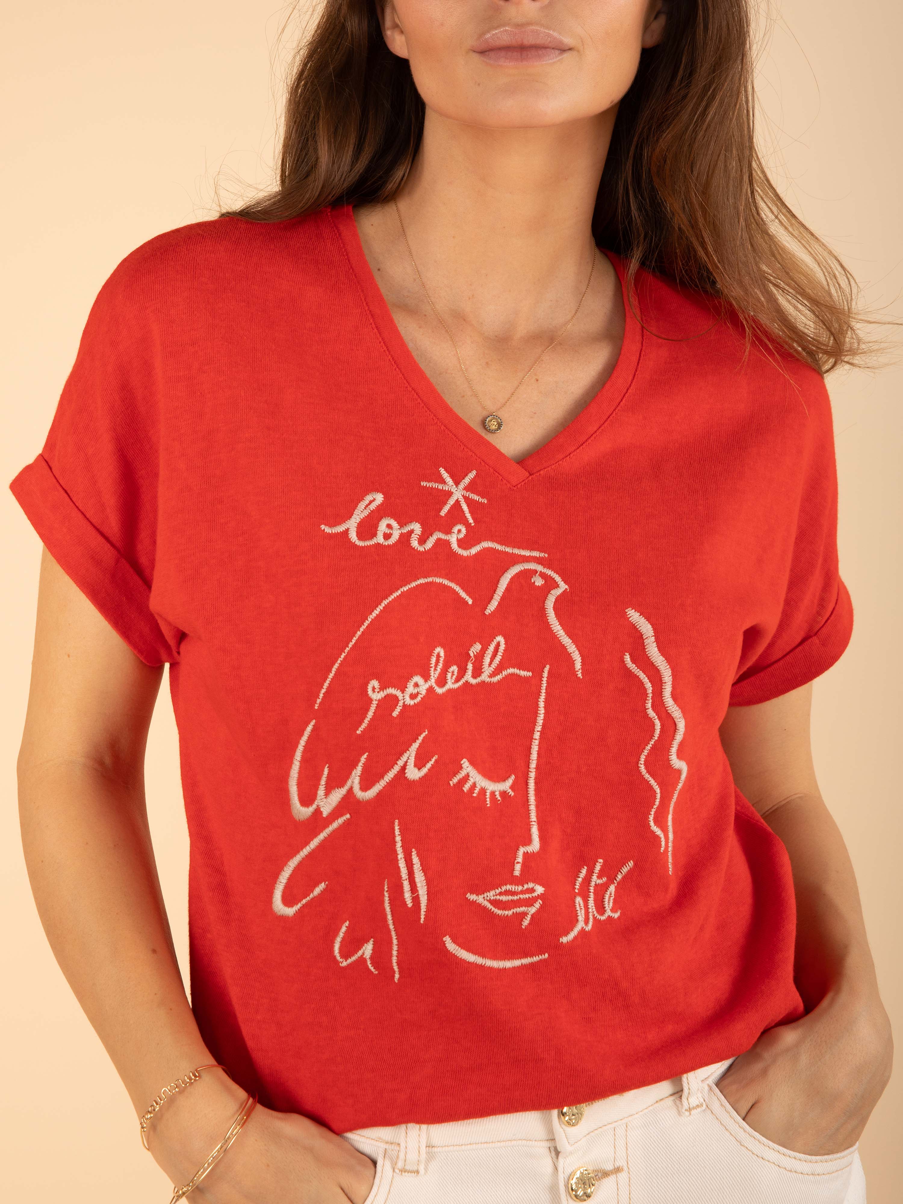 T-shirt col V brodé