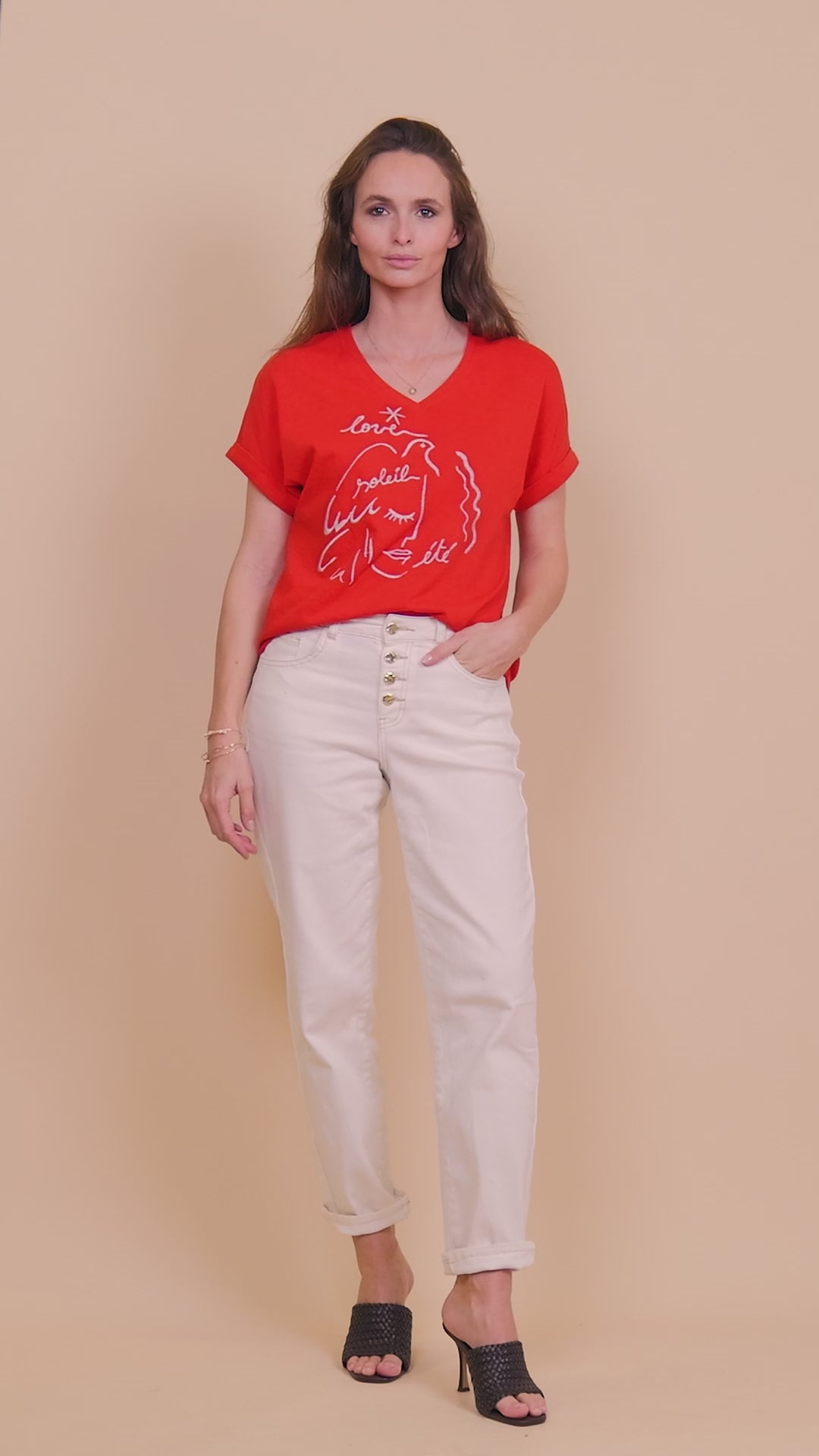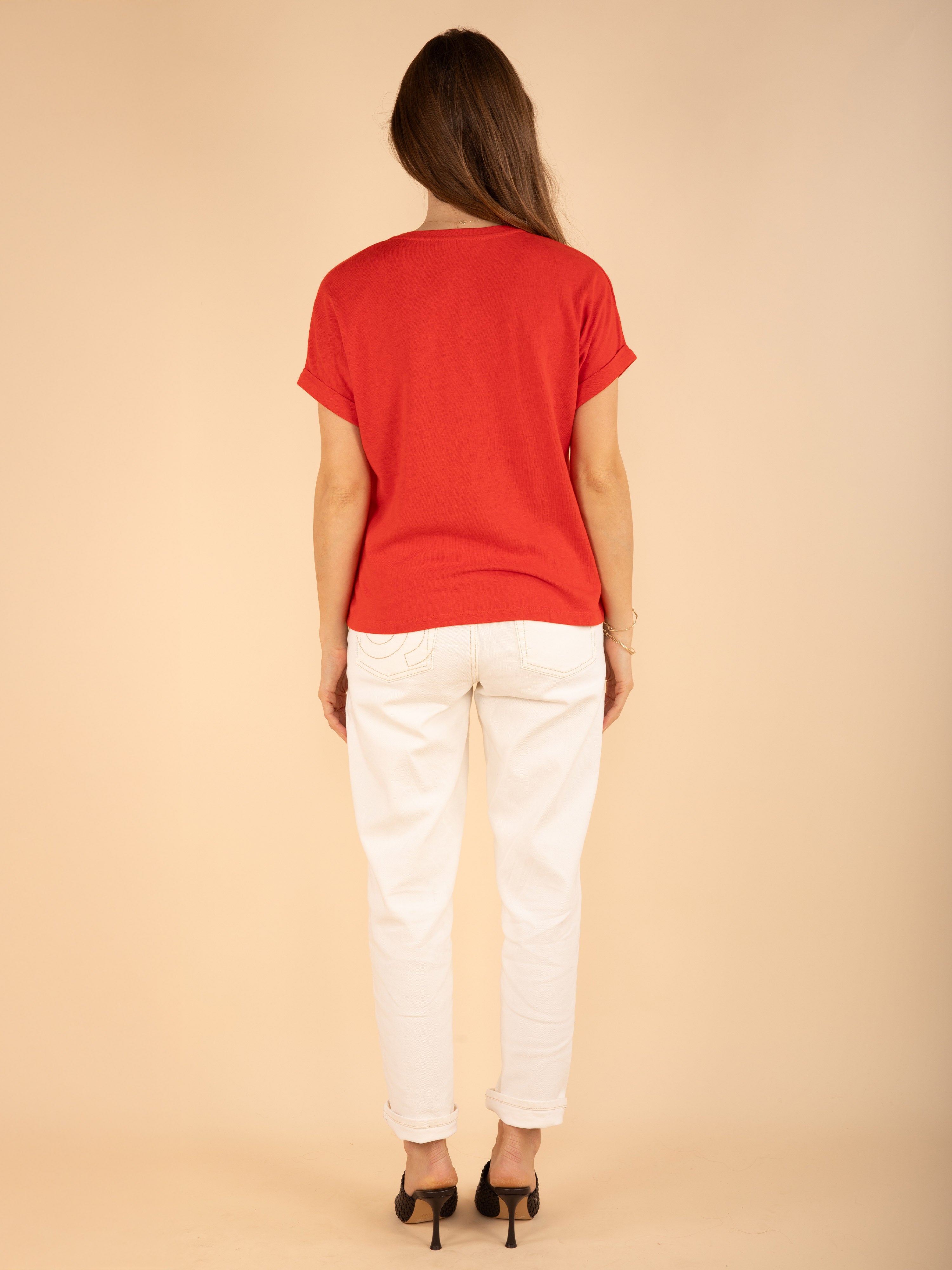 Craquez pour ce t-shirt col V brodé, à manches courtes tombantes et coupe droite, pour un style élégant et décontracté.
