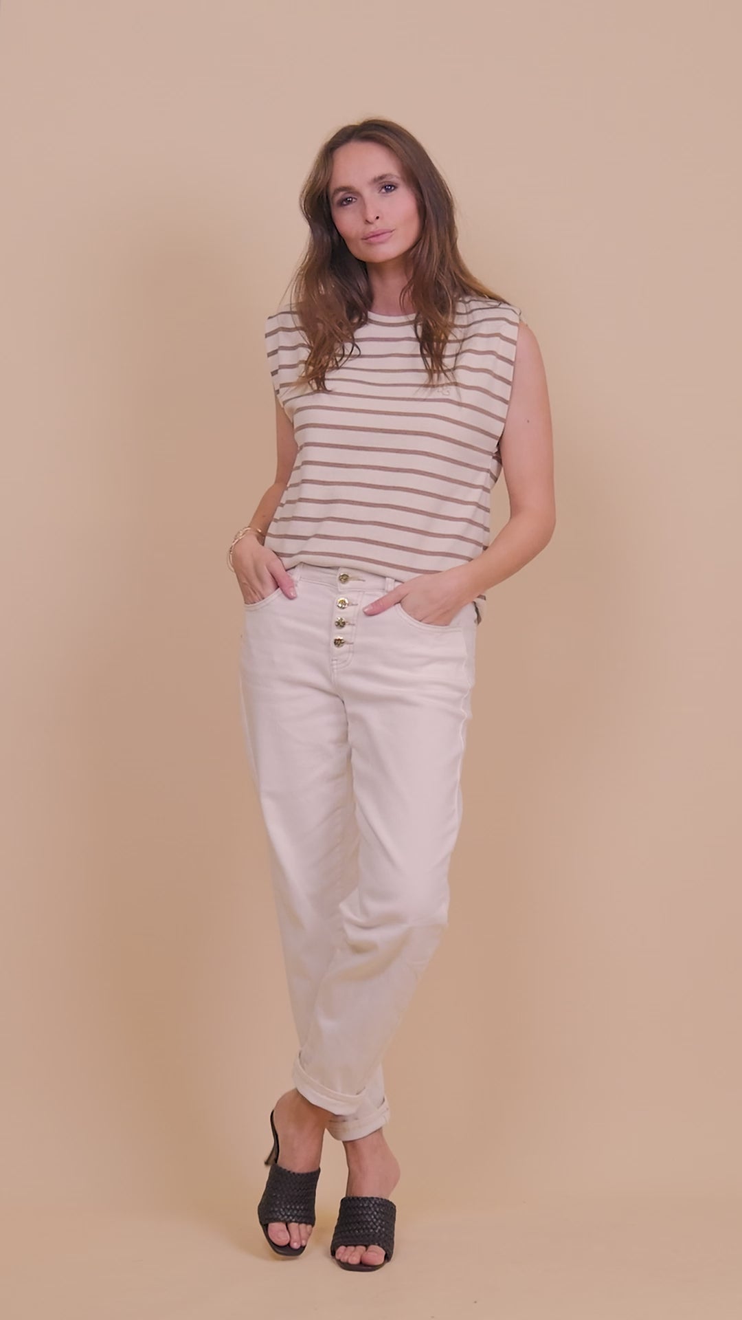 Craquez pour cette marinière sans manches à rayures contrastées, sublimée par son logo scintillant pour un look estival et chic.