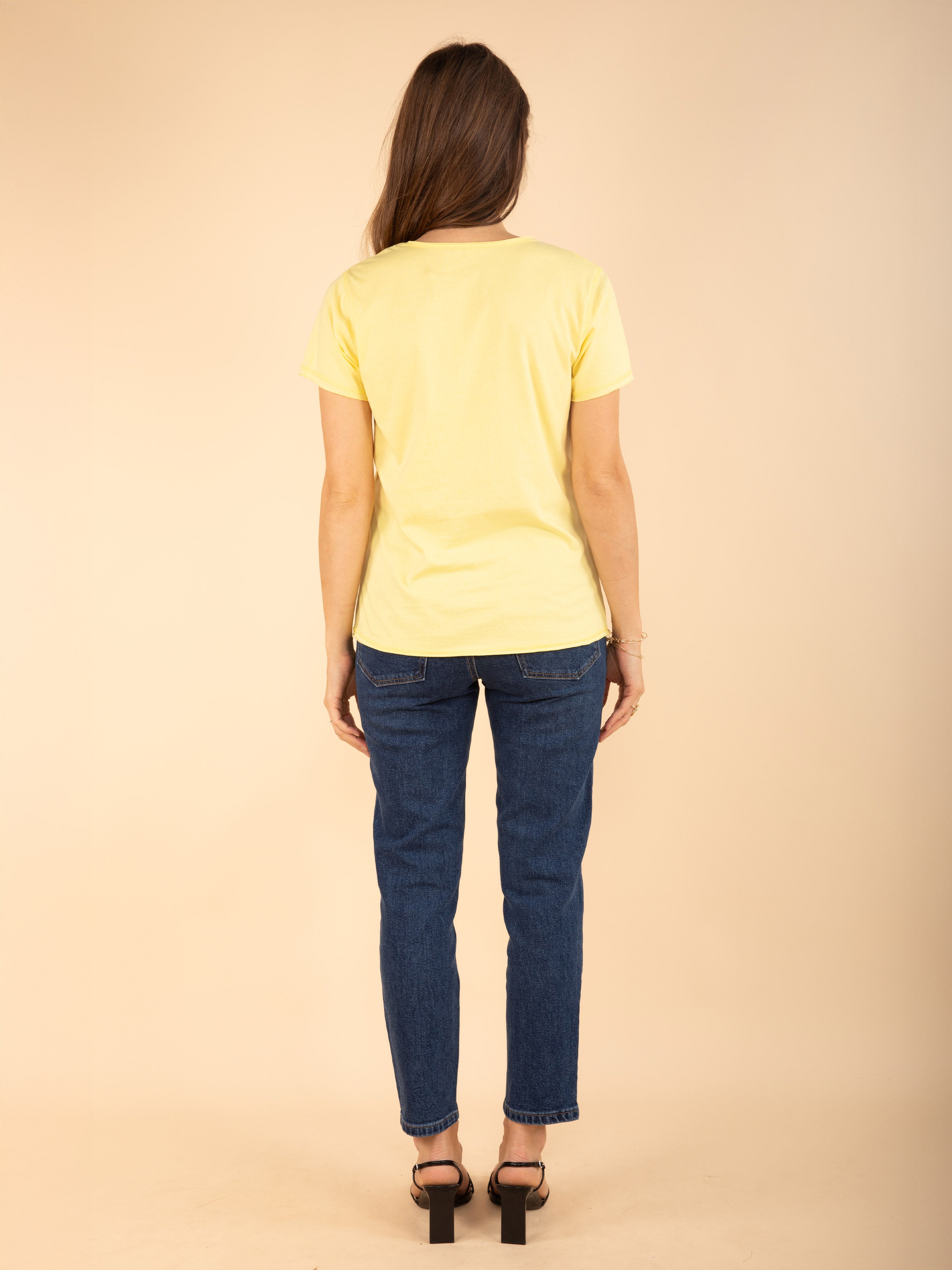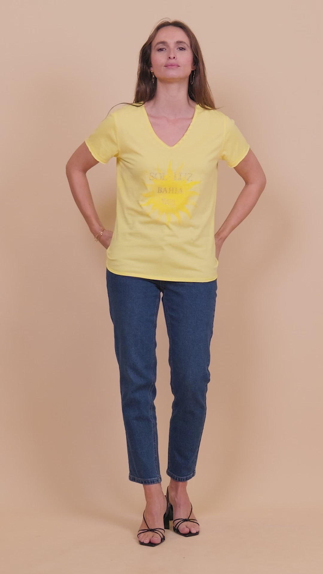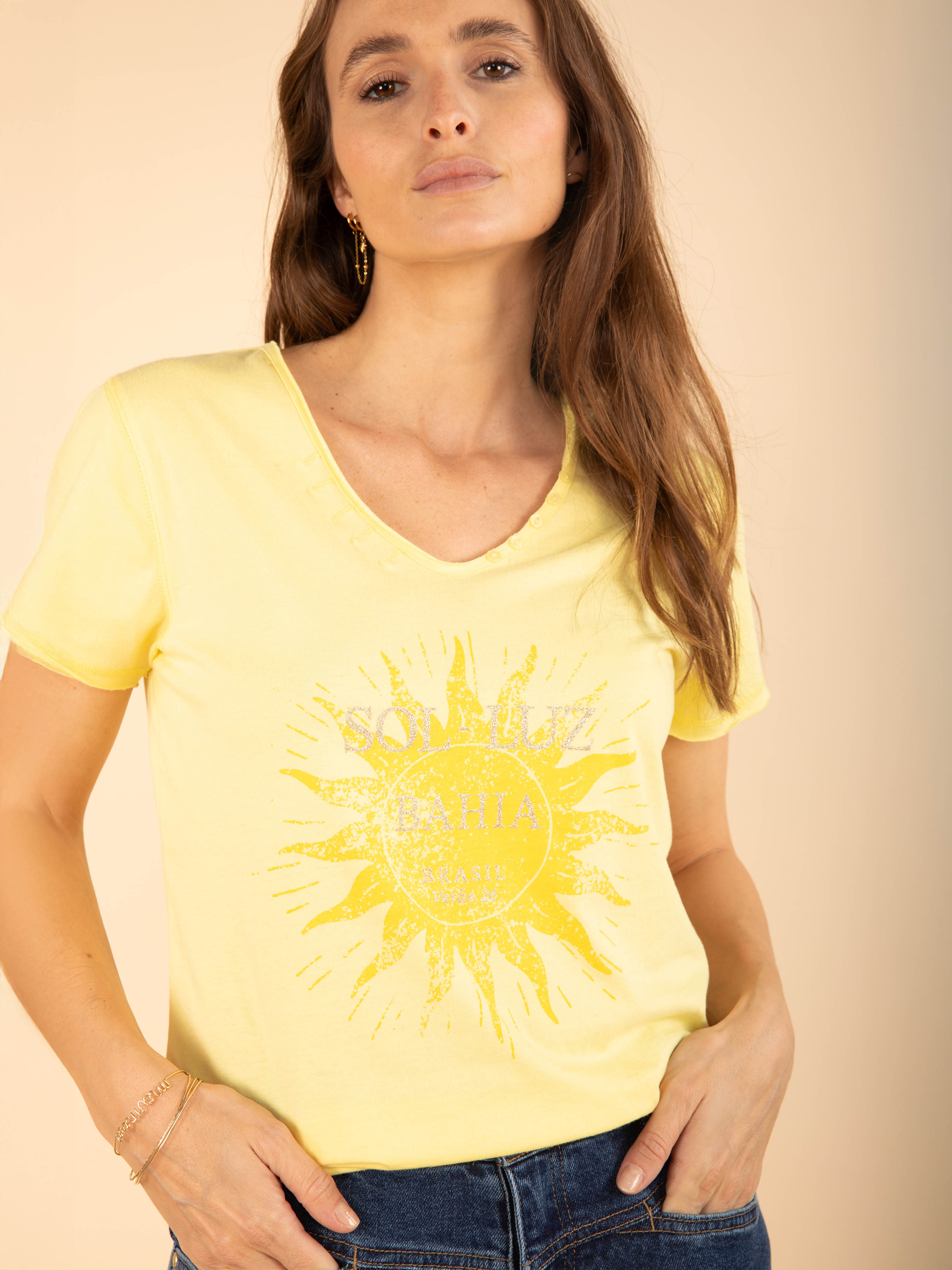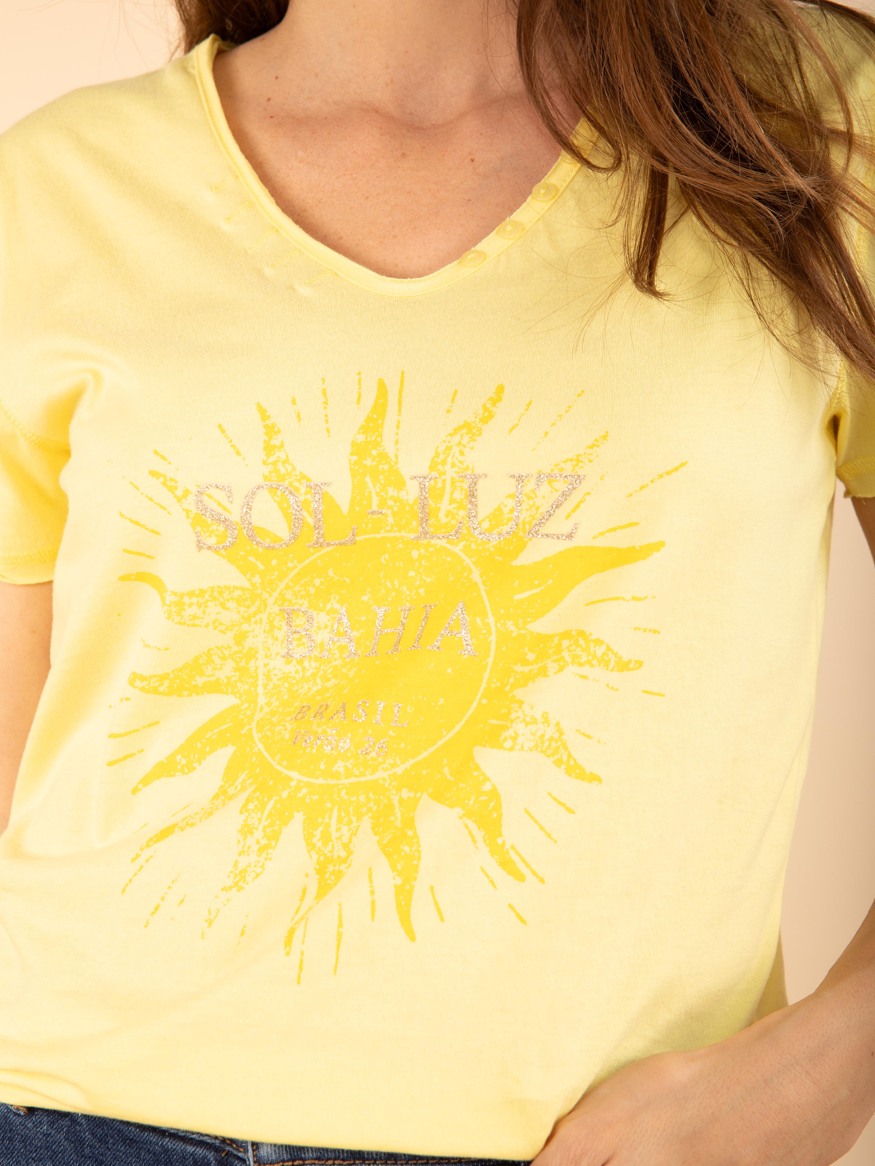 Craquez pour ce t-shirt imprimé brillant, sublimé par son message scintillant et son encolure V à boutons décoratifs pour un look estival et lumineux.