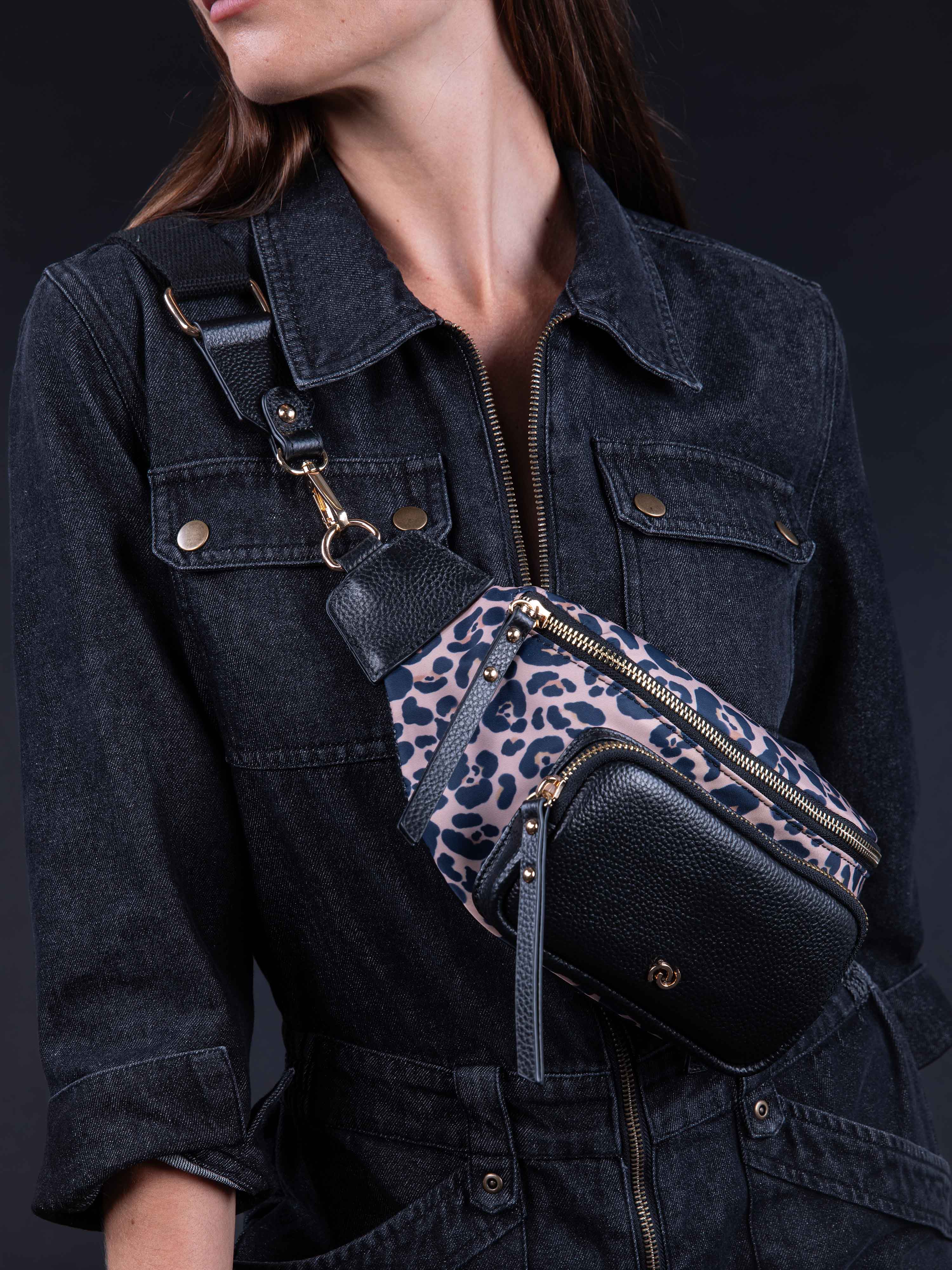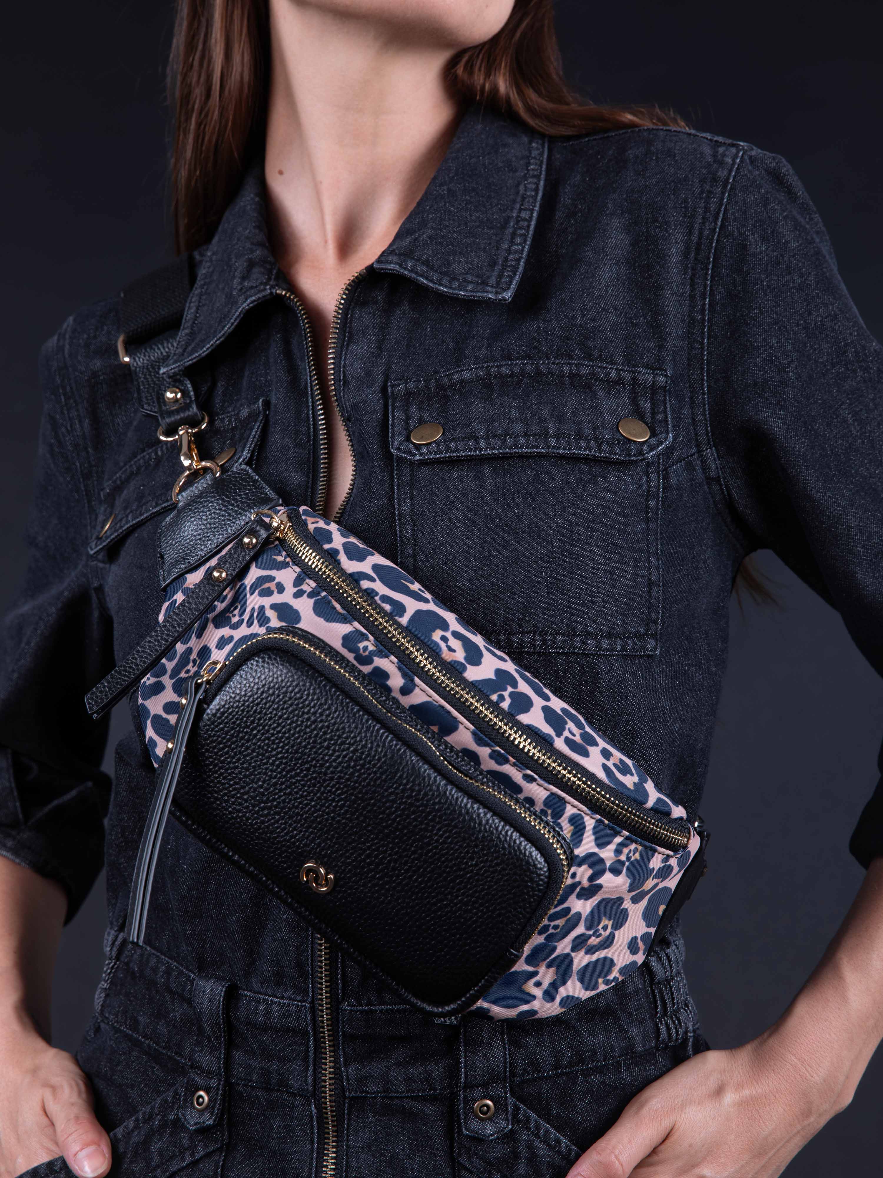 Adoptez la sac banane MARCEL, alliant nylon et cuir pour un look audacieux et pratique, avec multiples poches zippées et anse amovible pour un porté ajustable.