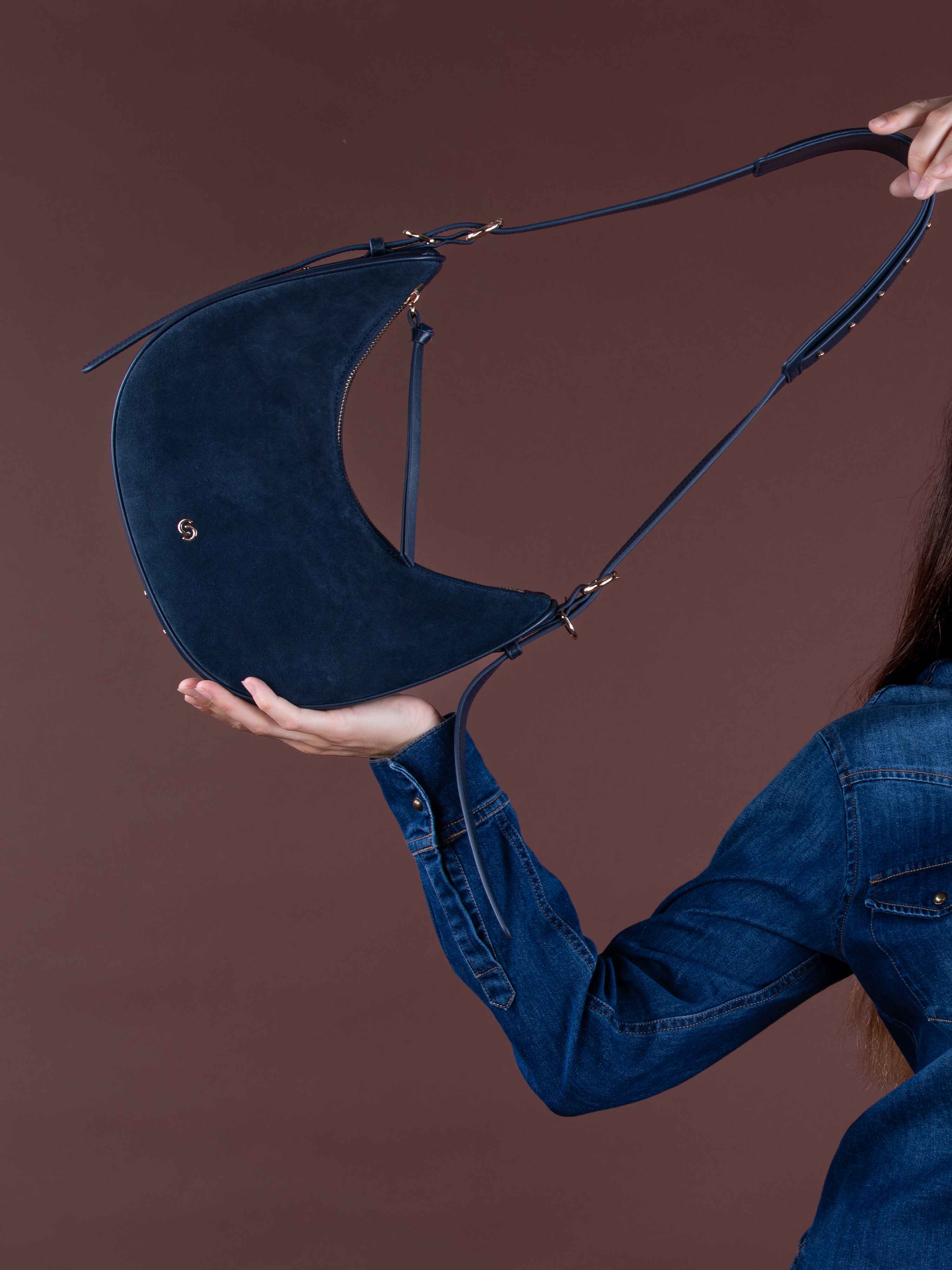 Adoptez le sac demi-lune LUCIEN, alliant daim et cuir avec des studs dorés pour une touche rock chic, pratique avec son anse réglable et sa poche intérieure.