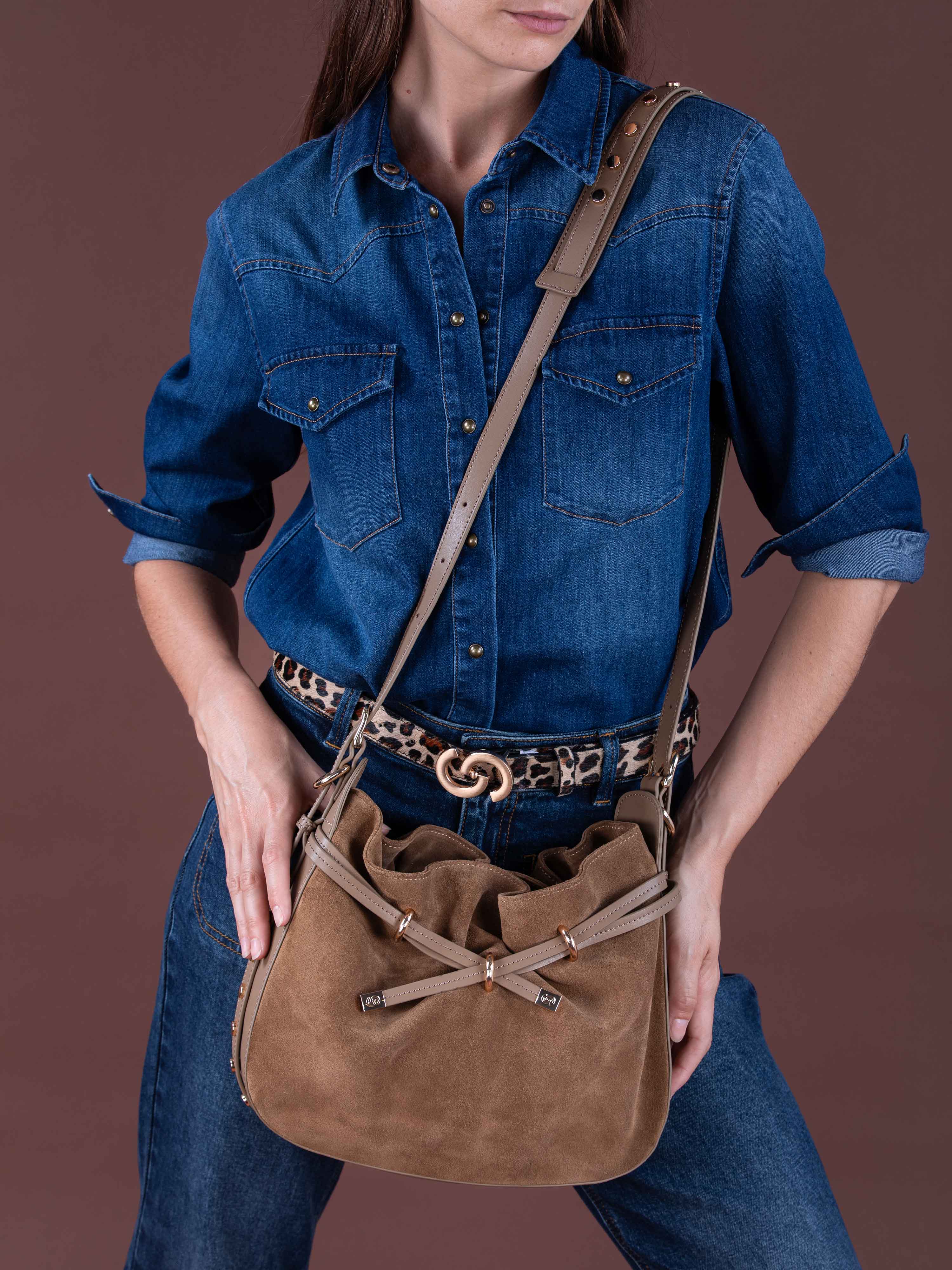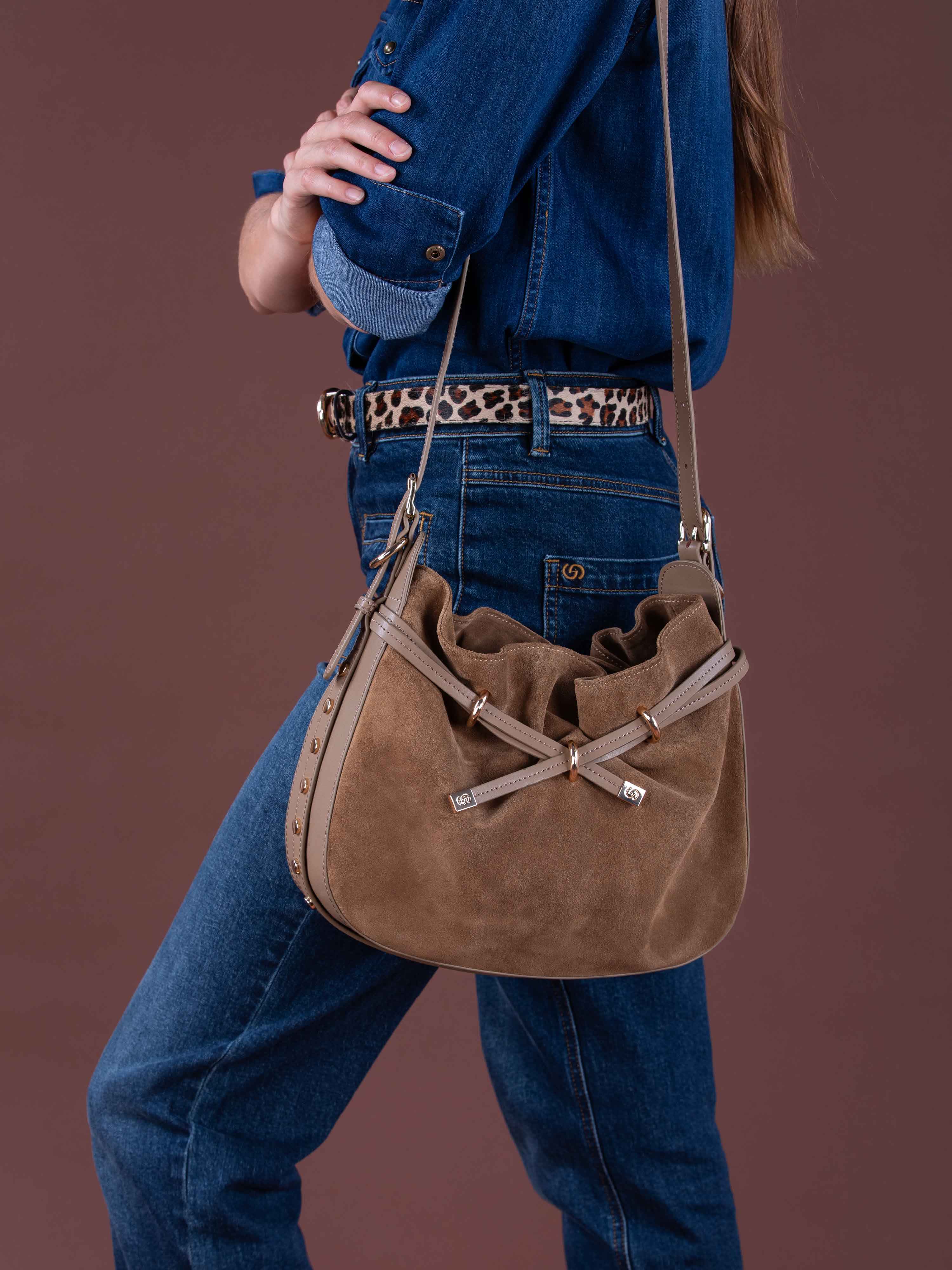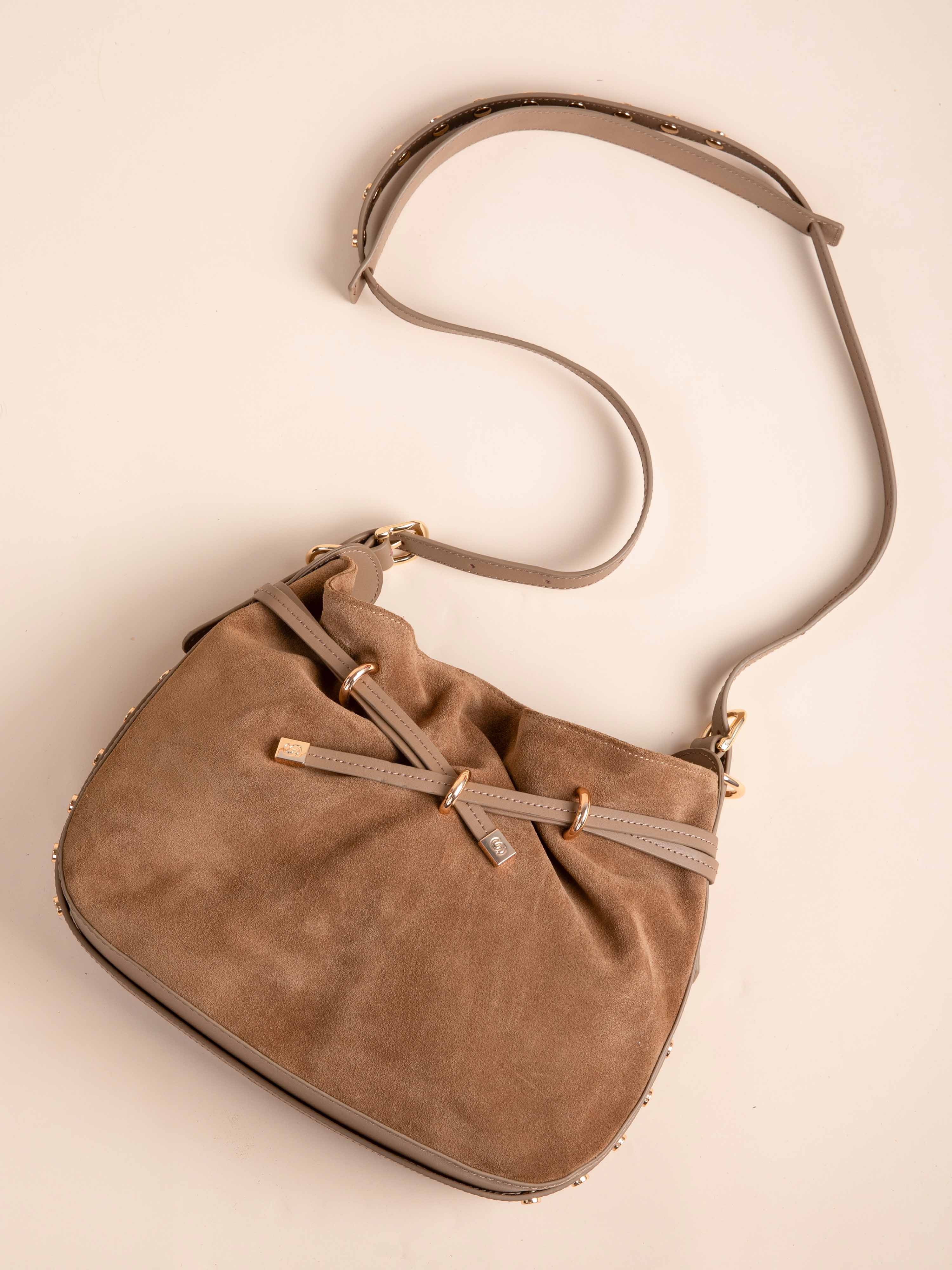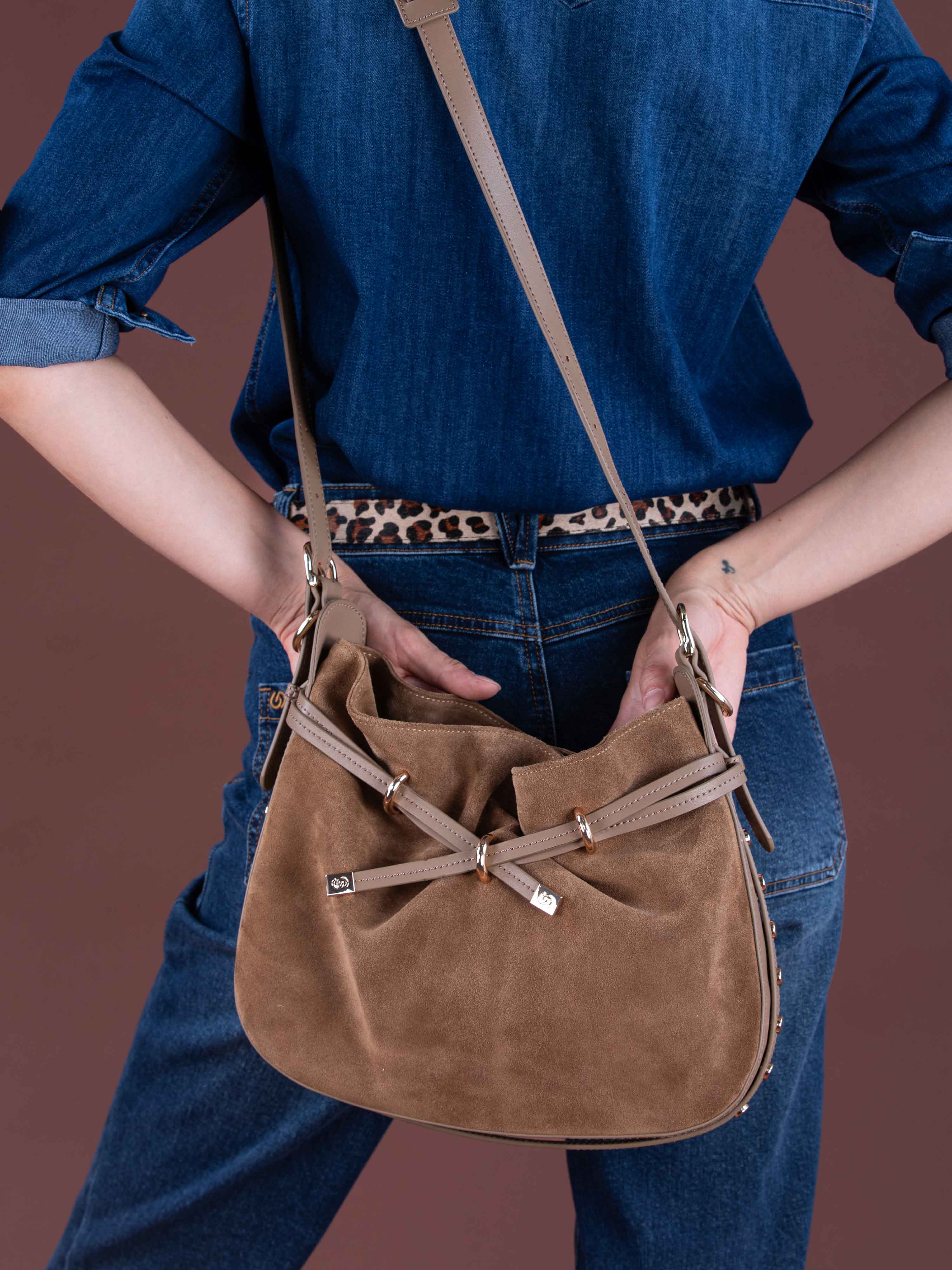 Adoptez le sac seau rigide AUGUSTIN, élégance assurée avec son daim et cuir, agrémenté de studs dorés pour un style raffiné et contemporain.