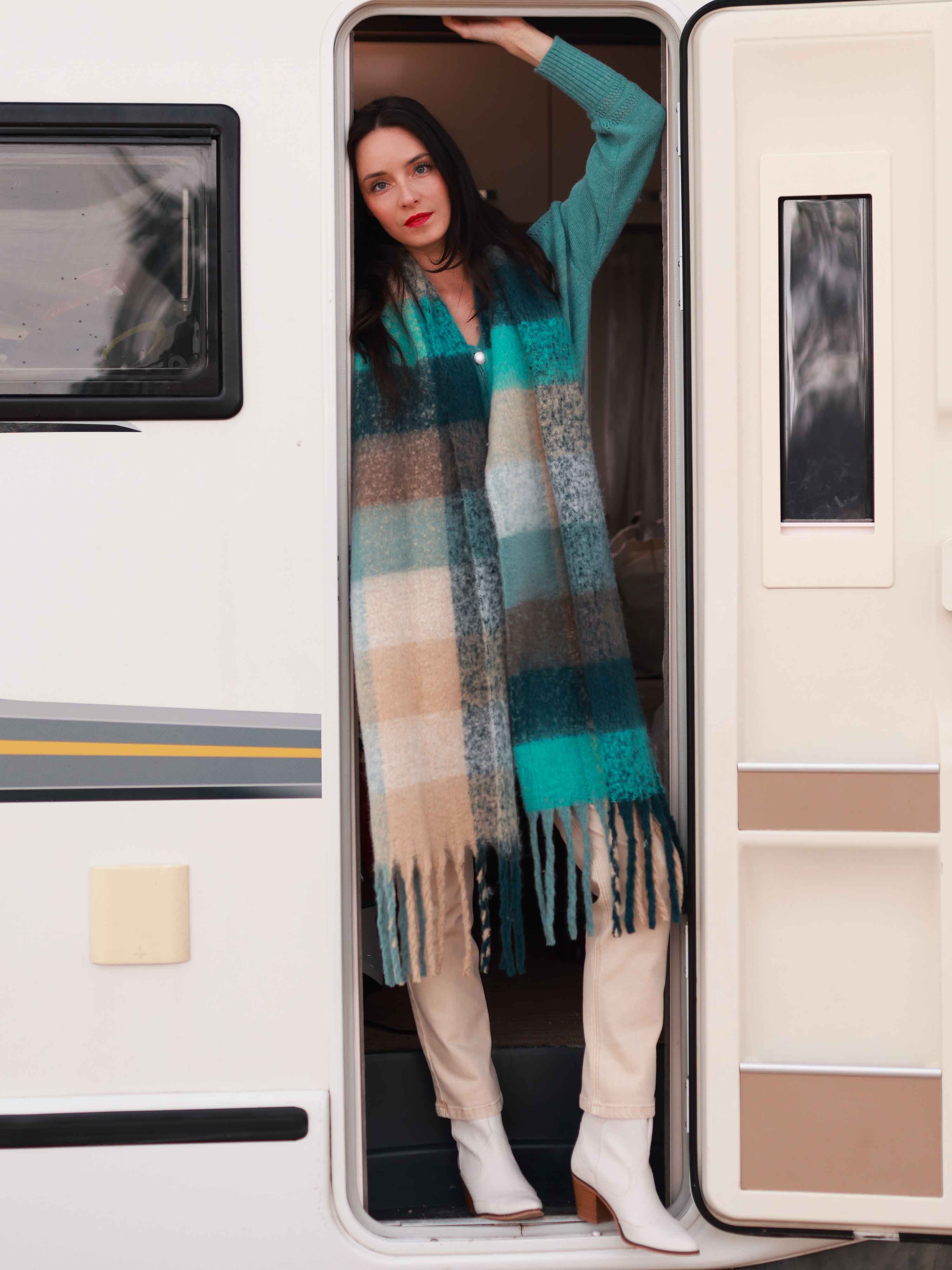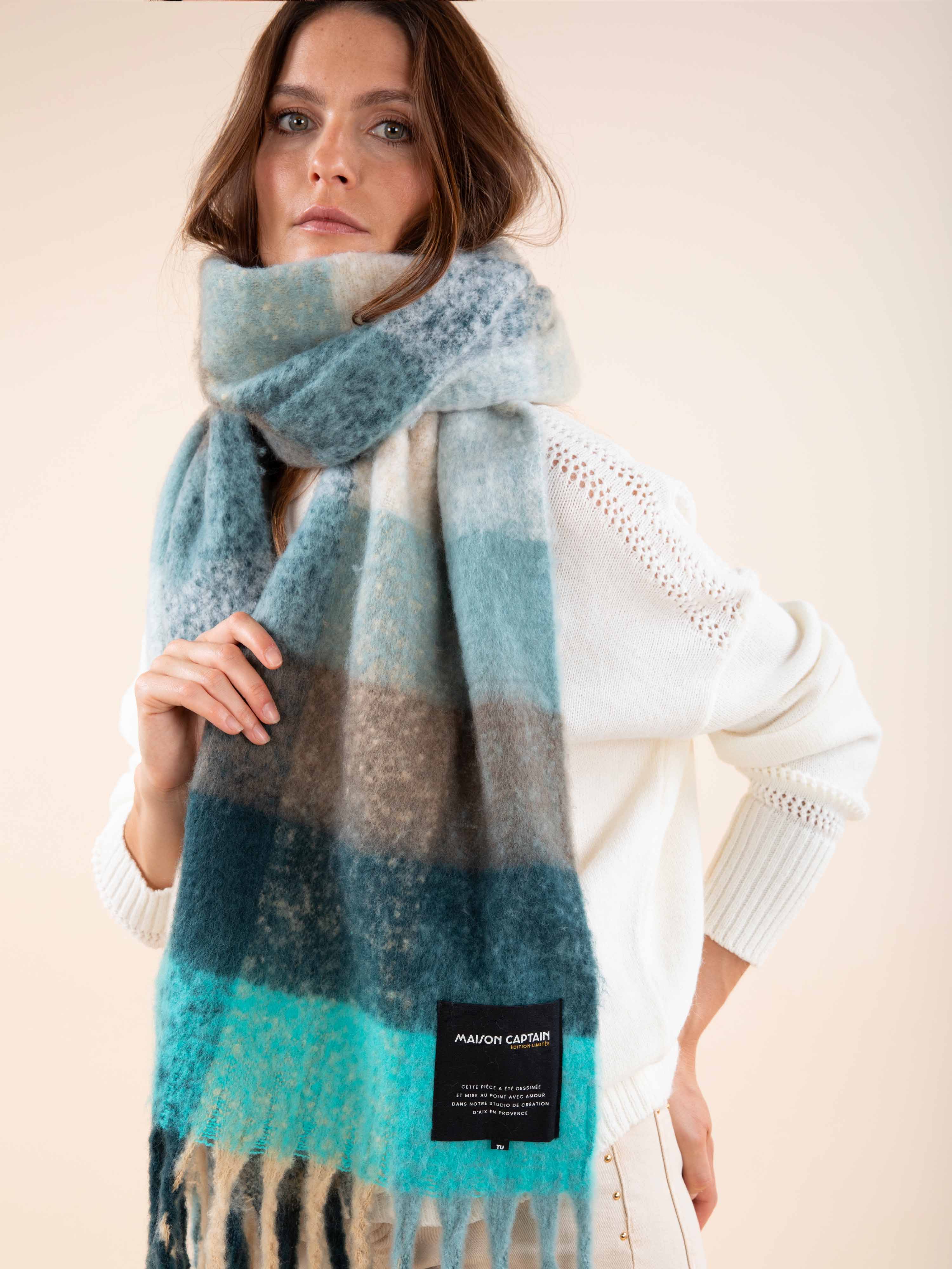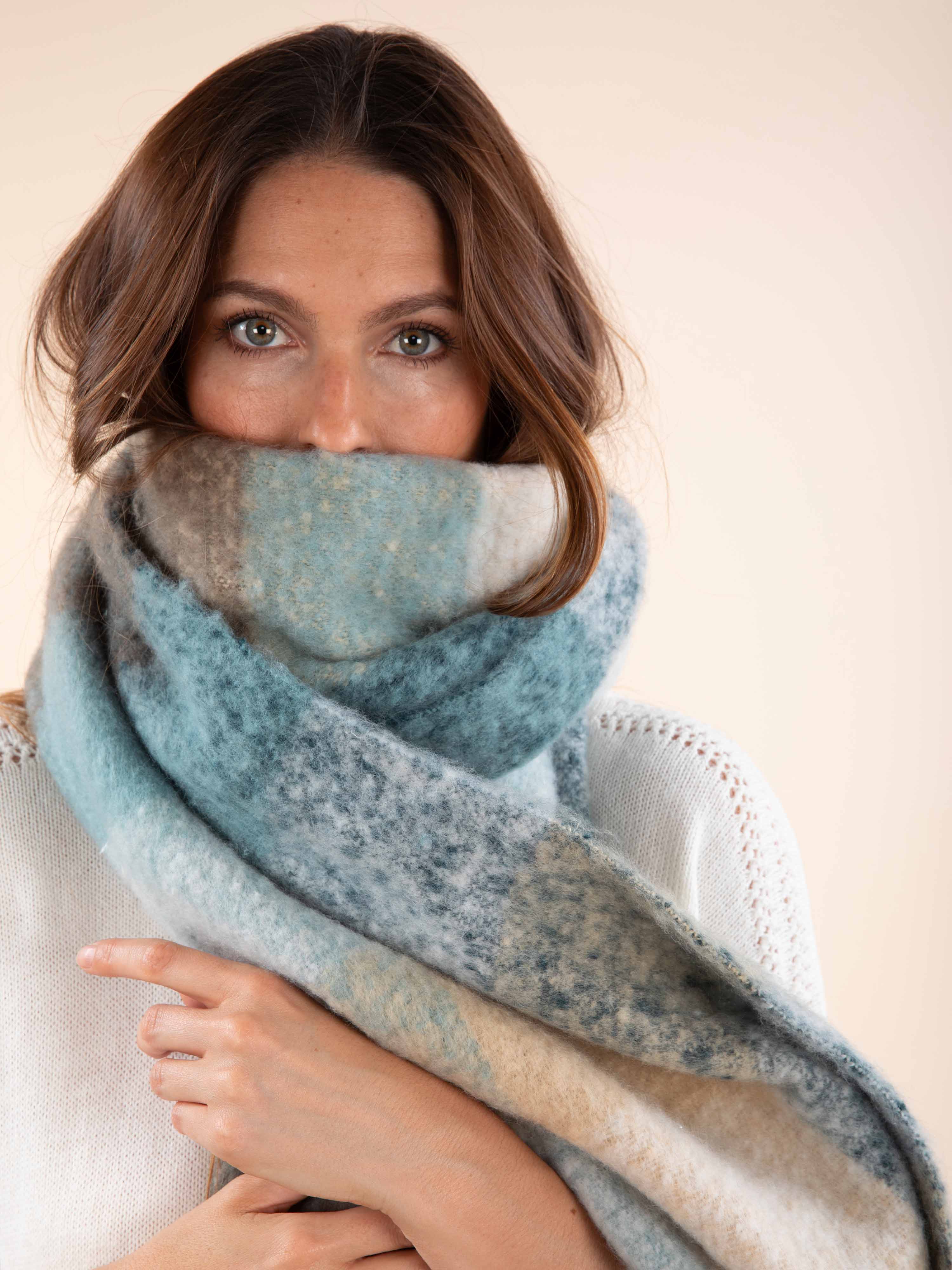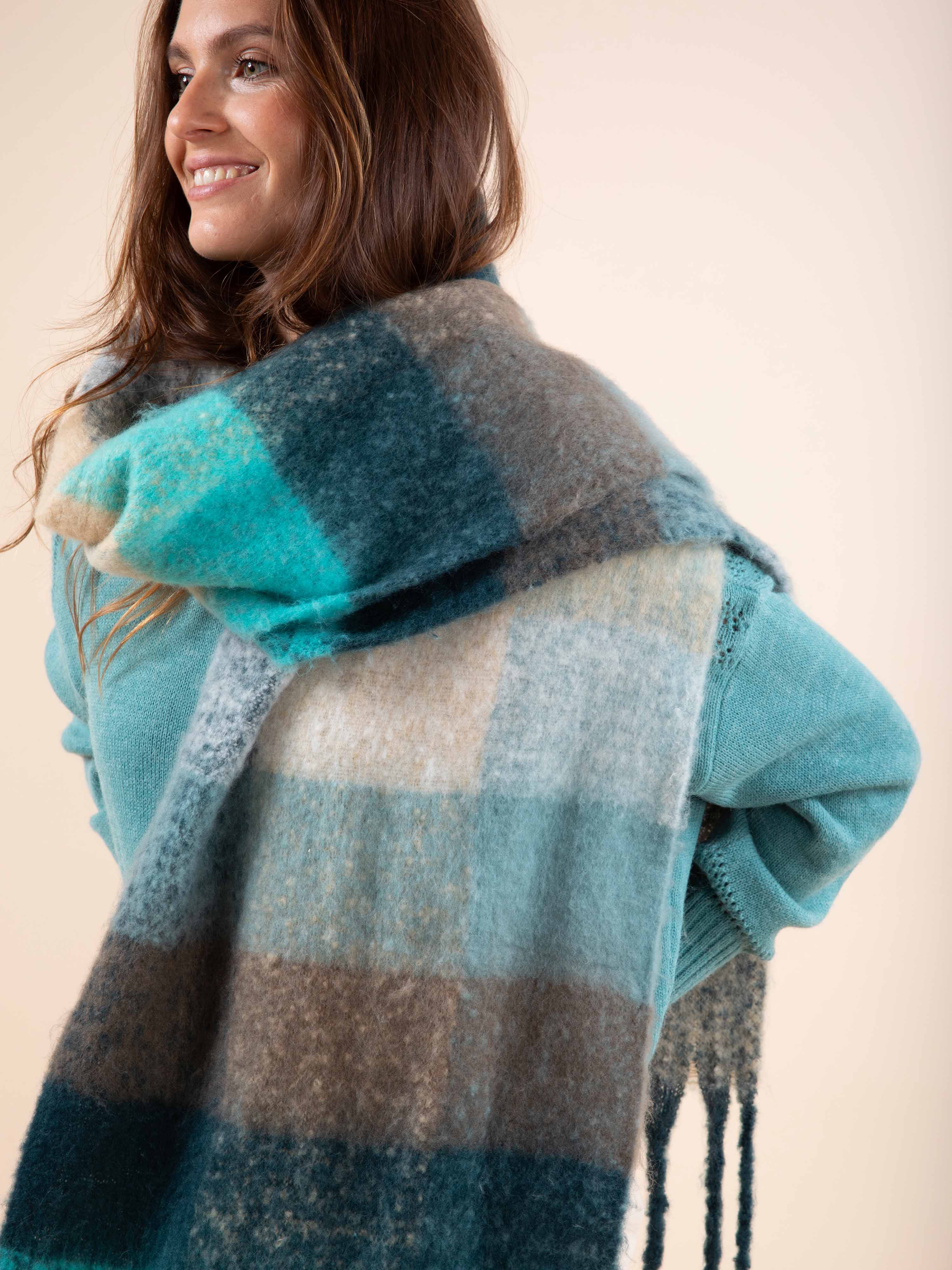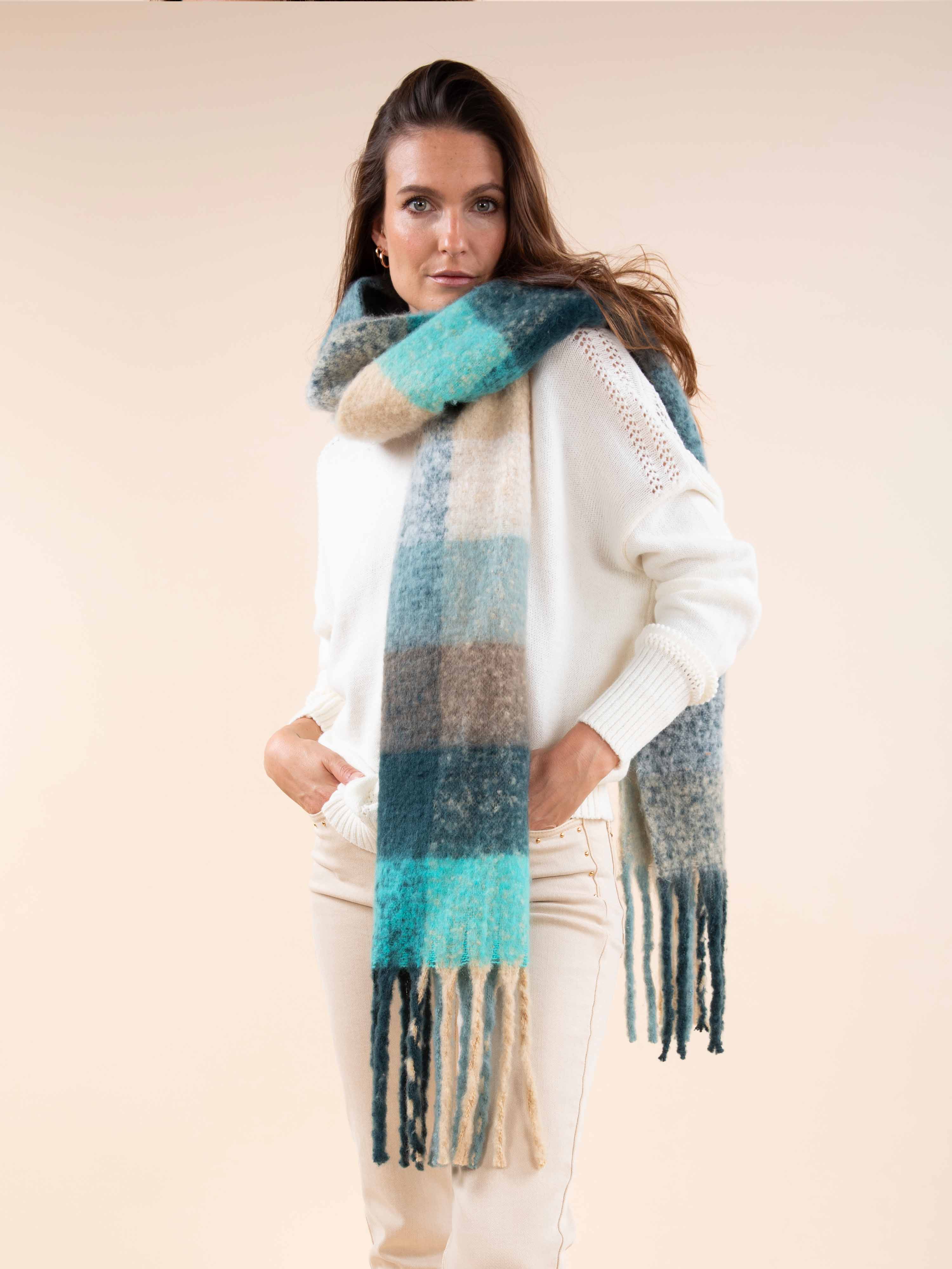 Enveloppez-vous de douceur avec cette écharpe à carreaux et ses franges, parfaite pour réchauffer vos looks d'hiver avec style.